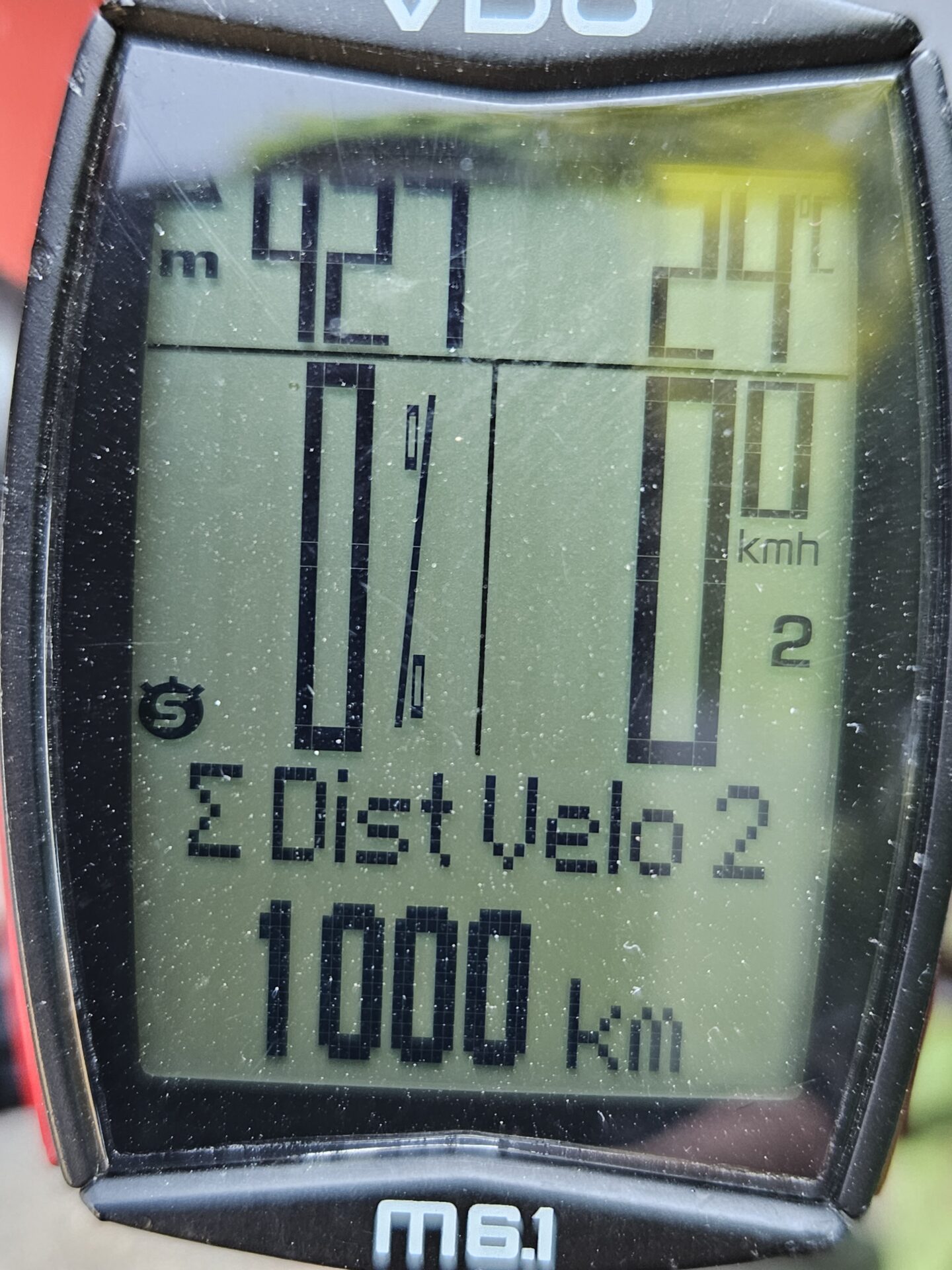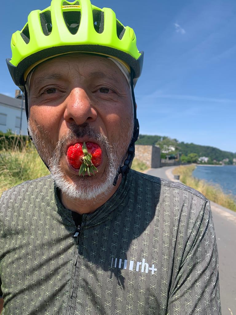 En chemin, nous passons les 1000 km, nous avons fait un peu moins du tiers du trajet. Pour fêter ça, nous achetons des fraises d’un producteur local. Apparemment, je me précipite un peu dessus …