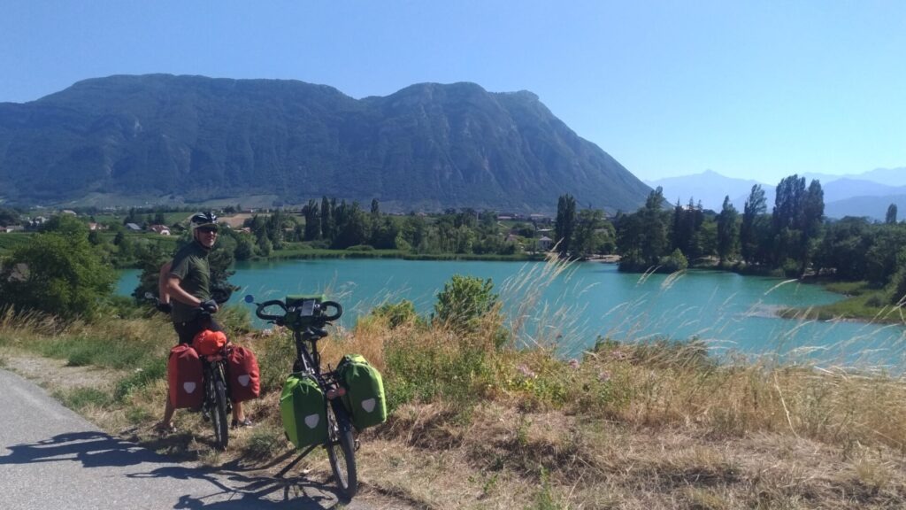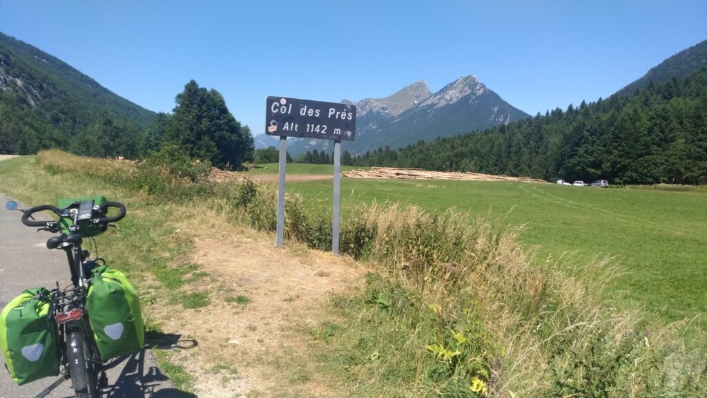 Notre départ a été retardé de quelques jours car nous avons attrapé le Covid, 2 et 3 semaines avant le départ. La veille de la date prévue, la montée des escaliers était encore une épreuve. 3 jours après on décide de partir et de juger en cours de route si notre forme est suffisante. Finalement la forme est revenue, heureusement car notre première étape est bien plus longue que prévue. Lorsque nous prévenons le camping d’Aillon, 2h avant notre arrivée, on nous signale que la carte d’adhérent à un club de camping est obligatoire. Ils avaient juste oublié de le préciser quand nous avions réservé la veille. Très peu de gites ou d’hôtel dans le massif des Bauges, on atterrit finalement au Chatelard où une place se libère dans un gite. Cela nous fait une journée de 80 km et 1351m de dénivelée, alors qu’on avait décidé de démarrer doucement !