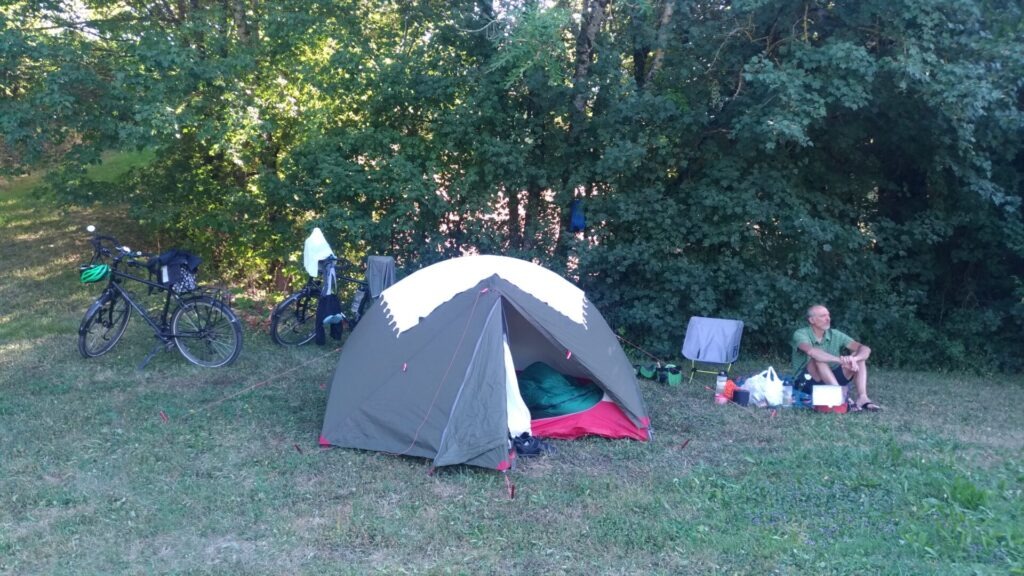 Le bivouac est top, on a même dégotté un point d’eau avec un WC municipal juste à côté, le grand luxe ! Le matériel à l’air ok, pour l’instant pas de fausse note. Je m’interroge toujours sur l’utilité d’une chaise, Doum en a acheté une, je m’en passe, mais quand elle rentre sous la tente, je la lui pique.