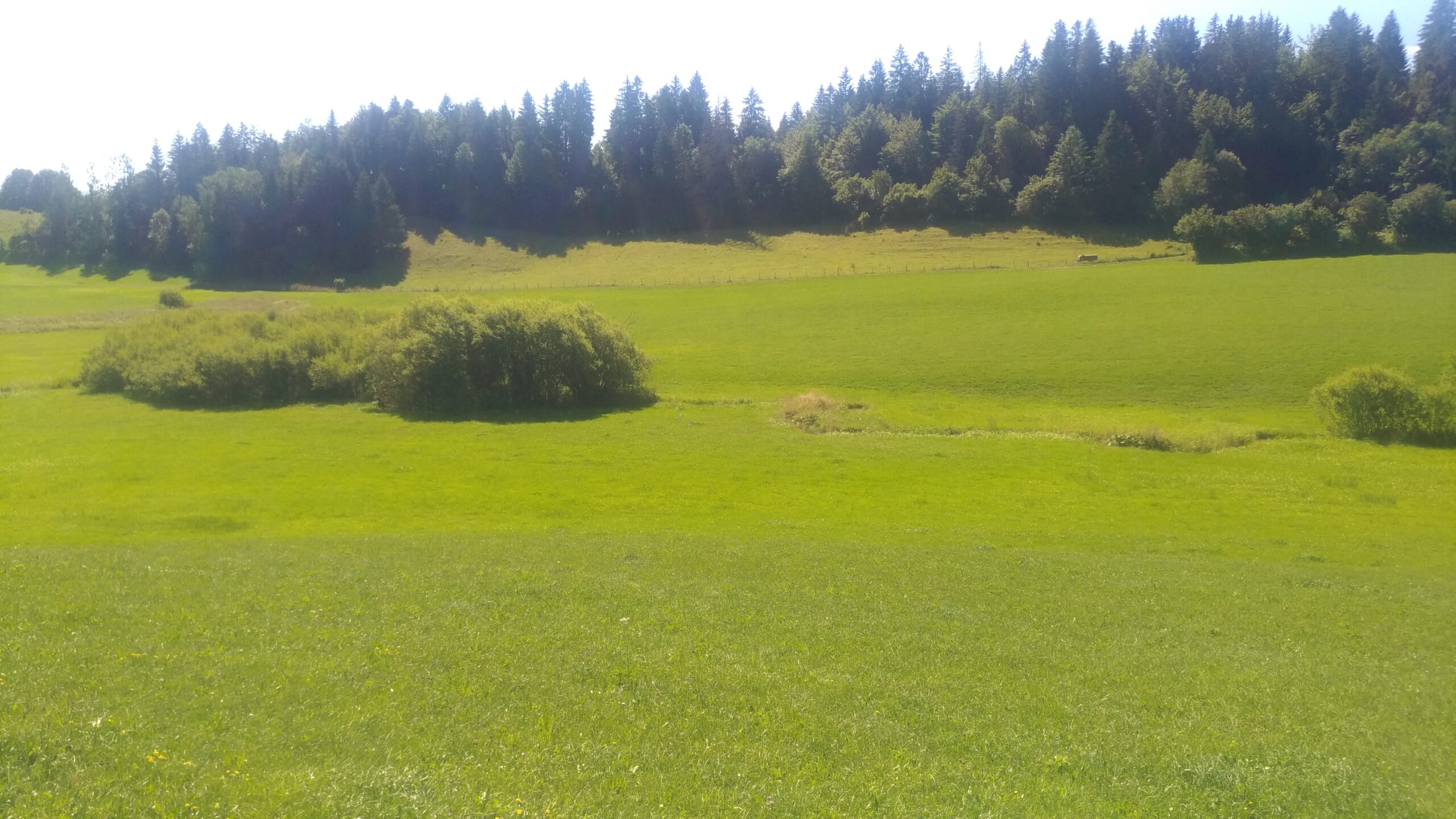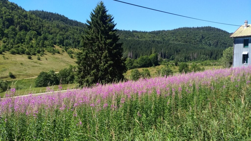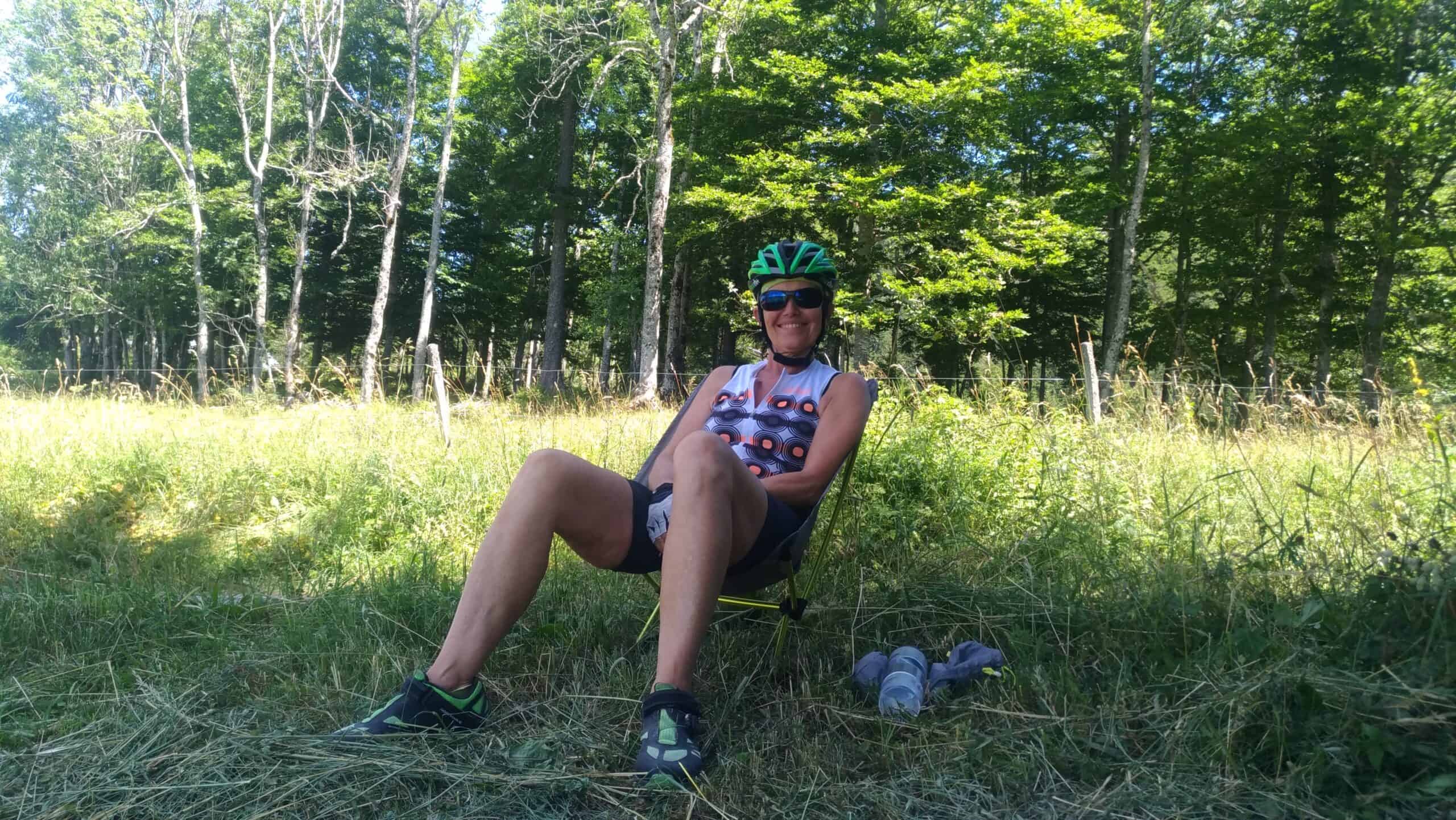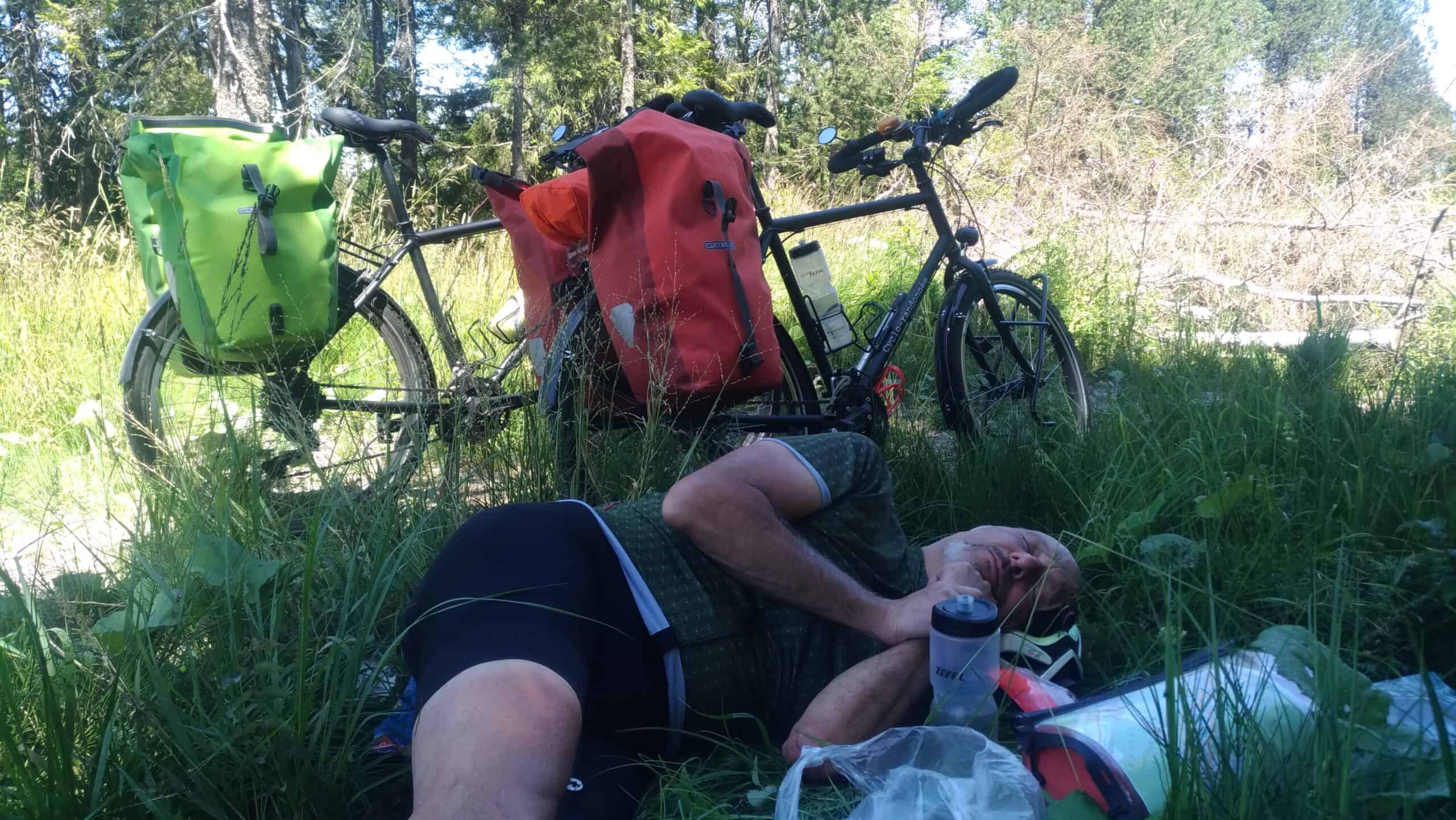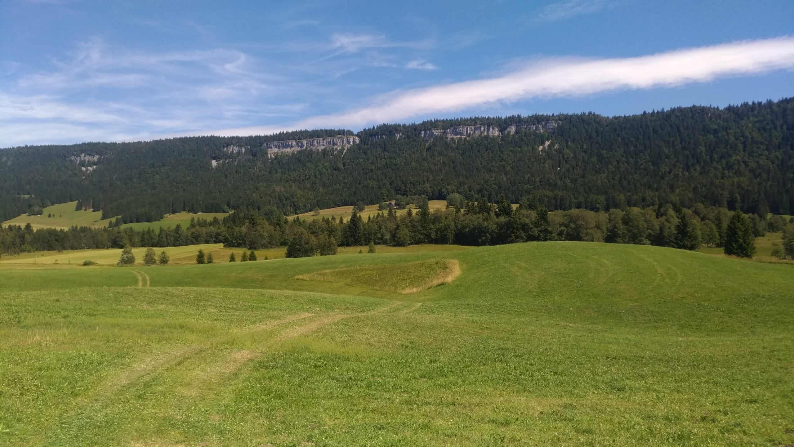 On est en plein dans la canicule, la chaleur devient dure à supporter même sur les hauts plateaux du Jura. Aussi on essaye de partir tôt le matin et on roule jusqu’en début d’après midi. On se cherche un coin à l’ombre pour manger et buller en attendant que la température baisse un peu. Les distances quotidiennes diminuent pas mal. Mais pas possible de faire de la dénivelée par plus de 35° quand il n’y a pas d’ombre.
