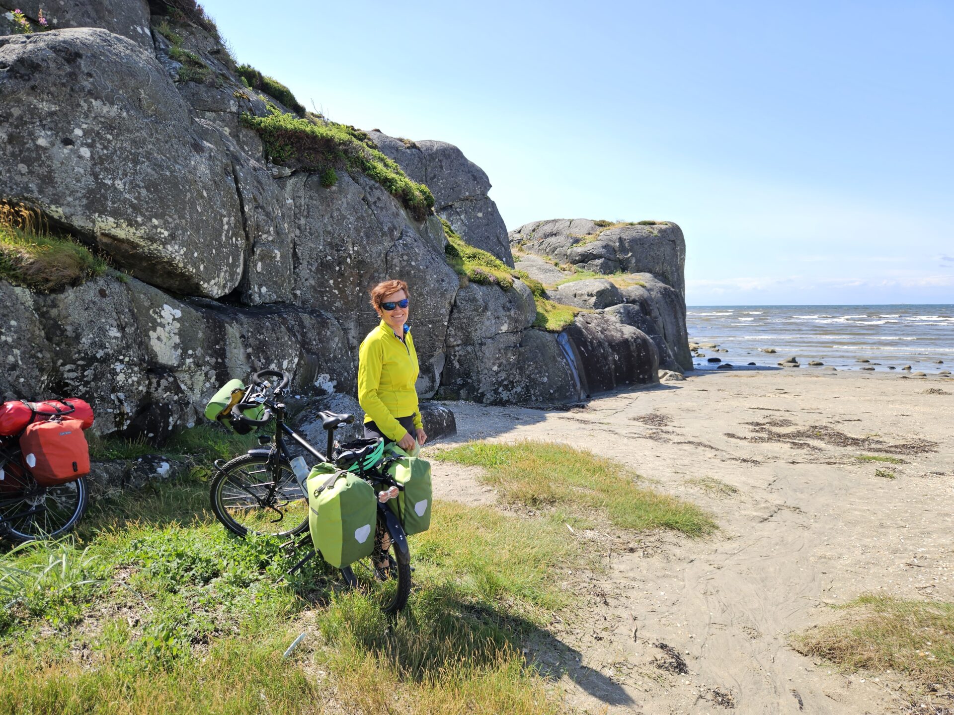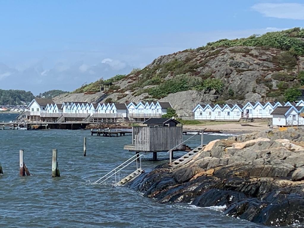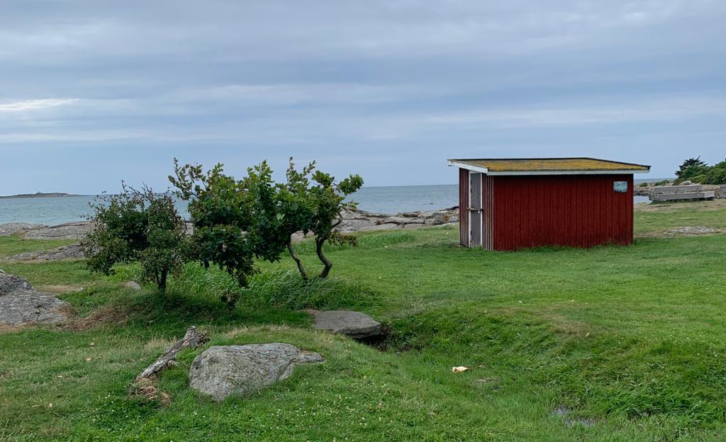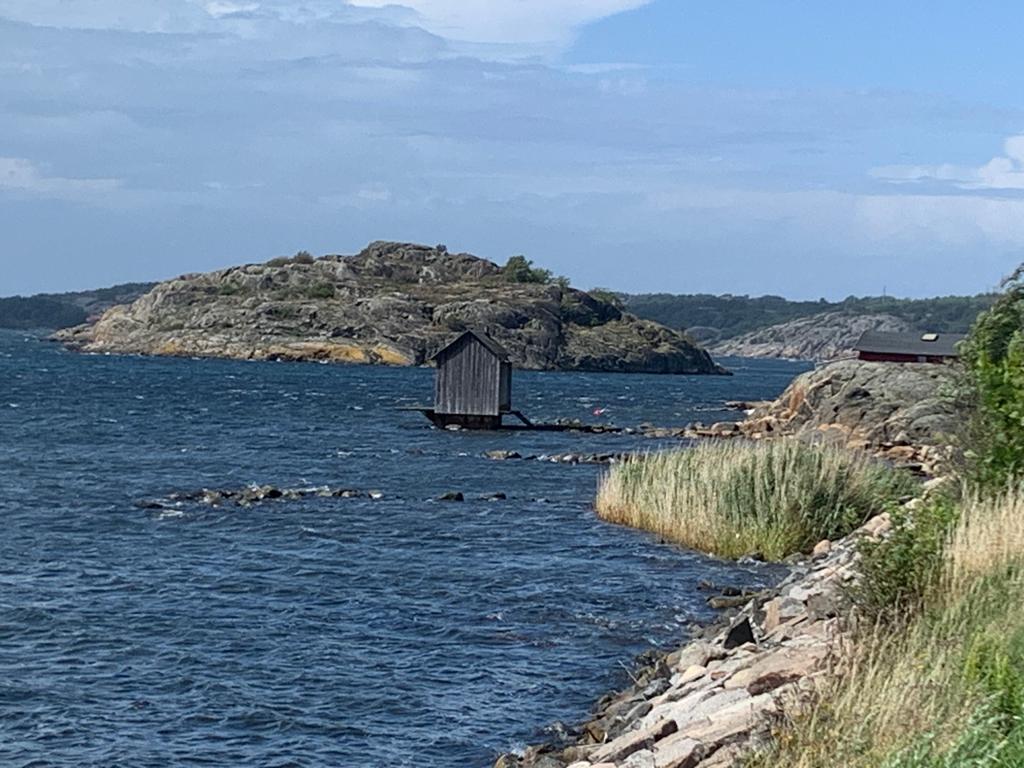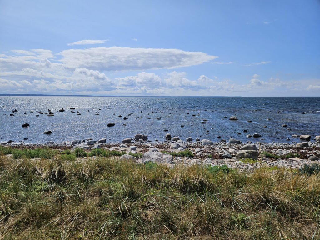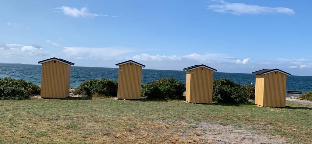 Pour le deuxième jour en Suède, nous avons droit à un petit crachin breton, et après midi, un bon soleil, même si la température reste modérée. La côte est vraiment très belle, il y a un peu de monde sur les plages, mais rien à voir avec la foule que l’on connaît chez nous en été. Et toujours le même étonnement, la plupart des vélos garés en bord de plage, n’ont pas de cadenas. Le soir, nous avons pris un petit bungalow dans un camping, car la météo reste menaçante. Je fais ma première baignade dans la mer, à ma grande surprise, elle n’est pas plus froide que l’Atlantique. Je reste un bon moment à jouer dans les vagues, sans problème. La seule chose qui diffère, c’est la couleur, elle est marron rouge et opaque, alors que de loin, c’est bien le bleu qui domine.