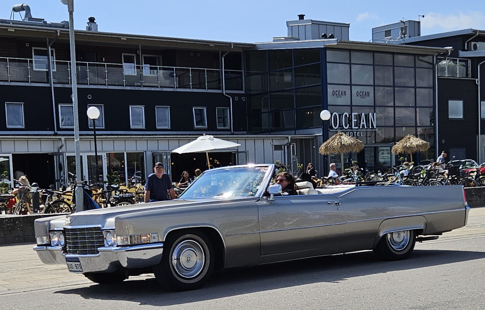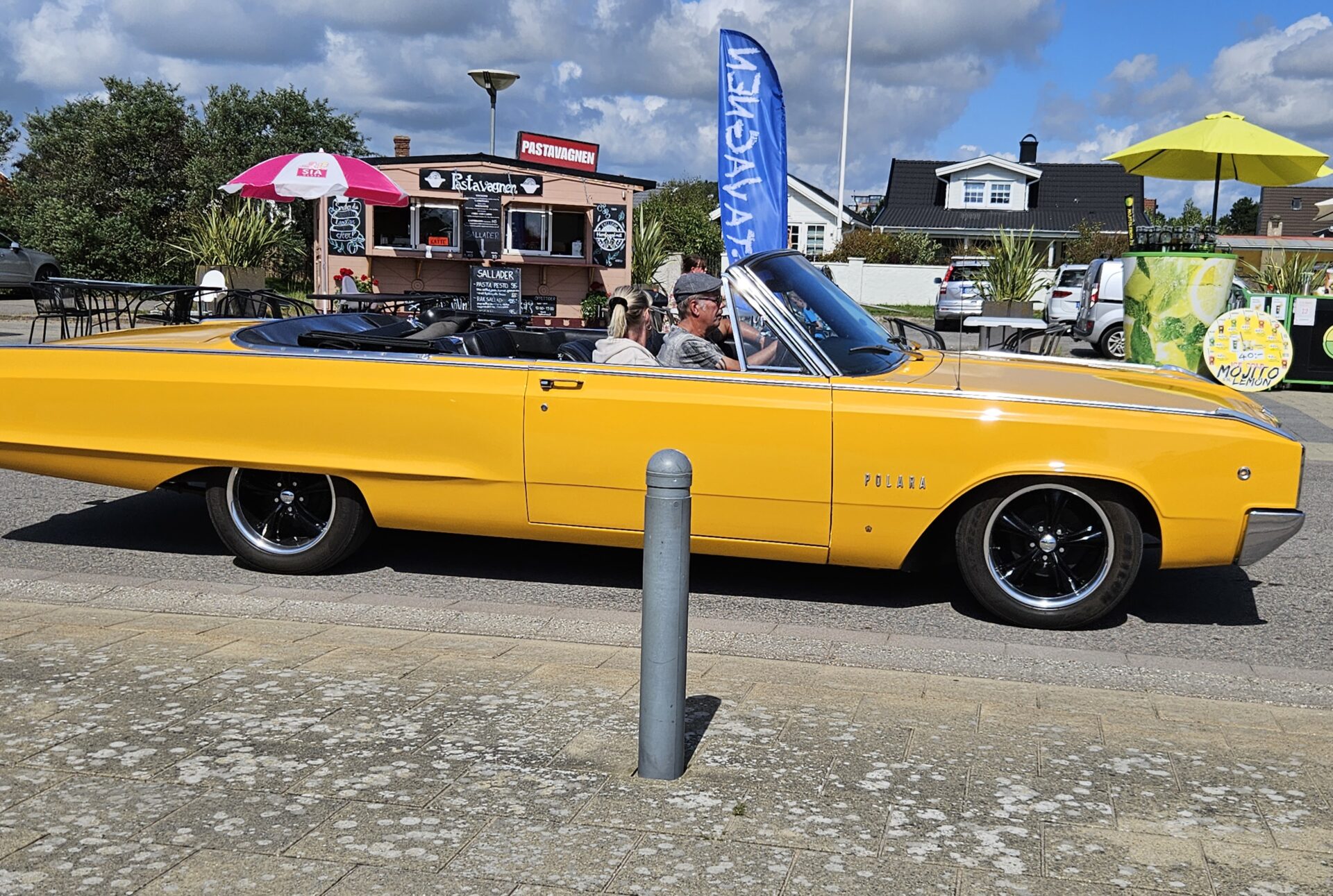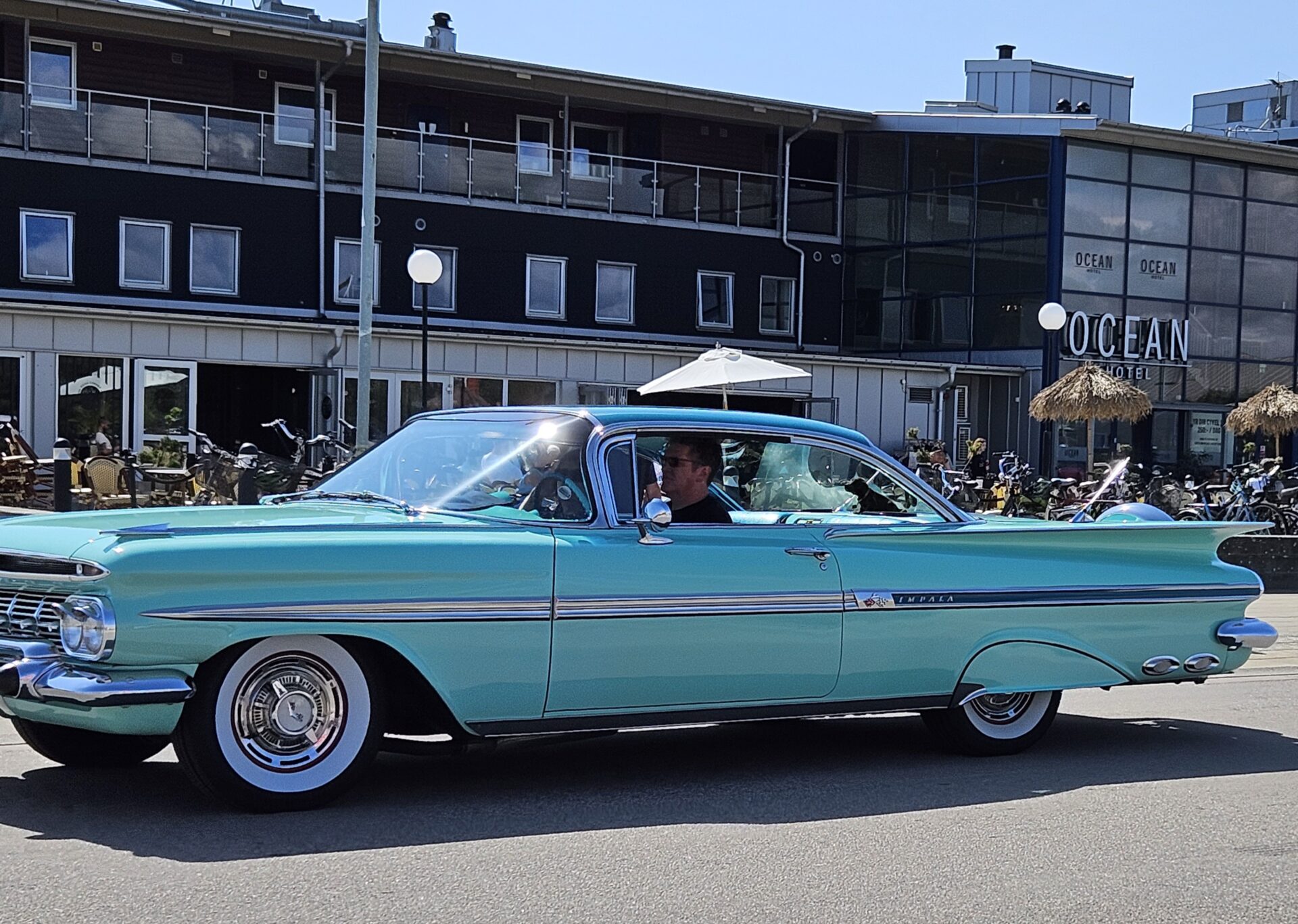 Nous commençons à croiser de nombreux voyageurs à vélo qui suivent comme nous le Kattegattleden, la piste cyclable qui relie Helsingborg à Göteborg. Le Kattegatt étant l’espace maritime entre le Danemark et la Suède. Ce n’est pas étonnant, cette côte est vraiment superbe. Nous passons à Falkenberg où des dizaines de vieilles voitures américaines paradent sur le bord de mer. Les voitures sont une attraction, mais la trombine de certains des occupants n’est pas mal non plus.