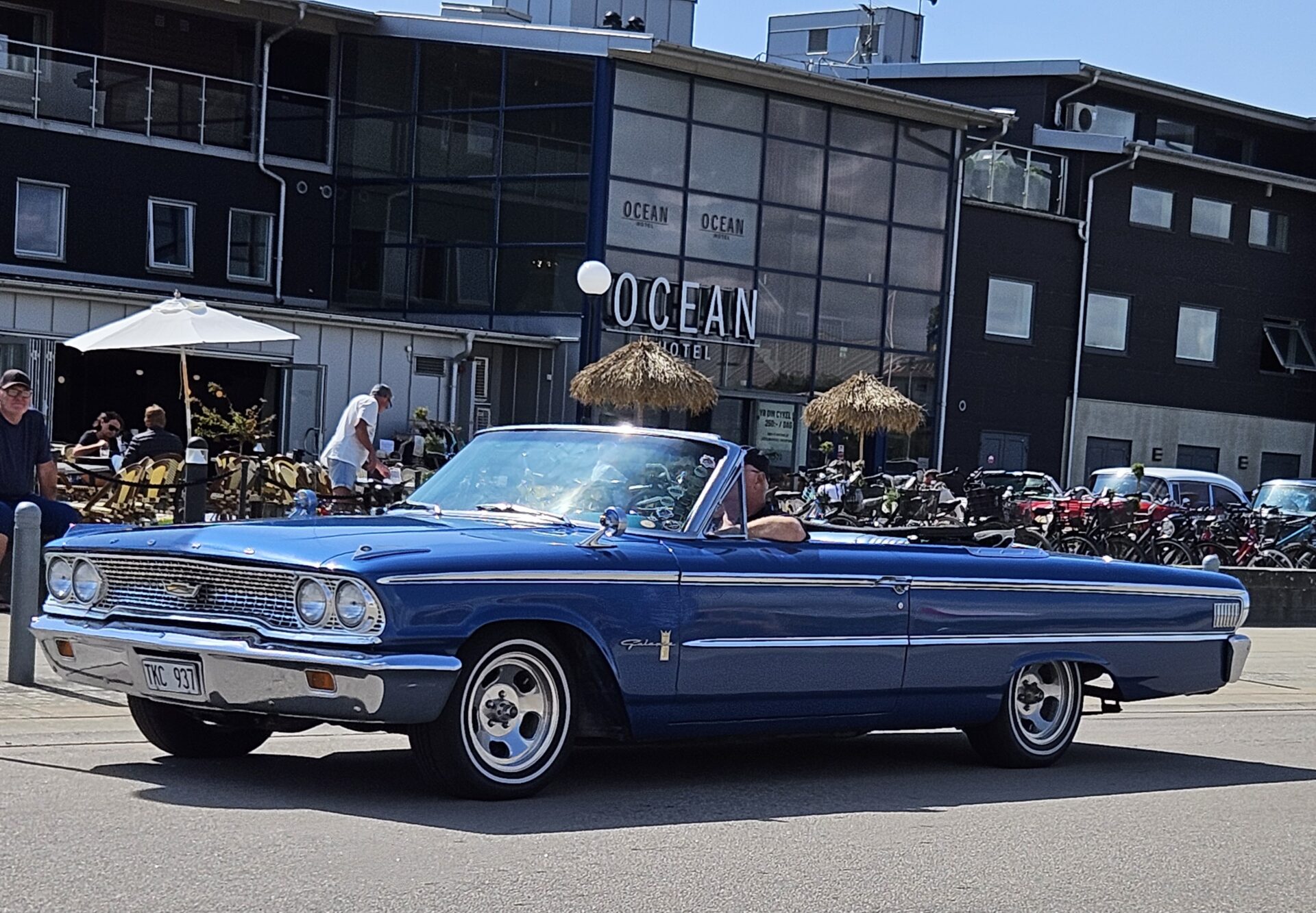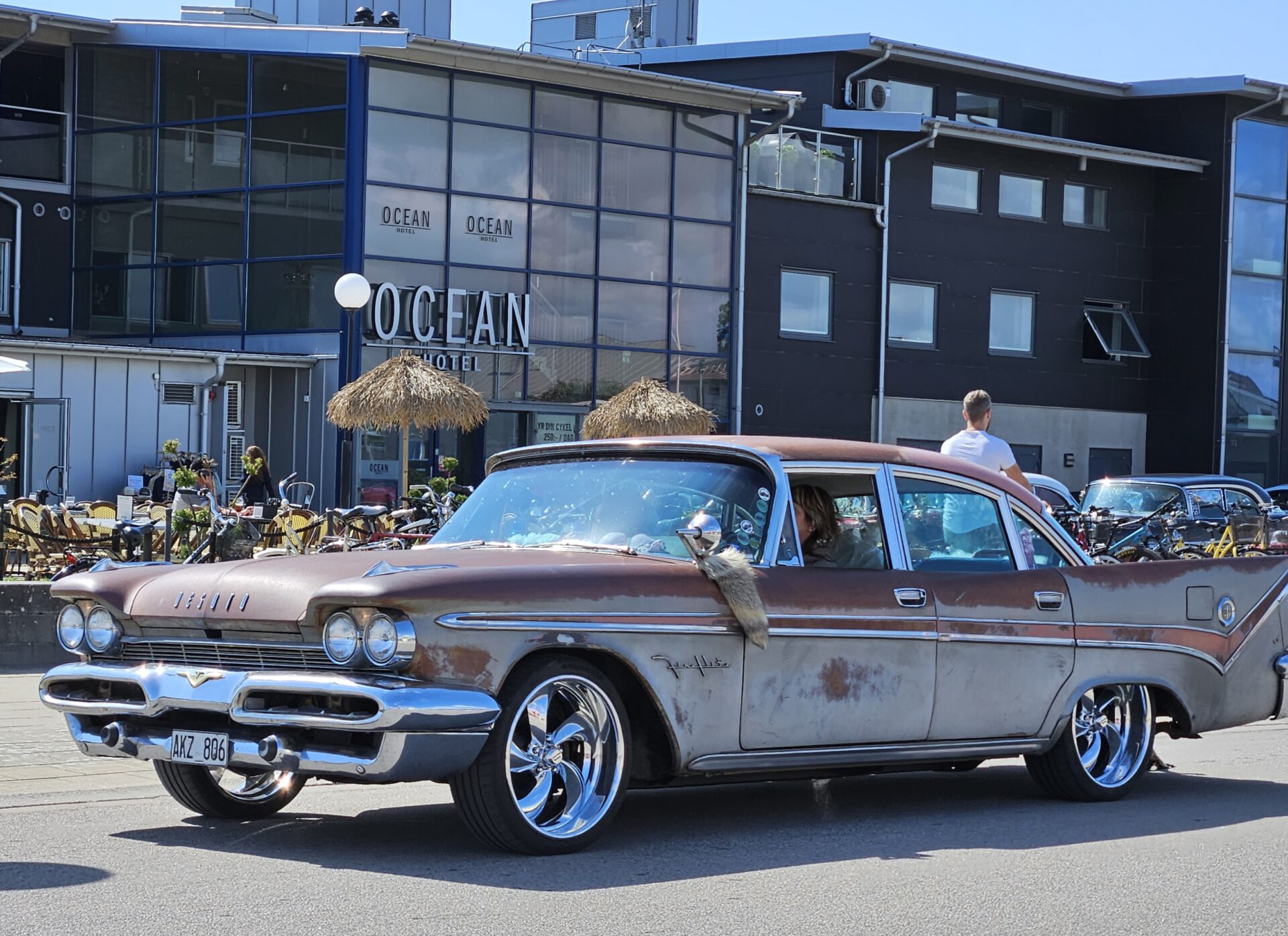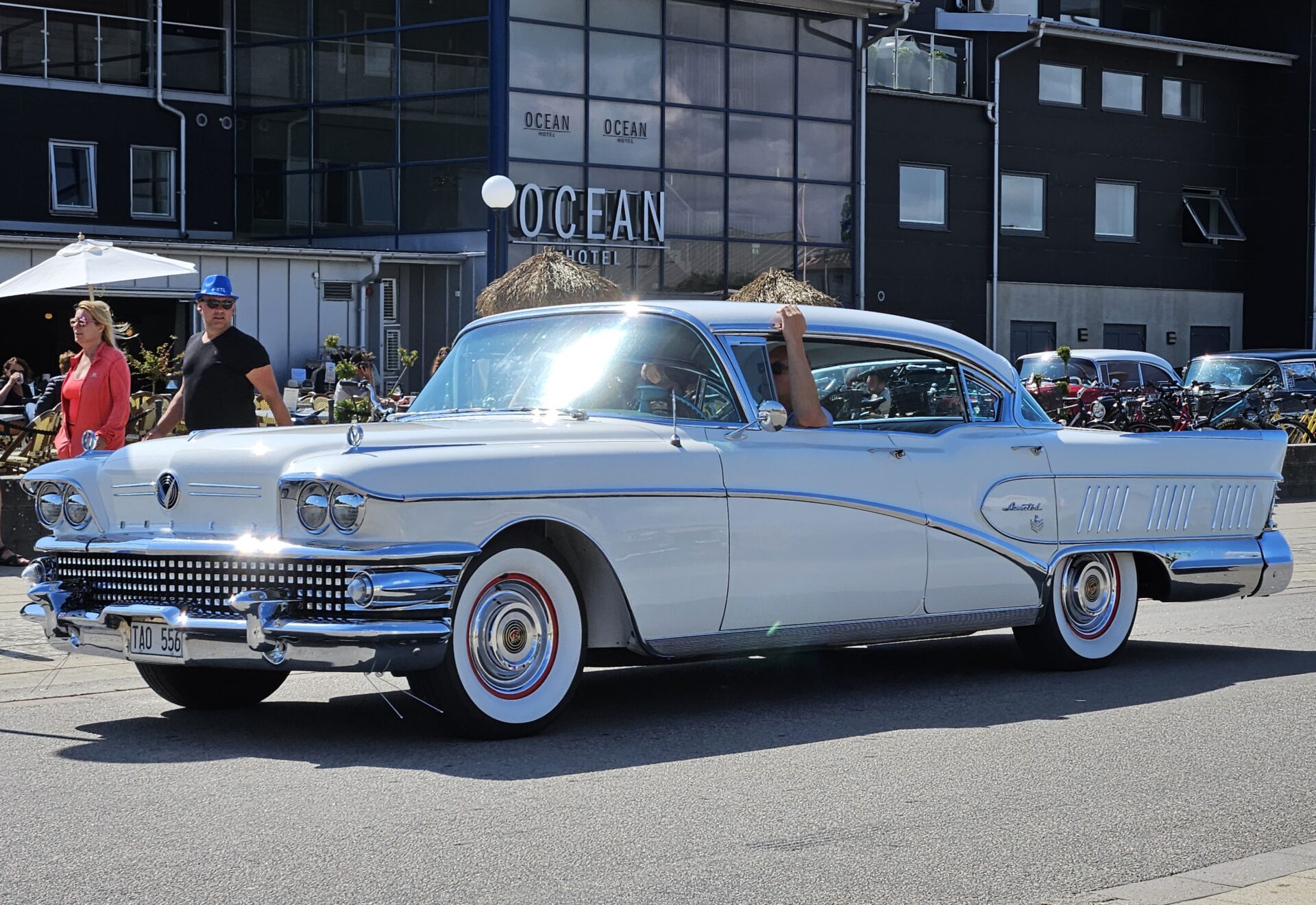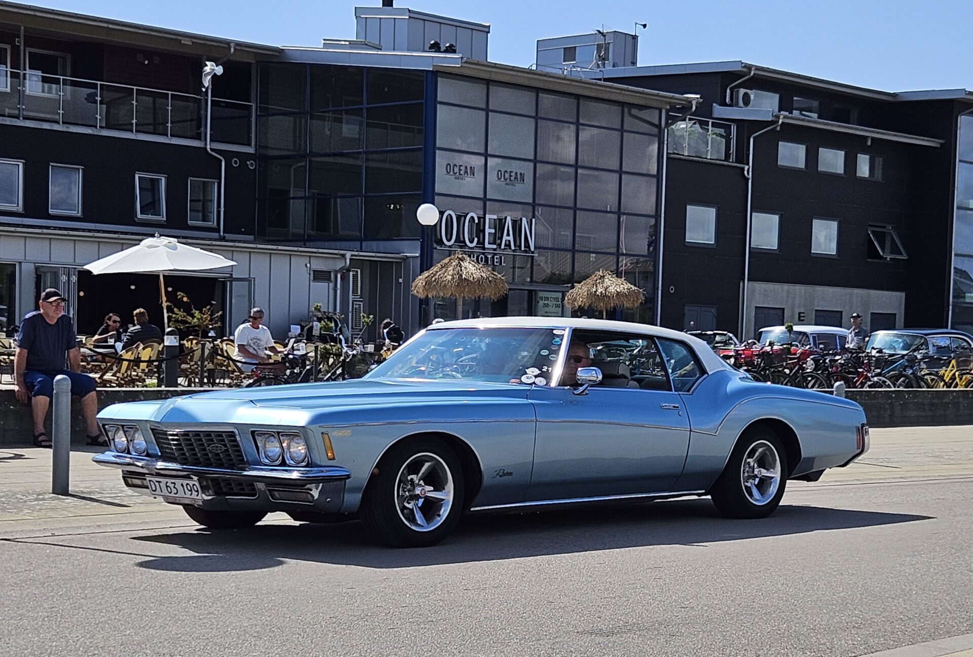 Nous commençons à croiser de nombreux voyageurs à vélo qui suivent comme nous le Kattegattleden, la piste cyclable qui relie Helsingborg à Göteborg. Le Kattegatt étant l’espace maritime entre le Danemark et la Suède. Ce n’est pas étonnant, cette côte est vraiment superbe. Nous passons à Falkenberg où des dizaines de vieilles voitures américaines paradent sur le bord de mer. Les voitures sont une attraction, mais la trombine de certains des occupants n’est pas mal non plus.