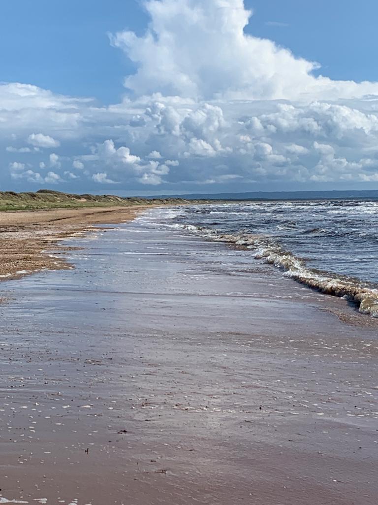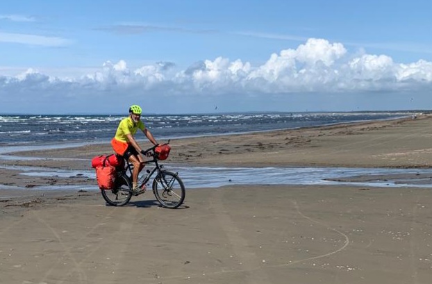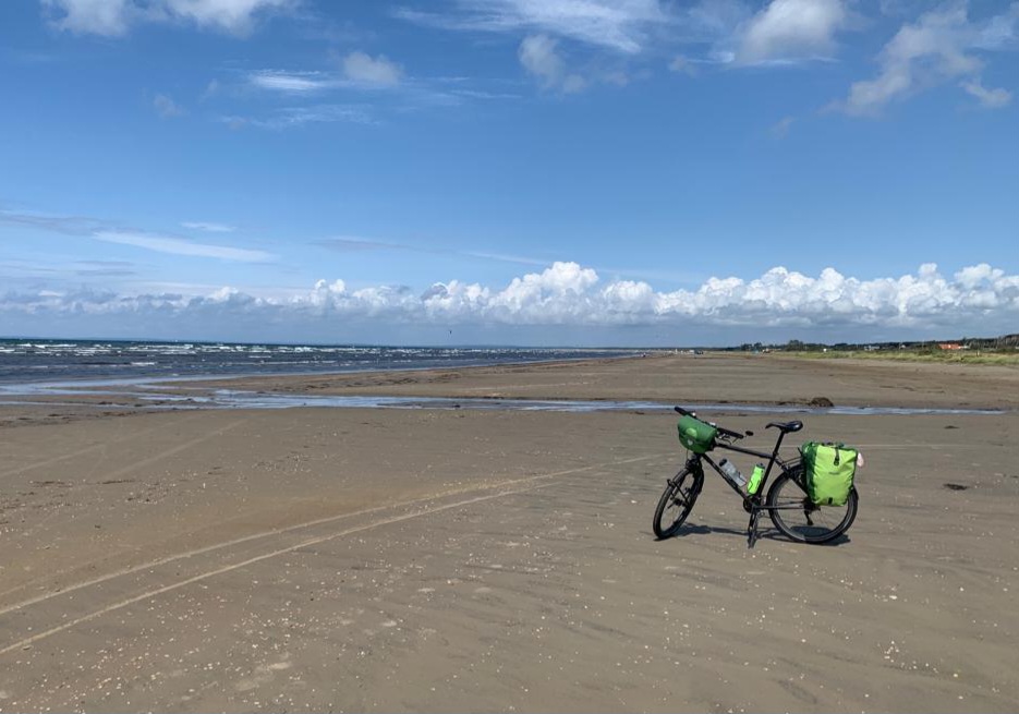 Cette nuit, il a bien plu, la tente est pliée mouillée. Le ciel reste menaçant, mais il ne pleut pas. La météo n’est pas réjouissante, nous partons avec notre équipement de plongeur sous-marin à proximité, finalement à part quelques gouttes au moment du pique-nique, nous avons encore une belle journée. De plus, le vent a tourné à l’est aujourd’hui, il nous pousse une bonne partie de la journée, c’est plutôt agréable. Nous arrivons au soleil dans un camping un peu bondé, qui donne directement sur la plage. J’en profite pour faire une petite baignade. J’y vais confiant, au vu de l’expérience précédente, mais je suis un peu saisi en rentrant. La mer a perdu quelques degrés, peut-être à cause de la pluie et du vent. Mais ça reste très supportable.