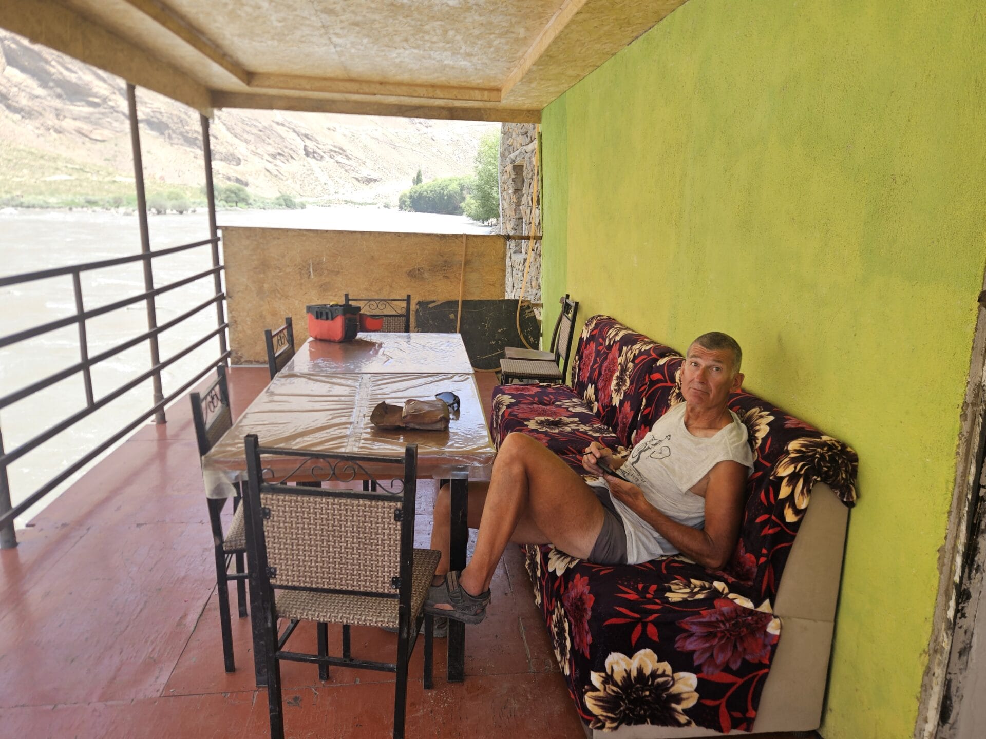 Nous avons des nouvelles de Jürgen qui nous dit que le Kargush pass est « Incredibly difficult ». Bigre, nous verrons bien sur place, et nous nous disons qu’il a des pneus trop fins pour les parties sabloneuses que nous allons trouver là-bas 😳. En attendant nous avons notre étape du jour, toujours sur une route qui alterne le bon et le moins bon. Le bon est bien en dessous des pires routes goudronnées en France. En chemin nous faisons un brin de causette avec Kazu, un cycliste japonais solitaire qui chemine en sens inverse. Nous échangeons des informations sur nos routes mutuelles à venir. Il est très enthousiaste, et c’est marrant nous avons le même age, du coup il me serre la main. J’adore ces rencontres improbables au milieu de nulle part. Notre étape se termine à Iskoshim dans une homestay grand luxe, avec douche, WC, et WiFi.