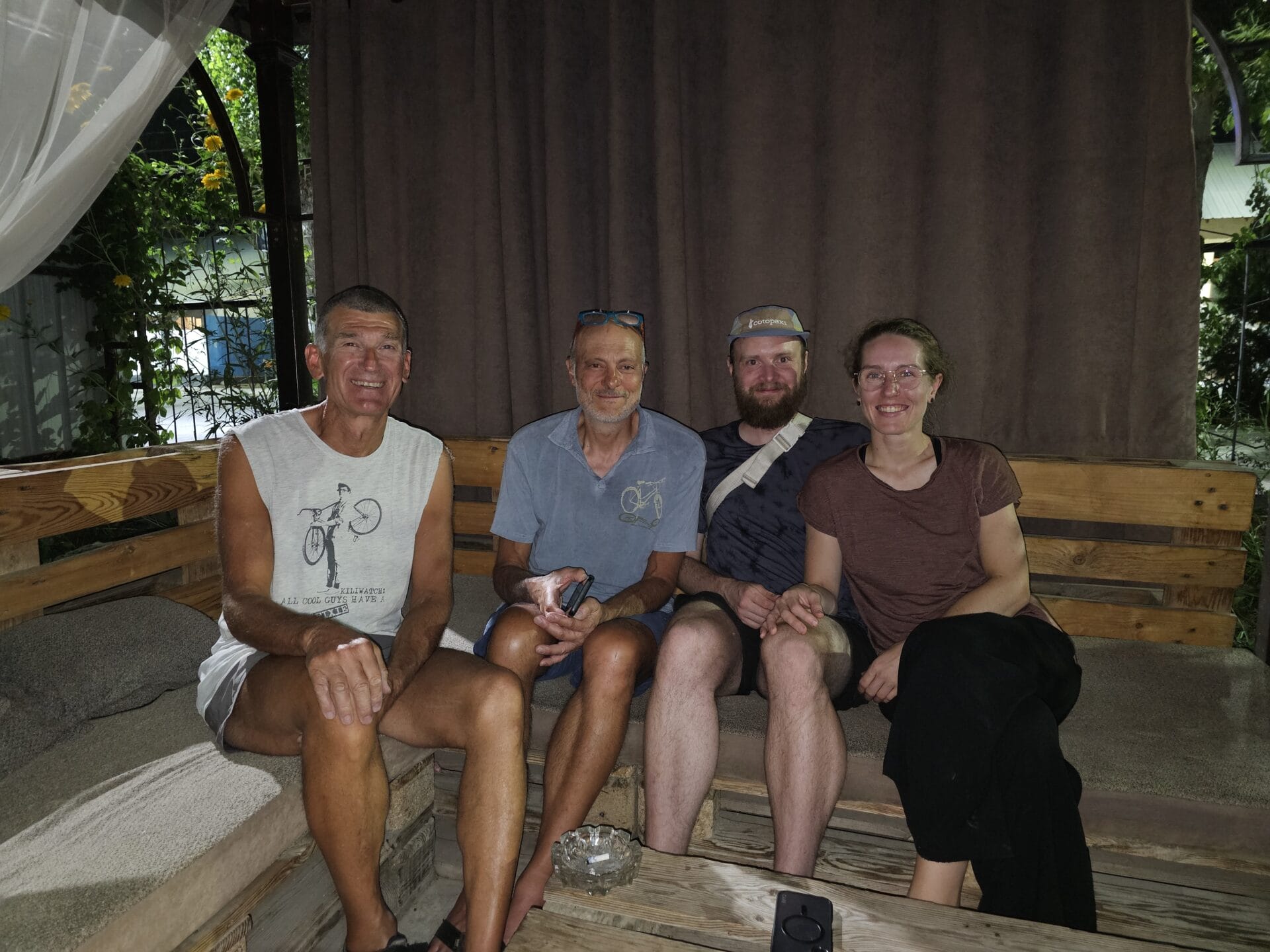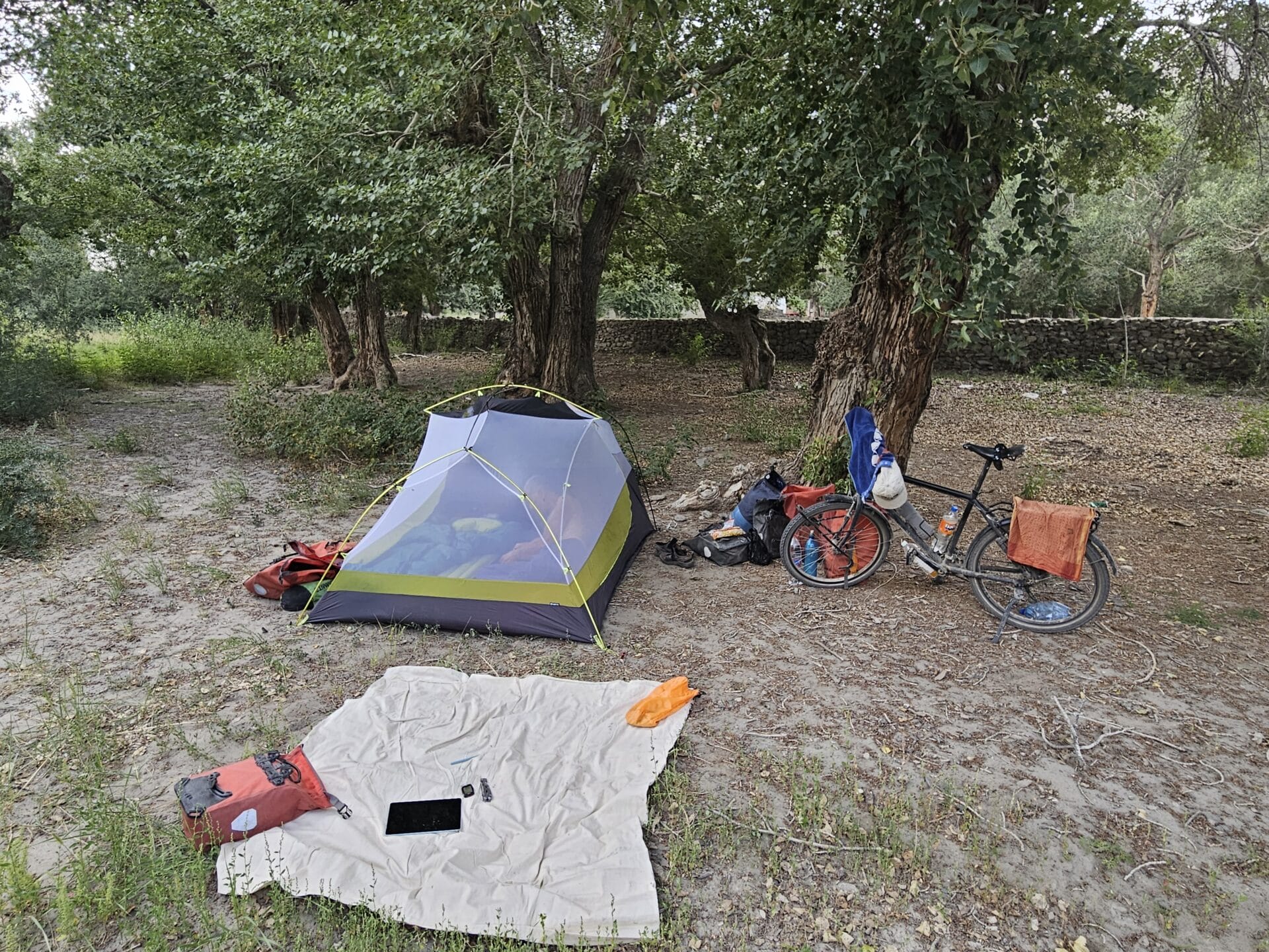 Aujourd’hui grasse mat jusqu’à 5h45, car il commence à faire un peu moins chaud à 2500 m. Comme nous avons plutôt une « bonne » route ce matin, nous arrivons plus vite que prévu à l’étape. Nous décidons alors de continuer encore une douzaine de kilomètres. Évidemment la route se dégrade fortement, et le soleil fait son apparition. Nous avons des passages raides où les roues patinent, puis des zones sableuse, où les roues plongent littéralement en nous arrêtant net. Nous finissons par arriver à Zumudg ou nous demandons où planter notre palatka (tente). On nous indique une petite zone plate, ombragée et bien abritée. Il faut toujours demander aux habitants, ils connaissent toujours les meilleurs coins. En chemin nous avons croisé Madeleine et Félix, un couple d’autrichiens. Félix voyage depuis trois ans, et va mettre encore six mois pour rentrer chez lui. Grâce à la discussion que nous avons avec eux ainsi que celle avec Kazun hier, nous prenons une décision qui nous rend guillerets et impatients. Mais je vous en dirai plus dans quelque jours lorsque nous serons à proximité du village de Kargush.