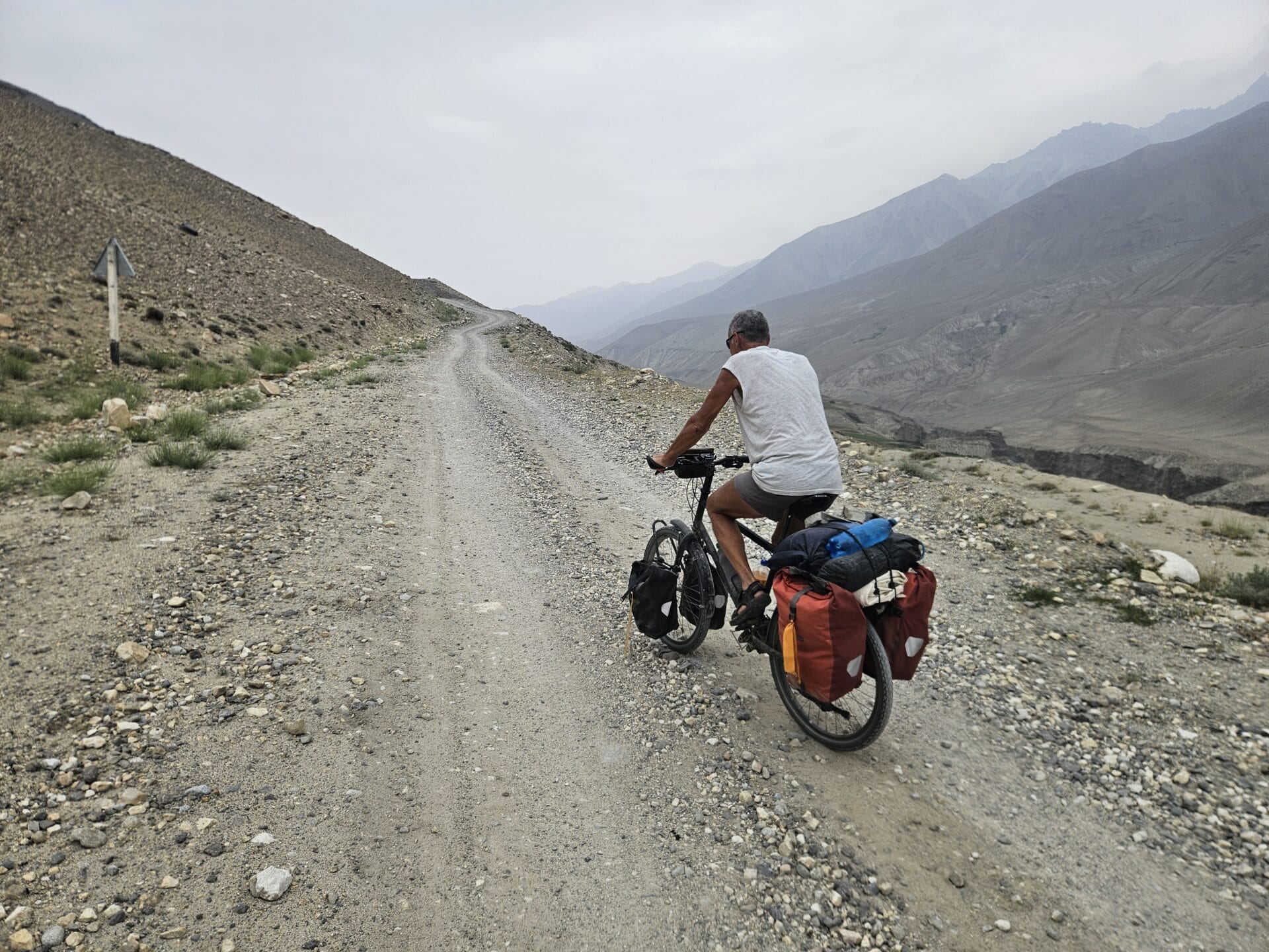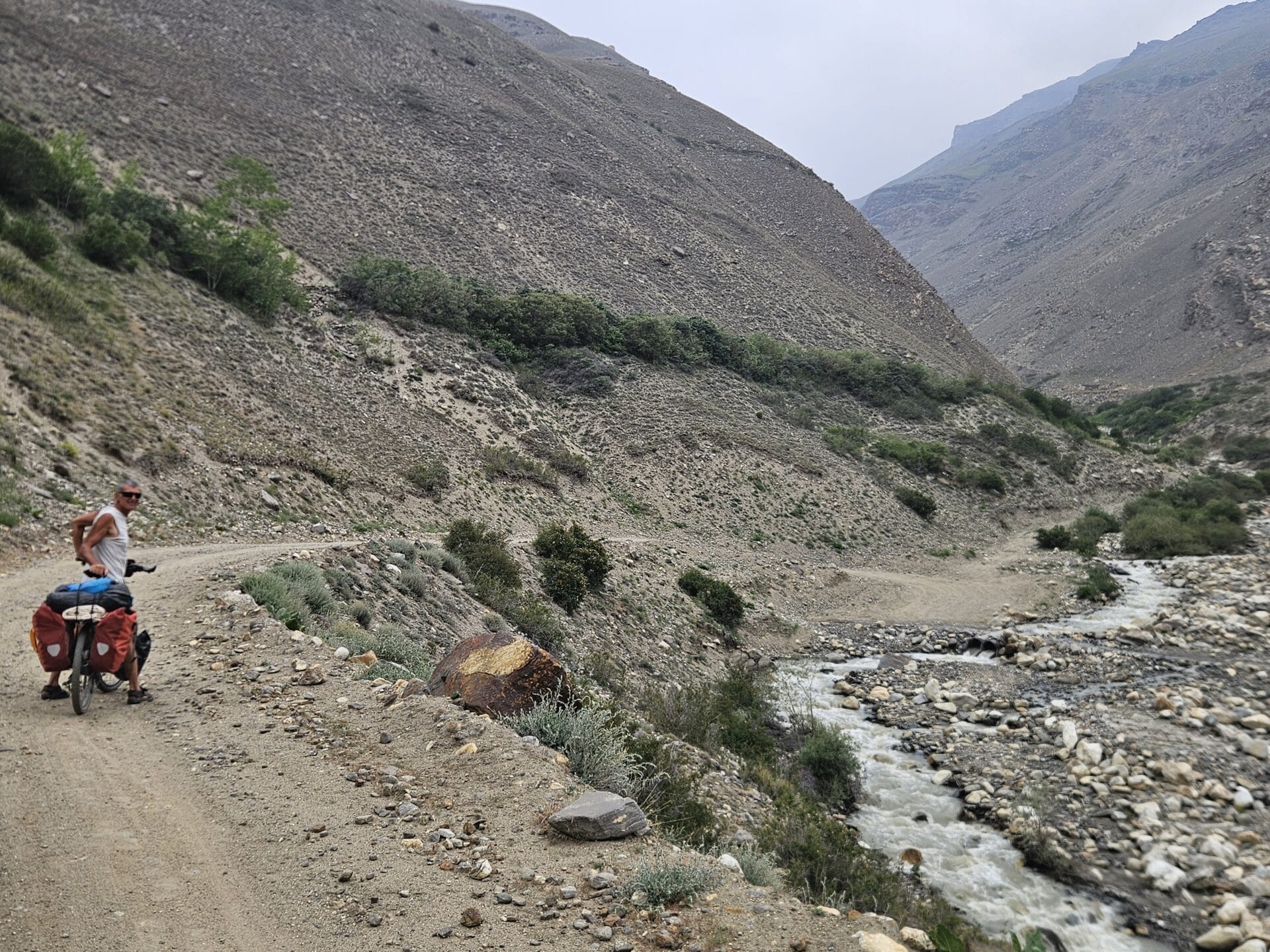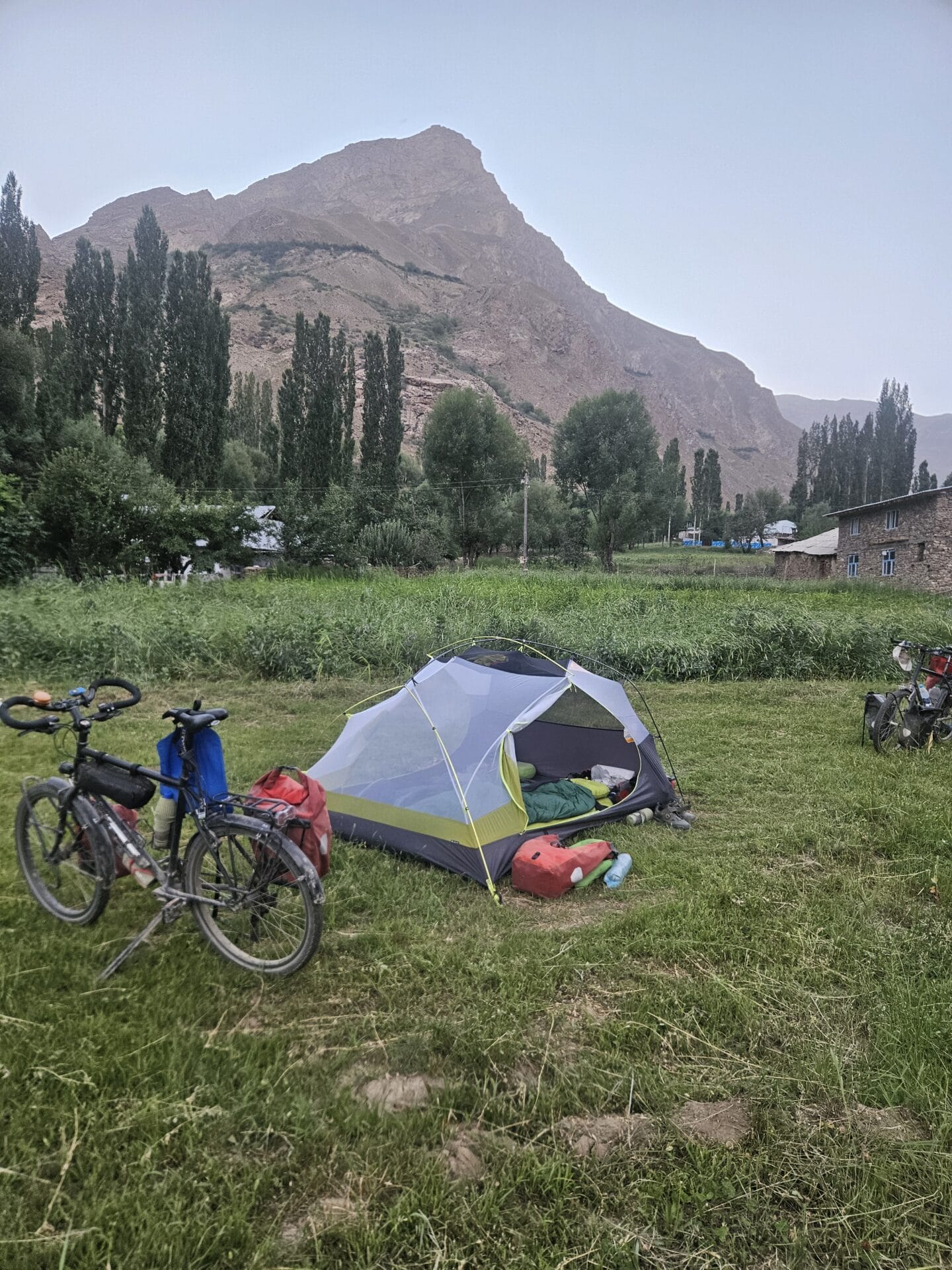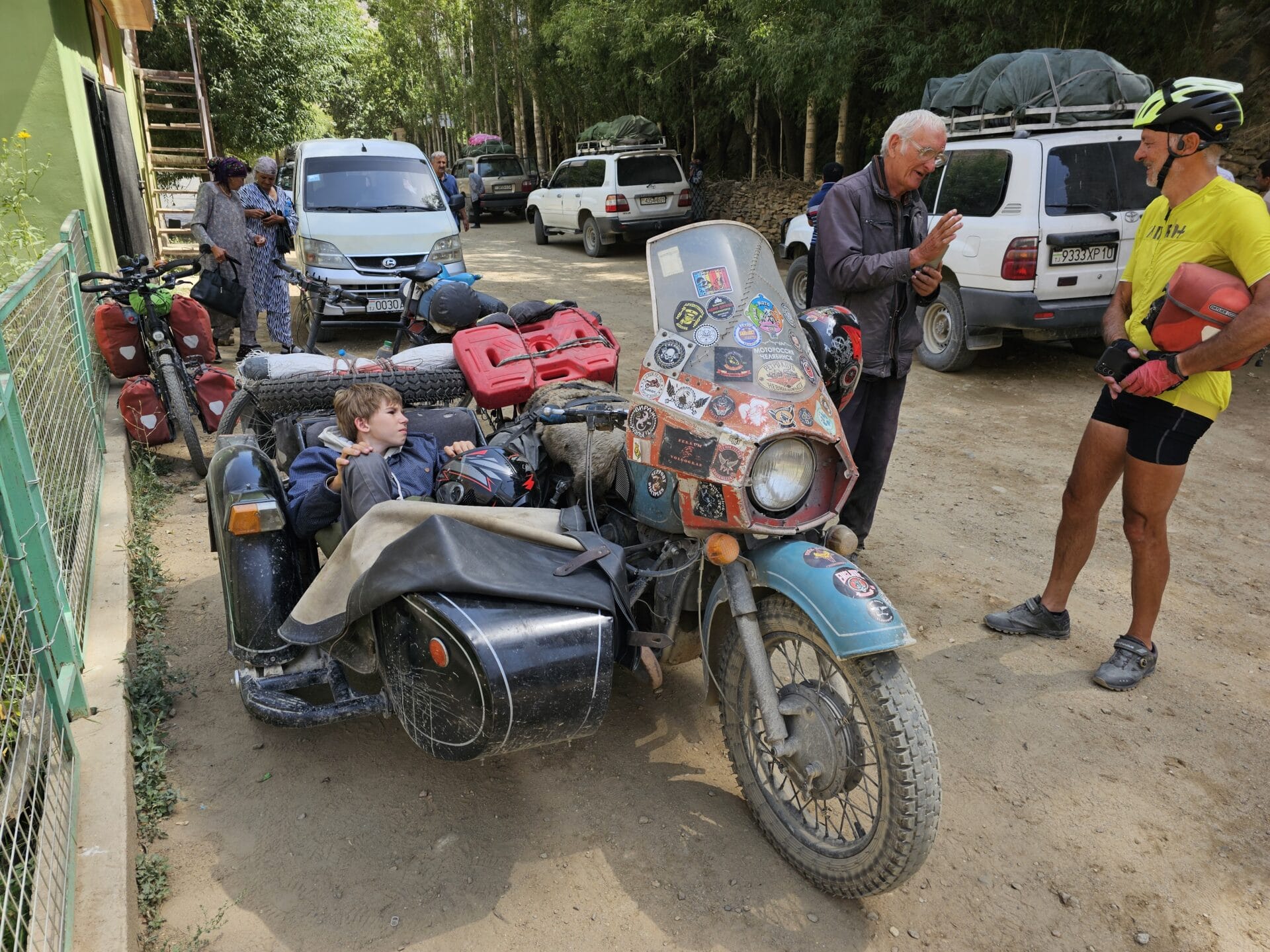 Nous avons des nouvelles de Jürgen qui nous dit que le Kargush pass est « Incredibly difficult ». Bigre, nous verrons bien sur place, et nous nous disons qu’il a des pneus trop fins pour les parties sabloneuses que nous allons trouver là-bas 😳. En attendant nous avons notre étape du jour, toujours sur une route qui alterne le bon et le moins bon. Le bon est bien en dessous des pires routes goudronnées en France. En chemin nous faisons un brin de causette avec Kazu, un cycliste japonais solitaire qui chemine en sens inverse. Nous échangeons des informations sur nos routes mutuelles à venir. Il est très enthousiaste, et c’est marrant nous avons le même age, du coup il me serre la main. J’adore ces rencontres improbables au milieu de nulle part. Notre étape se termine à Iskoshim dans une homestay grand luxe, avec douche, WC, et WiFi.