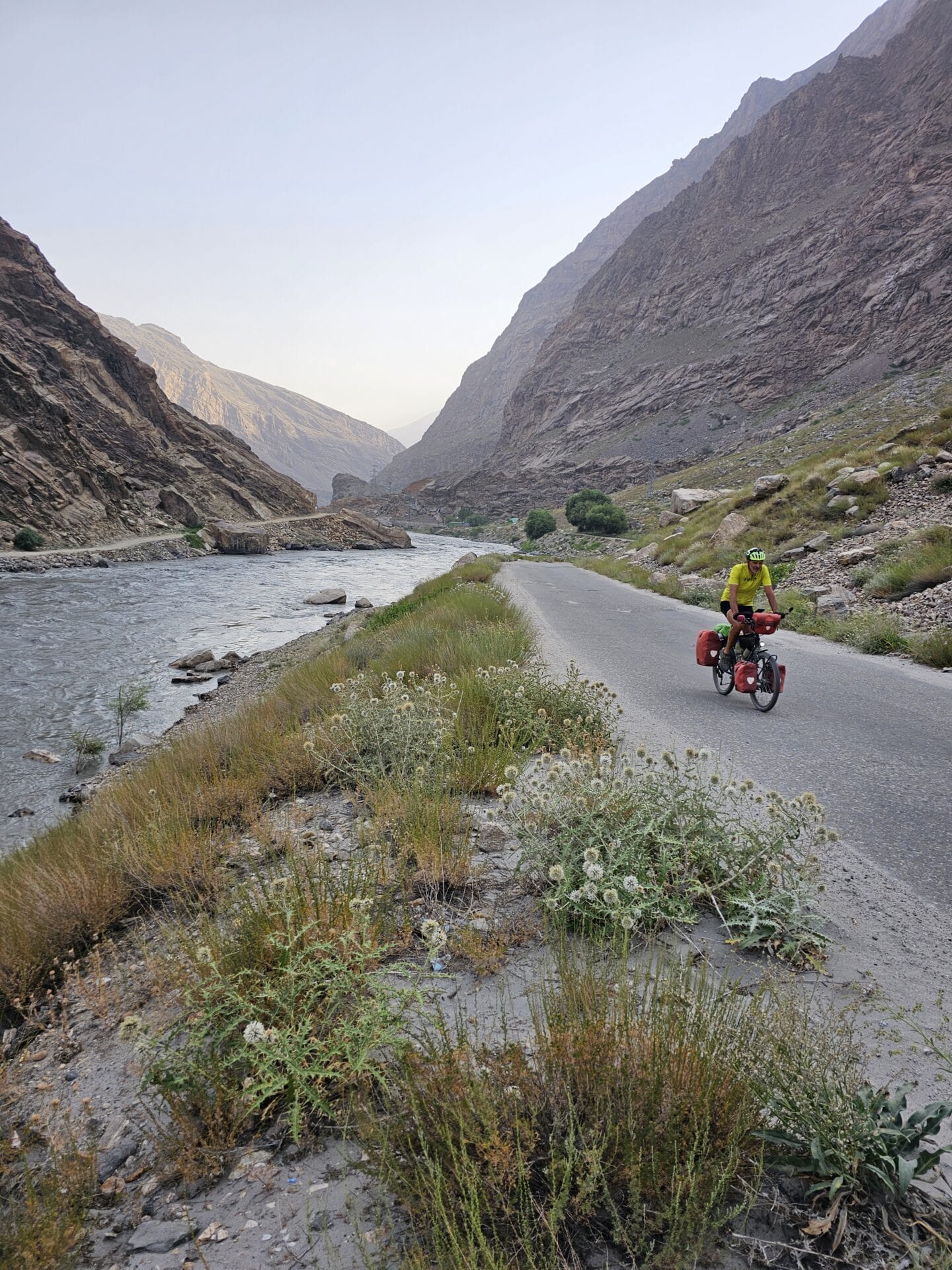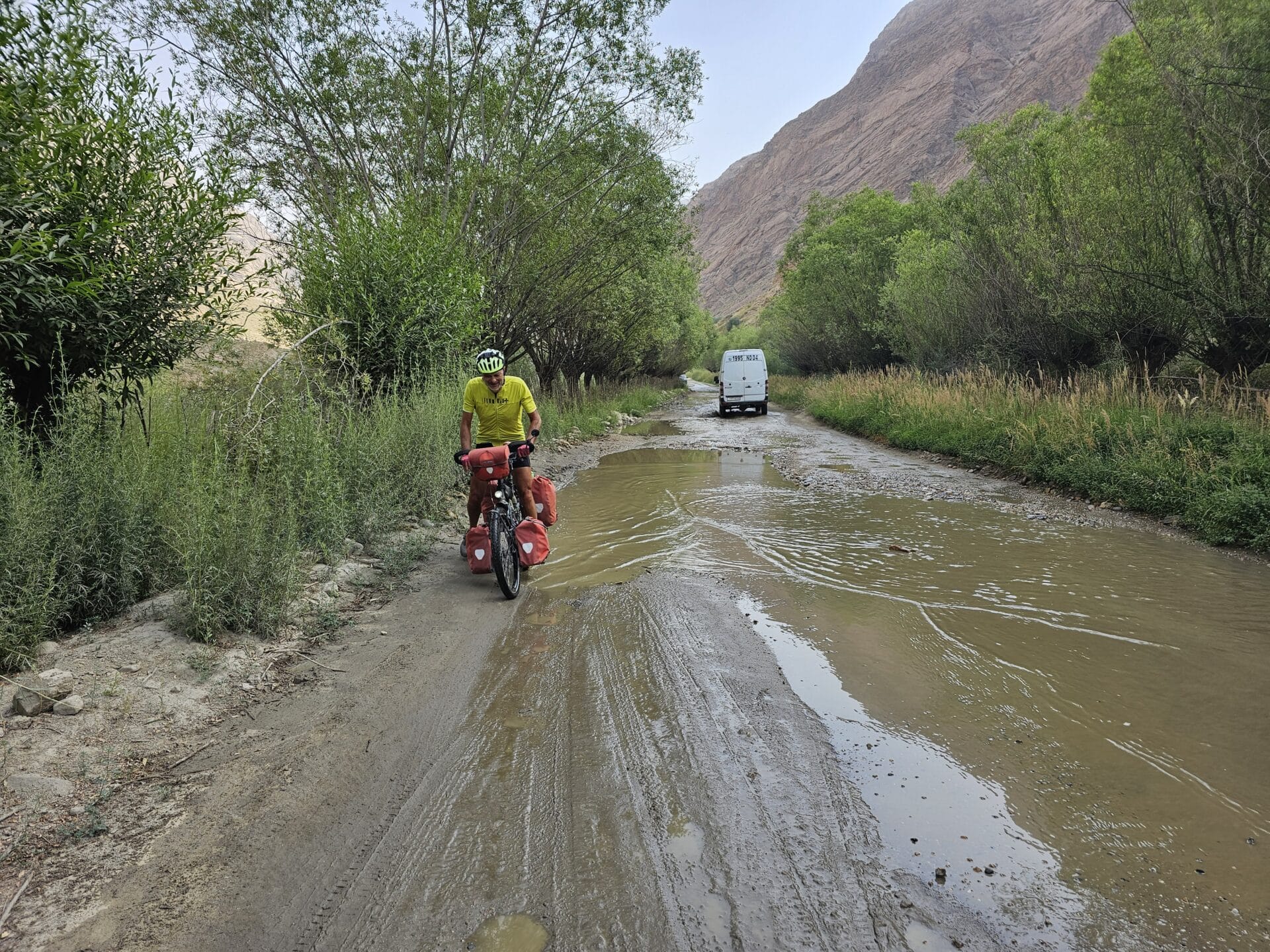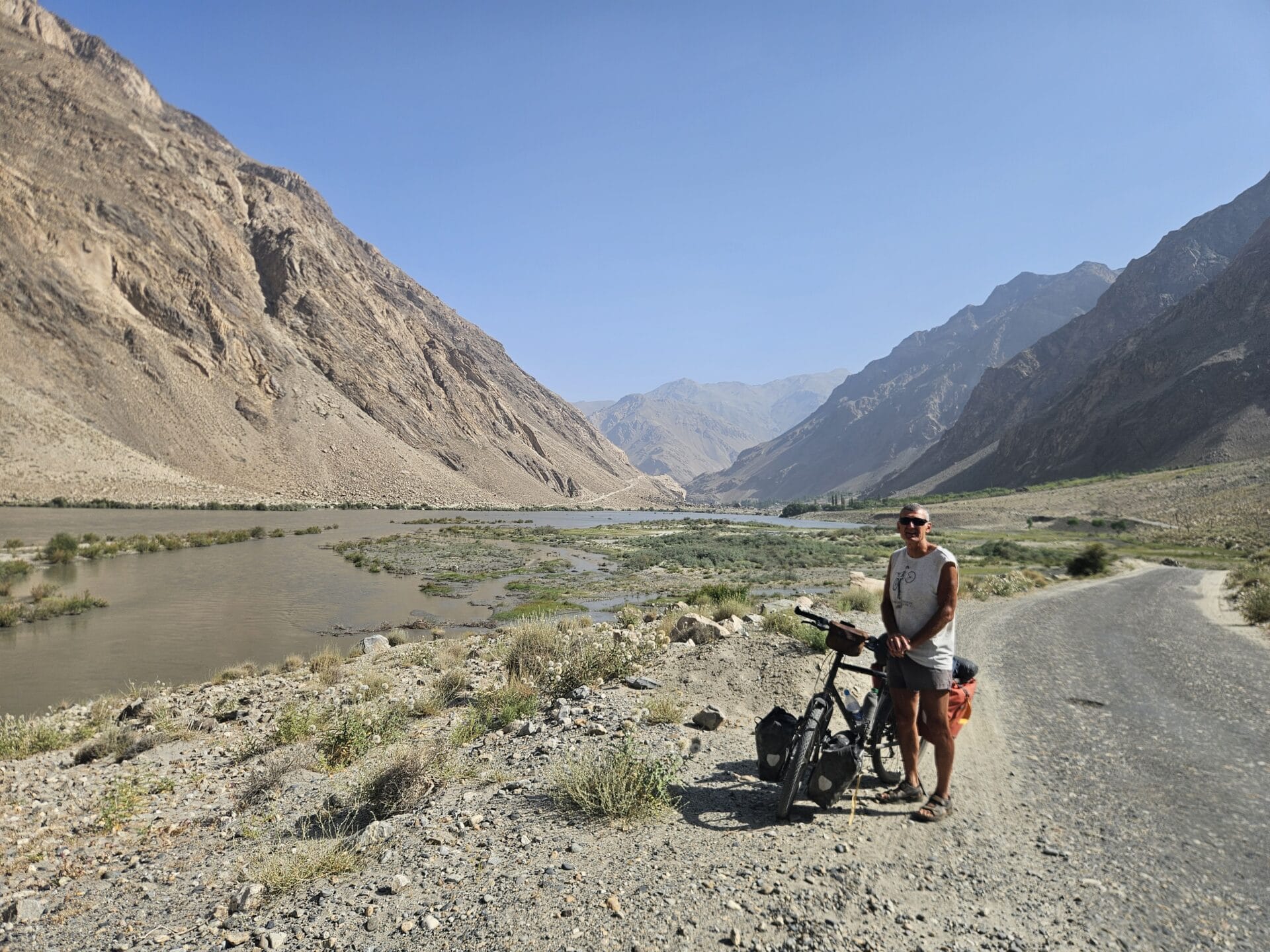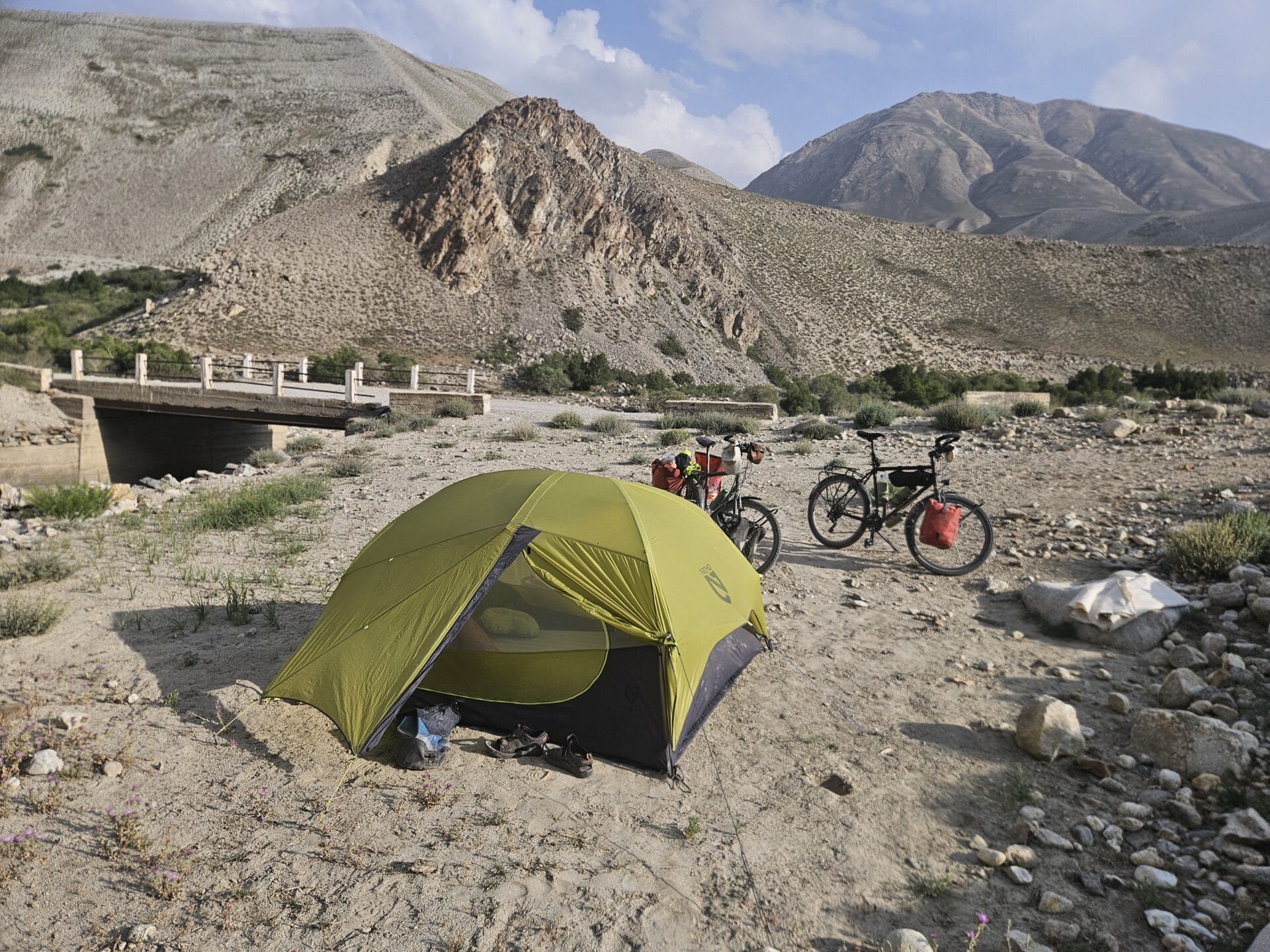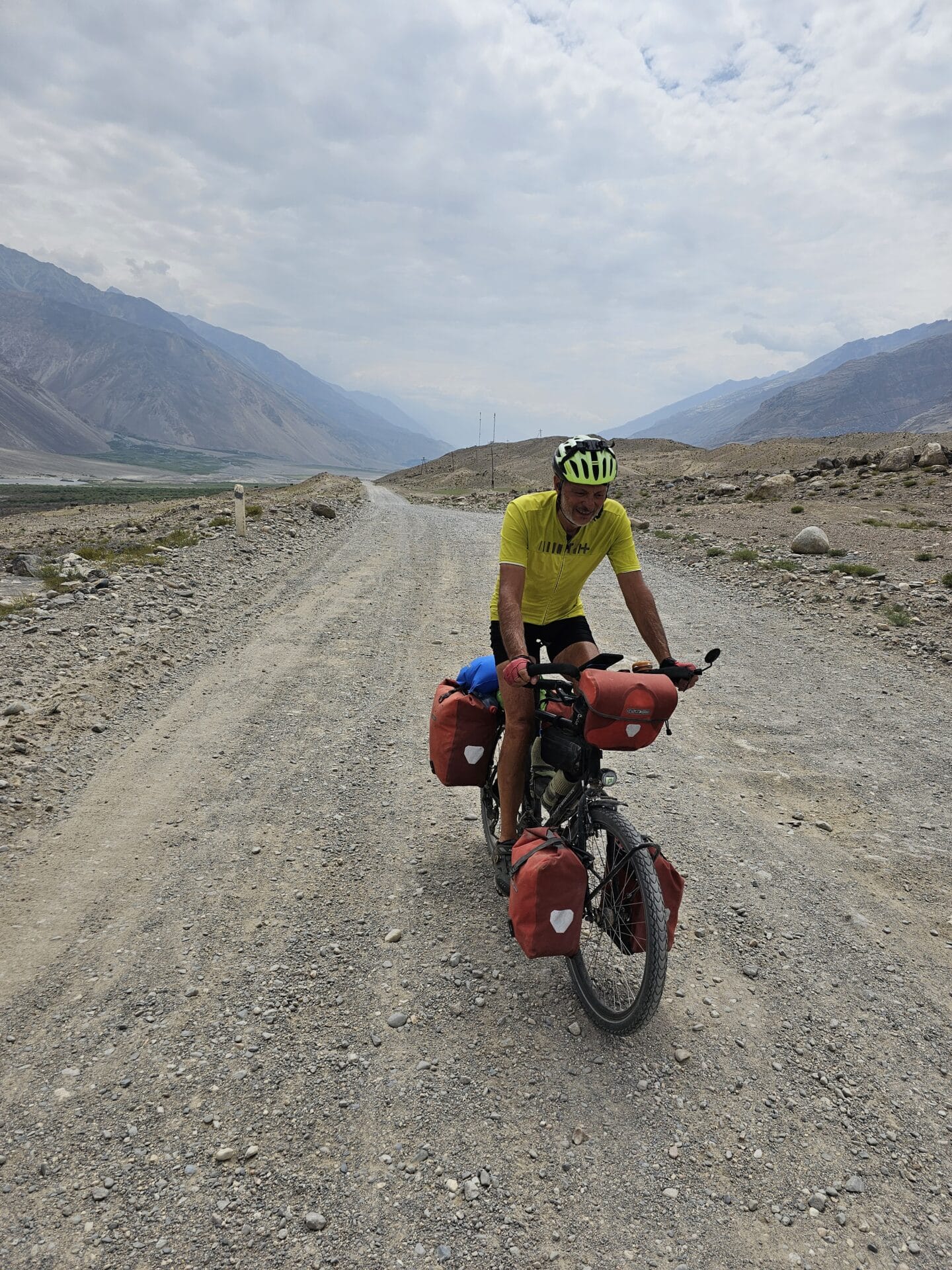 Nous avons des nouvelles de Jürgen qui nous dit que le Kargush pass est « Incredibly difficult ». Bigre, nous verrons bien sur place, et nous nous disons qu’il a des pneus trop fins pour les parties sabloneuses que nous allons trouver là-bas 😳. En attendant nous avons notre étape du jour, toujours sur une route qui alterne le bon et le moins bon. Le bon est bien en dessous des pires routes goudronnées en France. En chemin nous faisons un brin de causette avec Kazu, un cycliste japonais solitaire qui chemine en sens inverse. Nous échangeons des informations sur nos routes mutuelles à venir. Il est très enthousiaste, et c’est marrant nous avons le même age, du coup il me serre la main. J’adore ces rencontres improbables au milieu de nulle part. Notre étape se termine à Iskoshim dans une homestay grand luxe, avec douche, WC, et WiFi.
