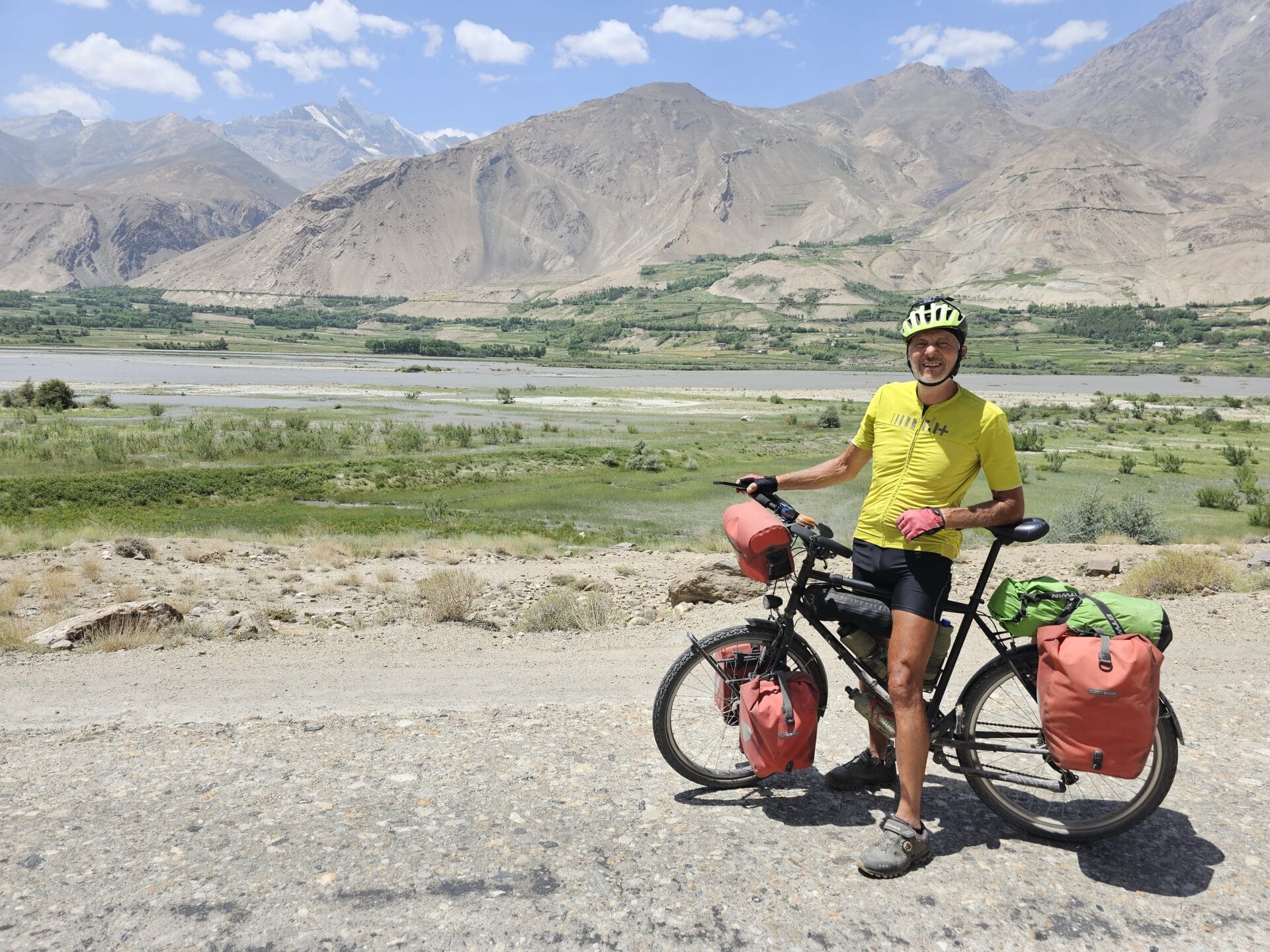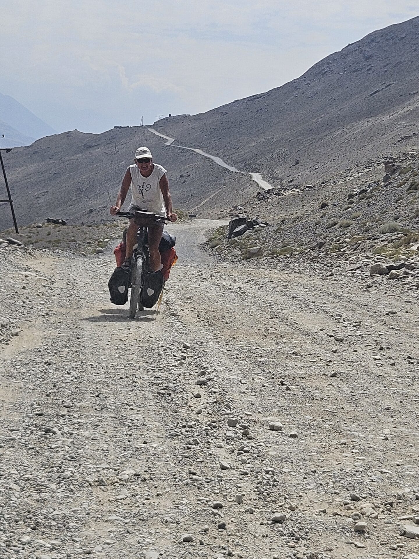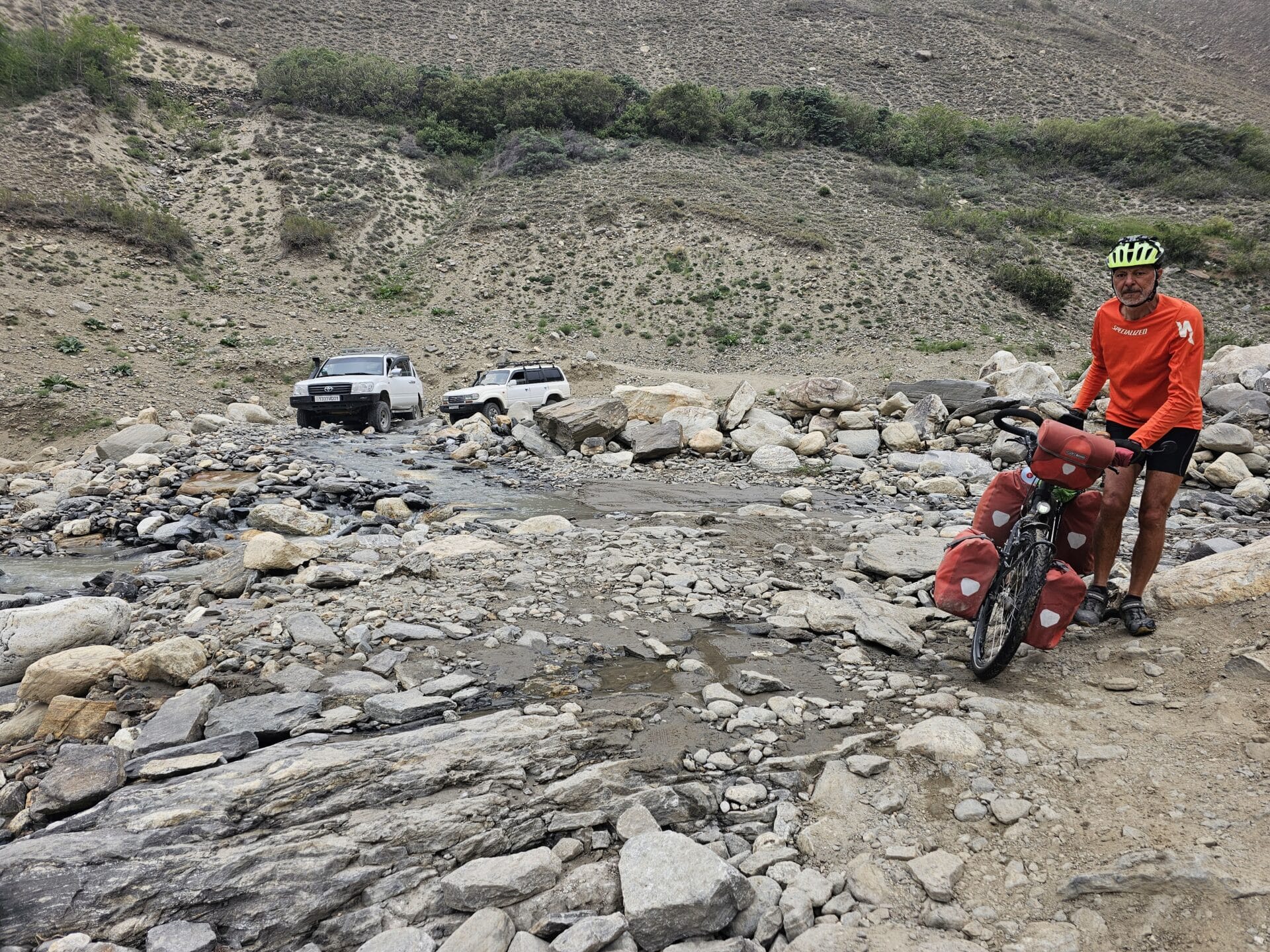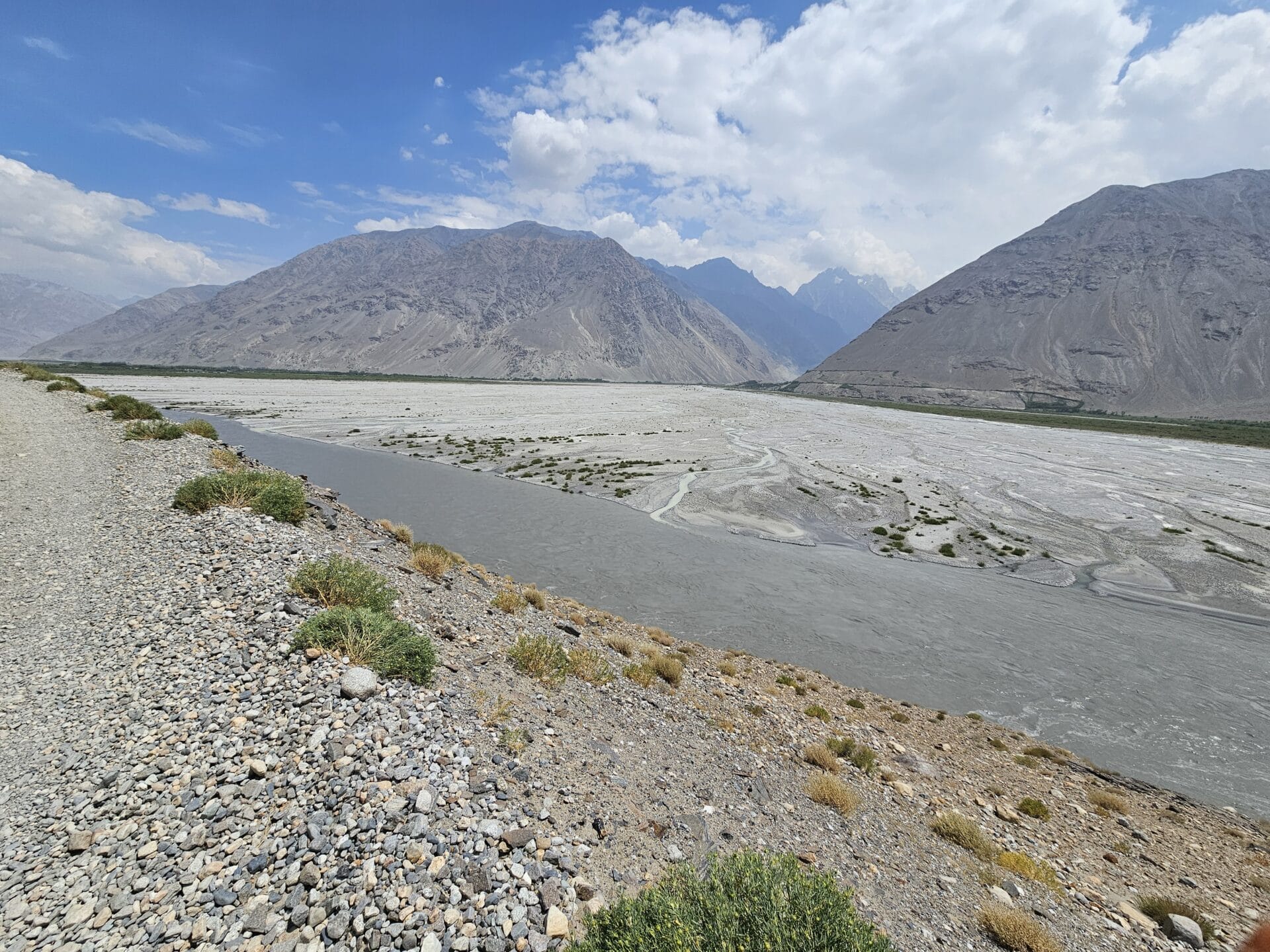 Nous avons des nouvelles de Jürgen qui nous dit que le Kargush pass est « Incredibly difficult ». Bigre, nous verrons bien sur place, et nous nous disons qu’il a des pneus trop fins pour les parties sabloneuses que nous allons trouver là-bas 😳. En attendant nous avons notre étape du jour, toujours sur une route qui alterne le bon et le moins bon. Le bon est bien en dessous des pires routes goudronnées en France. En chemin nous faisons un brin de causette avec Kazu, un cycliste japonais solitaire qui chemine en sens inverse. Nous échangeons des informations sur nos routes mutuelles à venir. Il est très enthousiaste, et c’est marrant nous avons le même age, du coup il me serre la main. J’adore ces rencontres improbables au milieu de nulle part. Notre étape se termine à Iskoshim dans une homestay grand luxe, avec douche, WC, et WiFi.