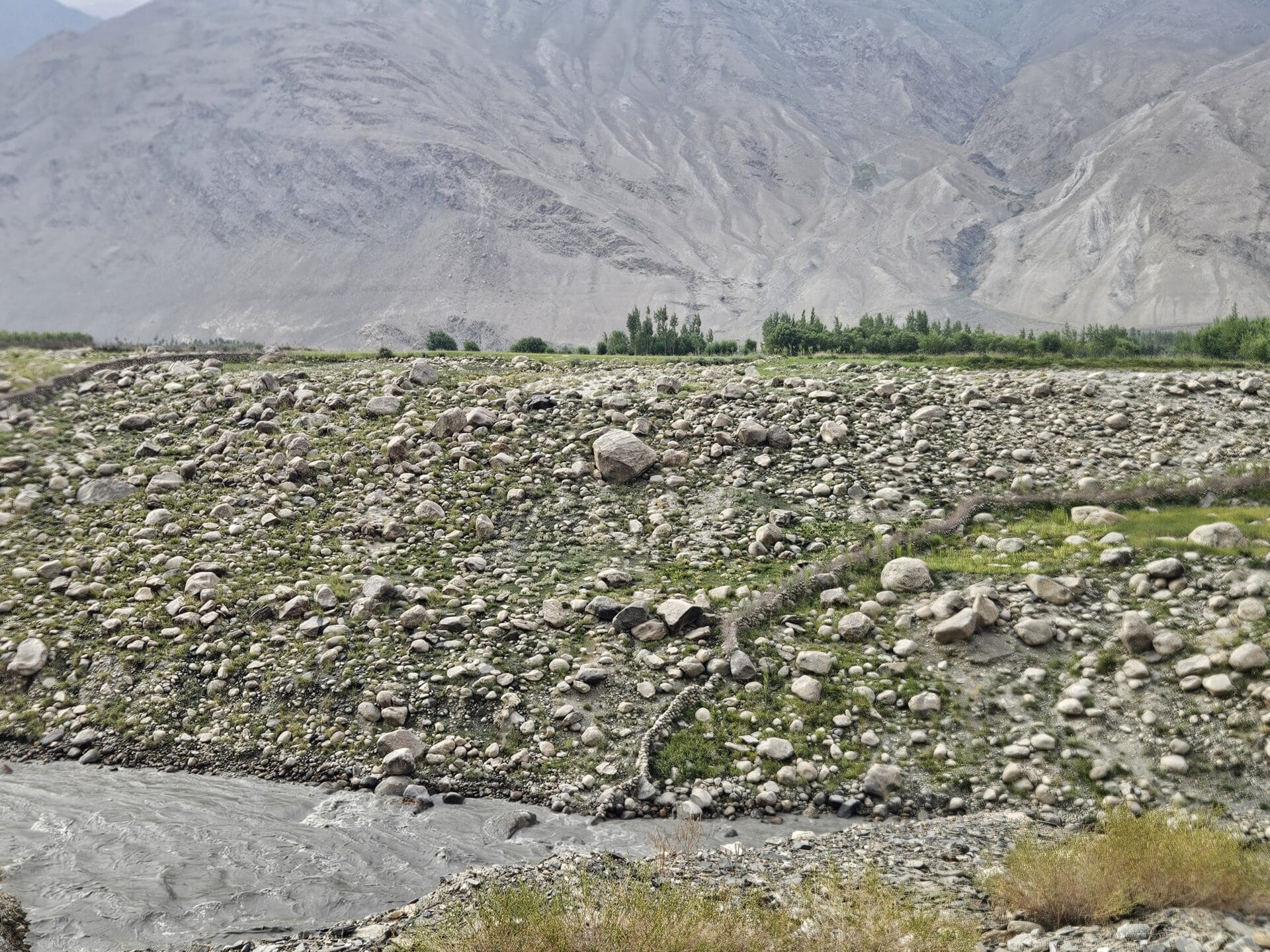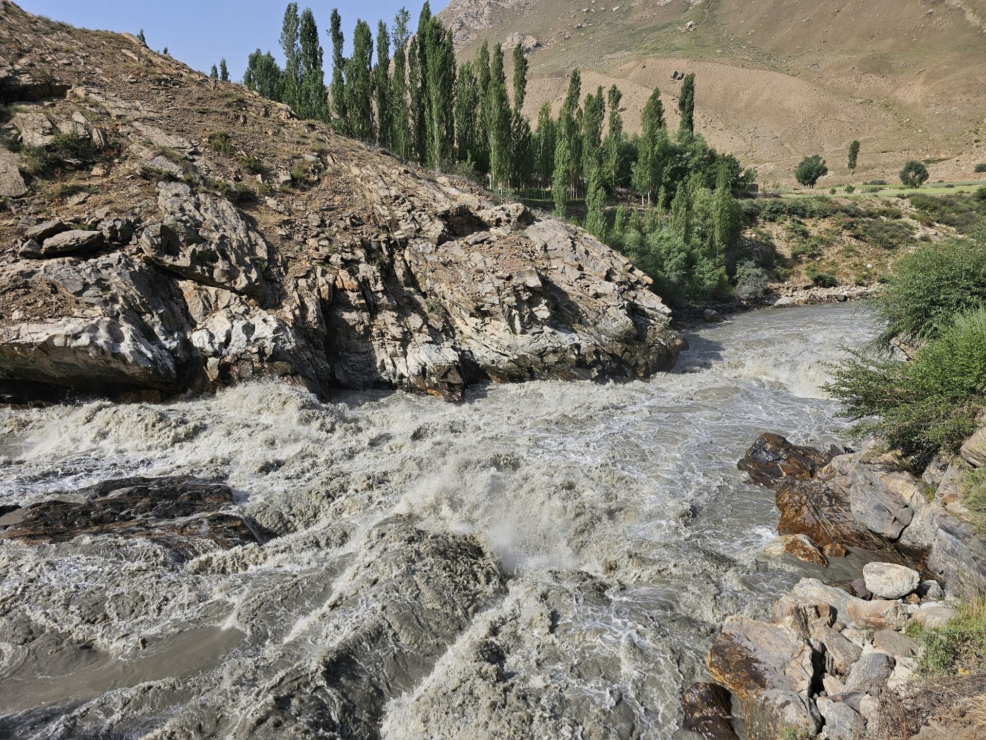 Ce matin notre bivouac sympa se transforme en enfer à cause des moustiques, en plus ils sont très mal élevés car ils ne savent pas que d’habitude on ne me pique pas ! Nous plions rapidement la tente et nous fuyons pour petit déjeuner tranquillement plusieurs kilomètres plus loin. Cette fois la route est vraiment très mauvaise toute la journée. Une nouvelle « amie » fait son apparition, je crains que ce ne soit pour un long moment : la tôle ondulée. En vélo c’est assez terrible, il faut trouver des lignes de bord de piste pour l’éviter à tout prix. Chaque jour nous croisons des voyageurs en provenance du Kirghizistan. Hier en plus des deux autrichiens, une polonaise et un russe, aujourd’hui trois koréens et deux espagnols à pied. Ils sont unanimes, les deux journées à venir vers le Kargush pass sont très mauvaises. On a dû mal à imaginer pire qu’aujourd’hui, mais nous verrons bien demain. De plus nous allons être en autonomie les jours à venir, donc nos sacoches sont pleines de provisions. Pour l’eau, nous devrions trouver des sources, il nous suffira de filtrer. Peu avant Langar nous quittons la rivière Panj que nous suivons depuis 500 kilomètres. Nous longeons maintenant la rivière Pamir.