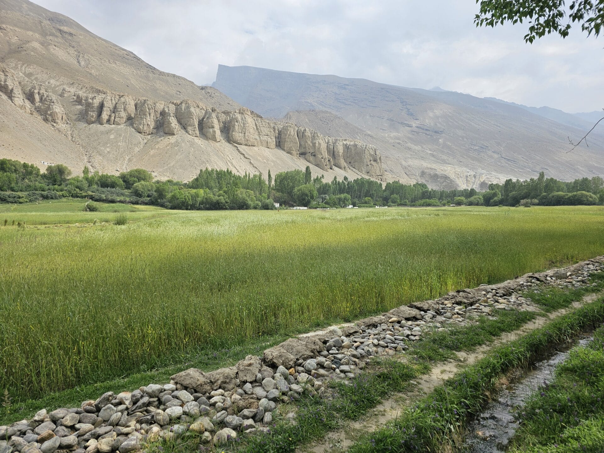 Le soir, enfin au début des heures chaudes, donc peu après midi, nous trouvons un beau bivouac dans un champs. Son propriétaire nous offre un chay chez lui avec un super bon pain maison tout chaud et de la confiture de merise. C’est un ancien ingénieur en électricité qui a travaillé pour une compagnie de l’Aga Khan dans tous les pays environnants. Ses enfants ont fait leurs études à Dushanbé et travaillent maintenant à Moscou. Ce n’est pas la première fois que nous entendons ce scénario. Ces pays d’Asie centrale sont encore bien tournés vers la Russie, qui doit voir dans leur jeunesse éduquée, une main d’œuvre qualifiée bon marché. Il ne faut pas oublier que ces pays n’ont pas souhaité leur indépendance, mais l’ont subie lors de l’éclatement de l’URSS. Le soir, peu après notre dîner de nouilles chinoises, notre ami nous amène un plateau avec deux soupes et encore du bon pain maison. Obligés de faire un deuxième repas 😄