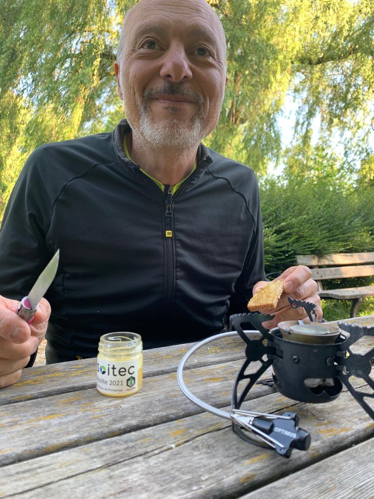 Depuis le 4ème jour à peu près, nous avons pris nos marques. Nous savons à peu près où se trouvent les objets. Plus besoin de défaire tout l’équipement pour retrouver ce qu’on avait mis dans la poche, pour gagner du temps… Le matin, les articulations craquent un peu, mais les jambes ont vite besoin de leur dose de pédalage. Une bonne routine s’installe.