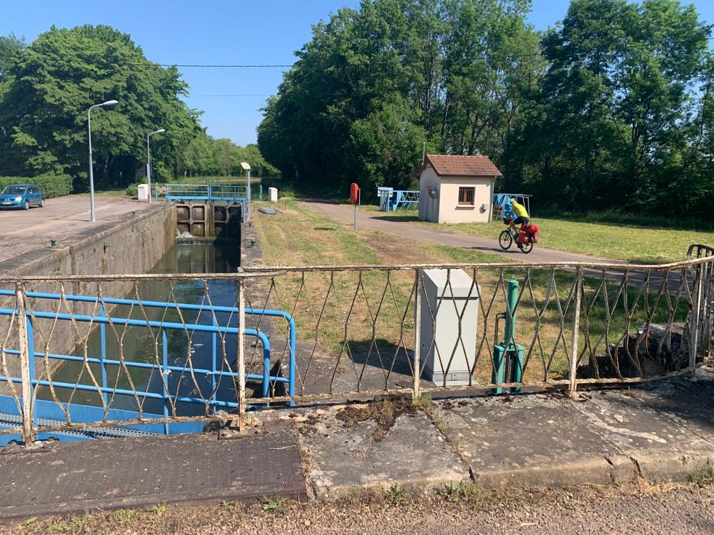 6ème jour, maintenant le terrain est plat, très plat. 230 m de dénivelé dans la journée. Nous suivons des rivières ou des canaux sur les anciens chemins de halage. On passe les écluses les unes après les autres, il y en a une tous les kilomètres. On se fait des signes avec nos potes plaisanciers d’eau douce, c’est paisible. De plus la proximité de l’eau amène de la fraîcheur. Nous suivons le canal entre Champagne et Bourgogne. On ignorait qu’il y avait tant de canaux en France.