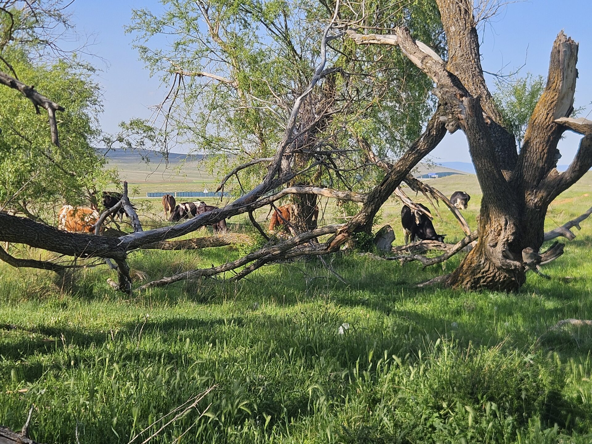 Nous avons une longue étape aujourd’hui car le prochain « Market » est à 80 km. Toujours des grands espaces mais un peu agricole et plus monotone que les jours précédents. Ce jour nous rencontrons deux problèmes. D’abord, il fait bien chaud, nous consommons deux fois plus d’eau et nous n’en avons pas pris assez. Le deuxième classique : en fin de journée, nous voyons fleurir quelques sens interdits sur la route que nous suivons, mais pas d’autre possibilité que le simple demi-tour. Un peu plus loin nous avons un panneau de chaque côté, mais toujours pas d’alternative. Tout en continuant, je me remémore les obstacles habituels, pont en construction, éboulement, travaux divers. Puis ça y est, je comprend, on ne l’avait pas encore eue cette version. La route va droit dans le mur, mais un gigantesque mur style barrage. Au moins là c’est sûr, ça ne passe pas. De chaque côté, une piste et encore des sens interdits. Nous voilà bien. C’est plutôt la piste de droite qui nous inspire tous les deux. C’est parti pour une ascension de trois raidillons sur plusieurs kilomètres. Je file devant pour éviter à Doum un dénivelé inutile si jamais ça ne débouche sur rien, ou si notre village étape est noyé dans une retenue d’eau. Mais une fois en haut, victoire ! Nous pouvons rejoindre notre route. Et très étrange, le mur est identique de l’autre côté, pas de lac, rien. Je croise une camionnette qui s’arrête, mais pas de réseau, difficile de communiquer. Je vois bien qu’ils veulent m’aider. Alors je me lance dans un mime digne d’un Times up pour leur dire de rassurer la cycliste qui est un peu plus bas. Pas sûr qu’ils m’aient compris. Mais cinq minutes plus tard, je les vois remonter avec une Doum et son vélo dans la benne. Trop sympas ! Le soir nous nous ruons sur le tout petit market, sauvés nous avons de l’eau ! Puis nous nous mettons en quête d’une bonne âme pour trouver un bivouac ou plus si affinité. Mais le village est vraiment désert. Le gars du market nous indique vaguement une direction où nous finissons par trouver un coin sympa à l’ombre pour le bivouac. On est presque surpris et indignés de ne pas avoir été invités !