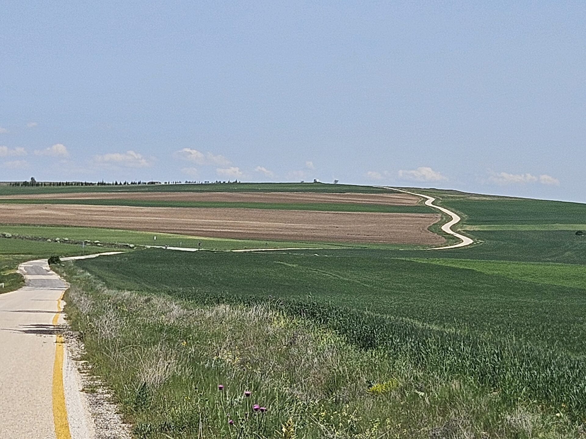 Depuis quelques jours, un nouvel ami s’est invité dans notre périple, le soleil. Ça cogne dur maintenant, et il n’y a pas beaucoup d’ombre dans ces grandes étendues. Heureusement dès qu’il y a un peu d’air ça va mieux, car il est encore frais. Je n’ose imaginer en plein été. C’est pour le pique-nique finalement que c’est le plus gênant. Alors nous essayons de trouver une gargote dans les petites villes que nous traversons. En fin de journée nous sommes un peu cuits car nous ne sommes pas encore accoutumés à ces conditions. A peine une semaine en arrière, nous fuyions la pluie et le froid.