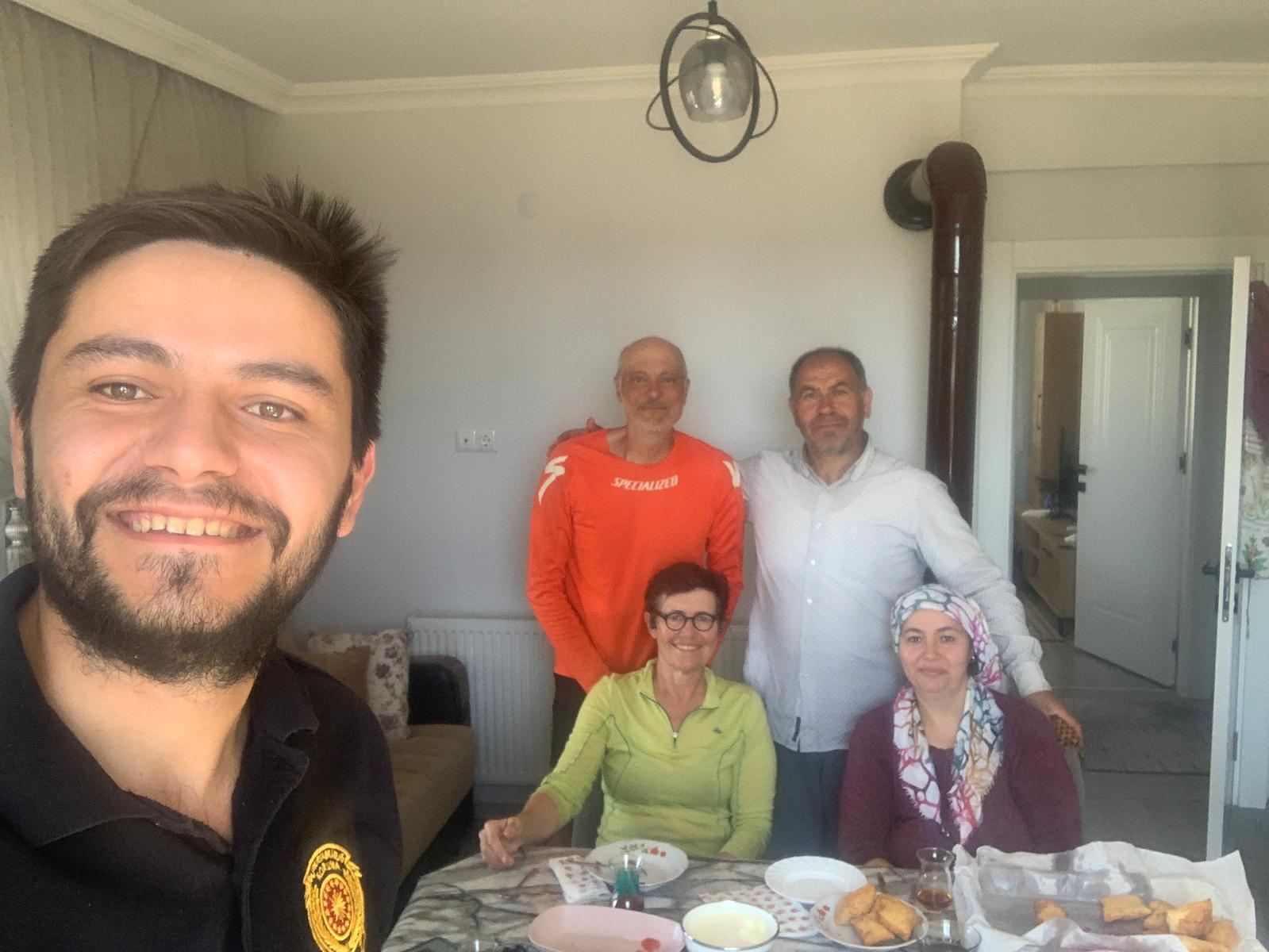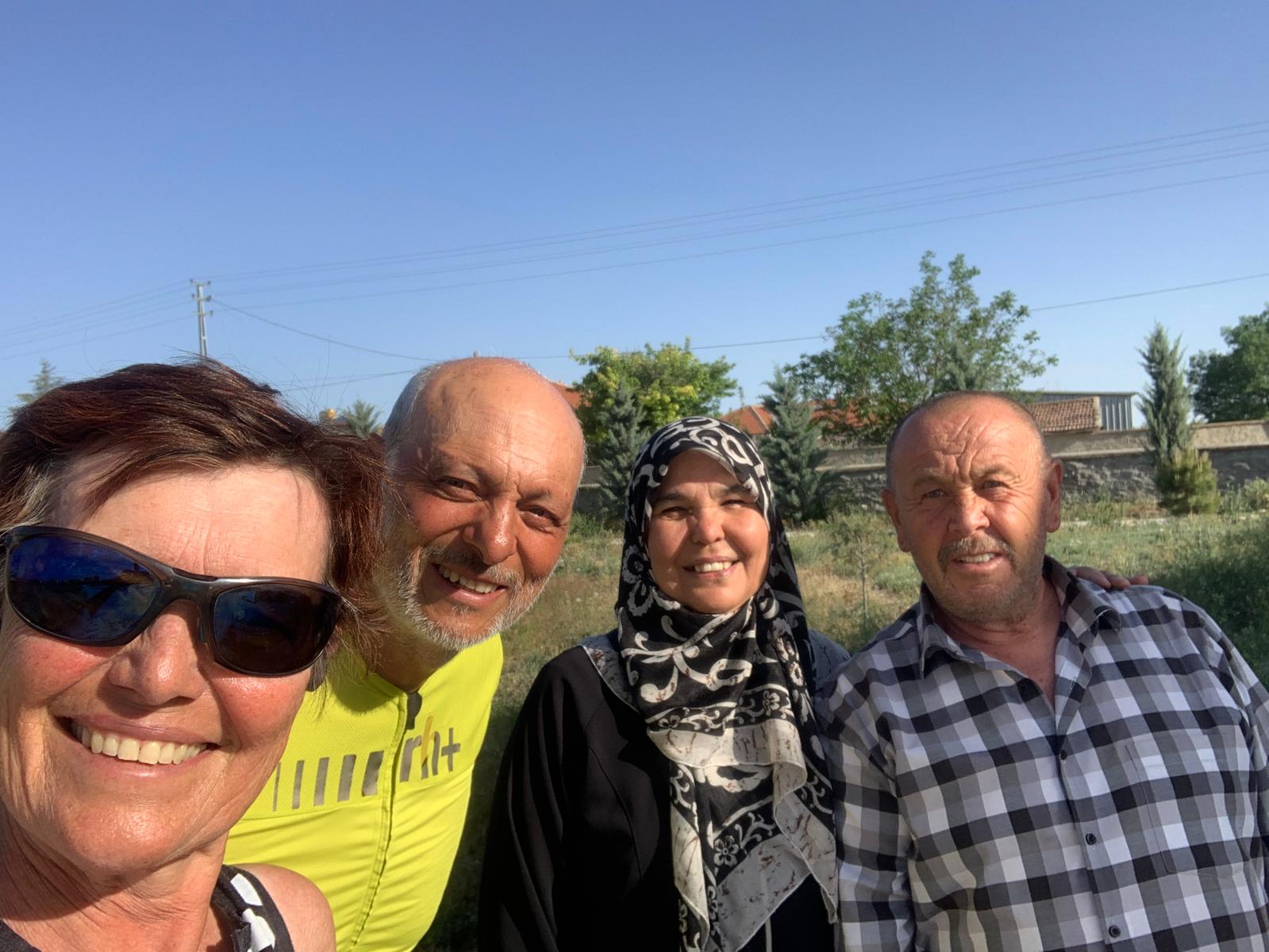 Dès que l’on quitte notre ville étape Eskişehir, le paysage change radicalement. Un grand plateau très ouvert, une végétation rase, et quelques ondulations de relief. C’est très beau. Les villages aussi sont différents, plus austères, pas de commerce, ni de café, plus de place du village et donc personne dehors. Comment va-t-on faire pour trouver des bon plans pour les bivouacs ? Mais surtout, il faut que l’on s’approvisionne en eau et nous n’avons pas croisé un seul commerce de toute la journée. Nous arrivons dans le village que j’avais visé pour la nuit, toujours pas d’eau en vue, et nos gourdes sont vides. Nous croisons un paysan avec ses vaches, nous lui demandons s’il sait où nous pouvons planter notre tente. Et ensuite la routine. Voici sa réponse : vous me faites l’honneur de venir jusque chez moi, vous êtes donc mon invité, venez manger chez moi, on verra ensuite pour la nuit. Il appelle sa femme et en arrivant nous avons droit à la chorba, une sauce yaourt concombre, une ratatouille succulente et du halva (une pâte sucrée à base de sésame) et le chay. Incroyable, et il est seize heures ! Il me dit ensuite, veux-tu aller voir mes vaches, bien sûr j’y vais. Un kilomètre plus loin, voilà les vaches en train de paître. En fait, le but était de les ramener à la ferme, sauf que cela se fait en fonction du bon vouloir de mesdames les vaches, qui ont toujours un bout d’herbe sympa à brouter. Cela nous laisse le temps de deviser, sur pas mal de sujets. Deux heures plus tard, nous rentrons. Pendant ce temps Doum faisait la papote avec sa femme, ses filles et des cousines. Finalement, il nous met à disposition, une petite maison en cours d’aménagement qui sert de débarras. Mais c’est parfait pour nous.