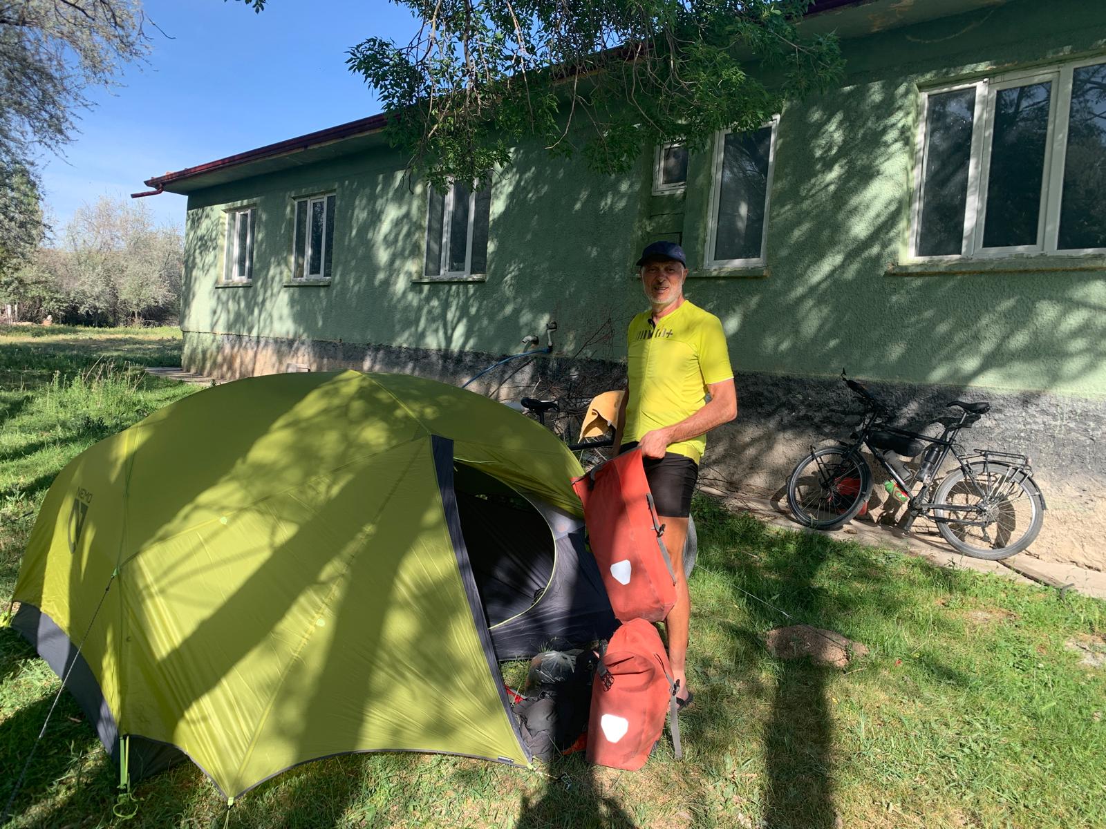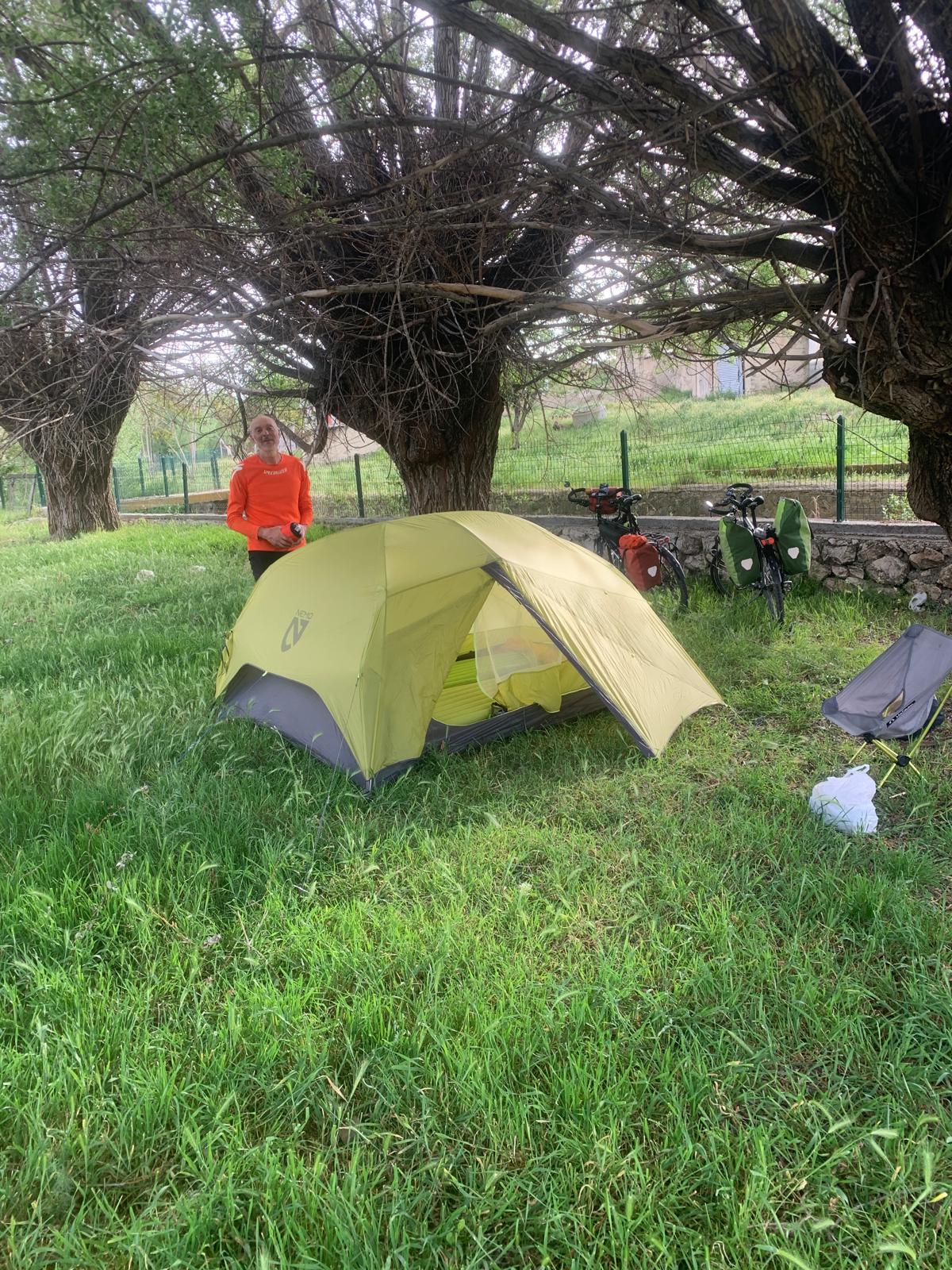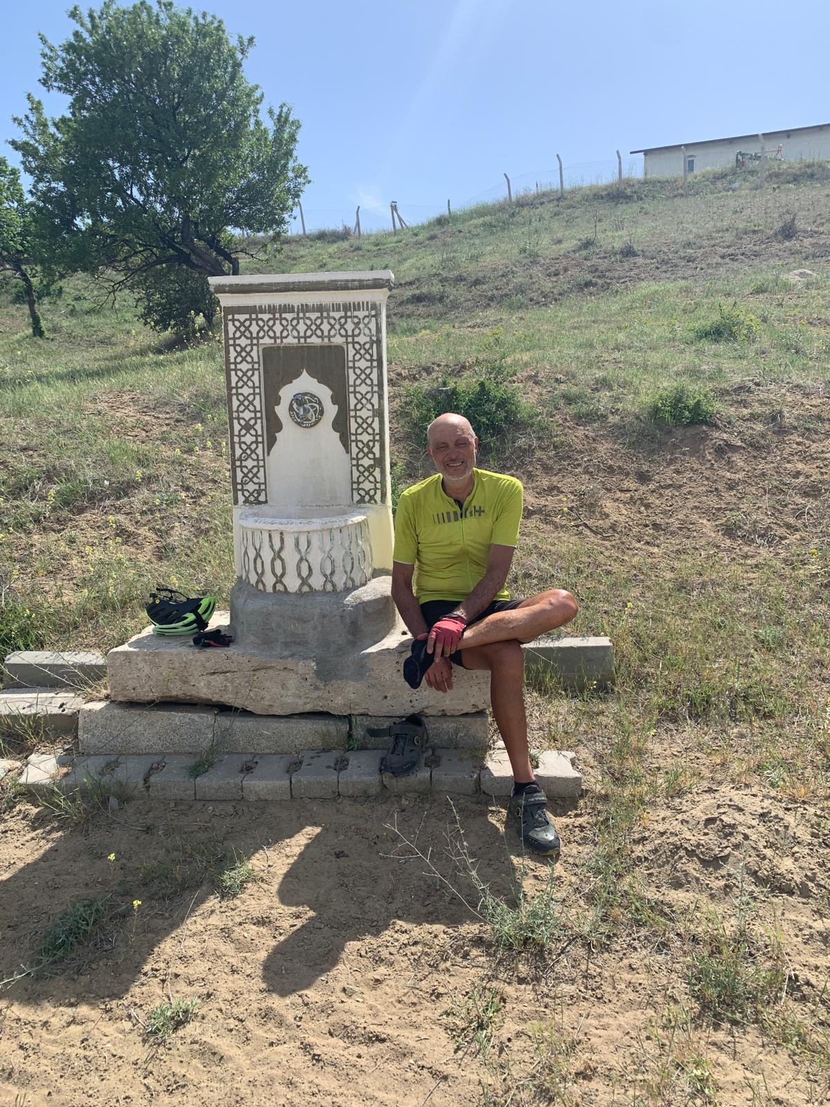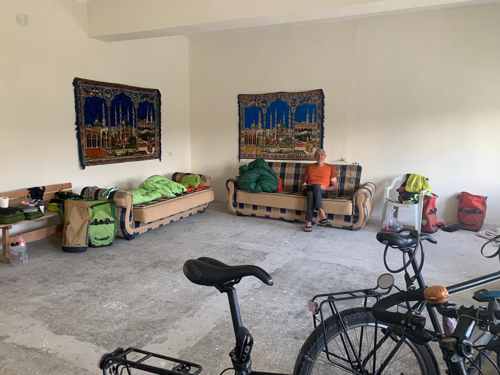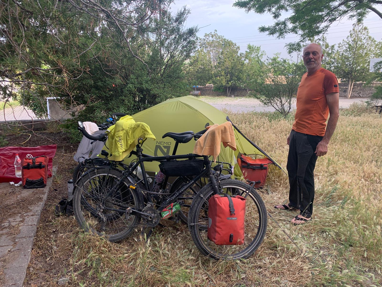 Cette fois nous partons avec plus d’eau que la veille, environ cinq litres. Malgré les nombreux markets annoncés aujourd’hui, nous ne voulons pas prendre de risque. La sensation d’hier, gourdes vides, assoiffés, dépendants d’un market potentiel dans dix kilomètres, n’était pas très agréable. Toujours de beaux paysages, et peu avant notre étape de Kirkkuyu, ça devient quasi désertique. Arrivé à destination, nous faisons plusieurs tours du village, sans rencontrer âme qui vive. On se dit qu’en restant près de la mosquée, on finira par tomber sur un bon musulman qui va faire sa prière. Une heure plus tard, enfin l’appel du Muezzin retentit, et encore bien vingt minute plus tard, ça marche ! Nous alpaguons quelques fidèles, ils nous indiquent une espèce d’espace vert clôturé que l’on avait repéré sans oser y entrer. En prime, il y a de l’eau et des toilettes ! Pendant que nous montons la tente, un des hommes revient avec sa femme pour nous offrir à manger des succulents beignets aux légumes, de l’eau et des biscuits. Puis, alors que nous installons les matelas, un autre homme arrive et nous demande de le suivre. Il ouvre le bâtiment au milieu du parc et nous dit qu’on peut s’y installer. Il y a une grande pièce avec deux canapés-lit, une cuisine, et il y fait frais. Même si cela devient plus compliqué, l’incroyable hospitalité turque est toujours là