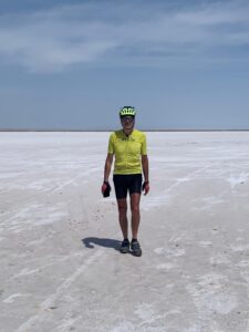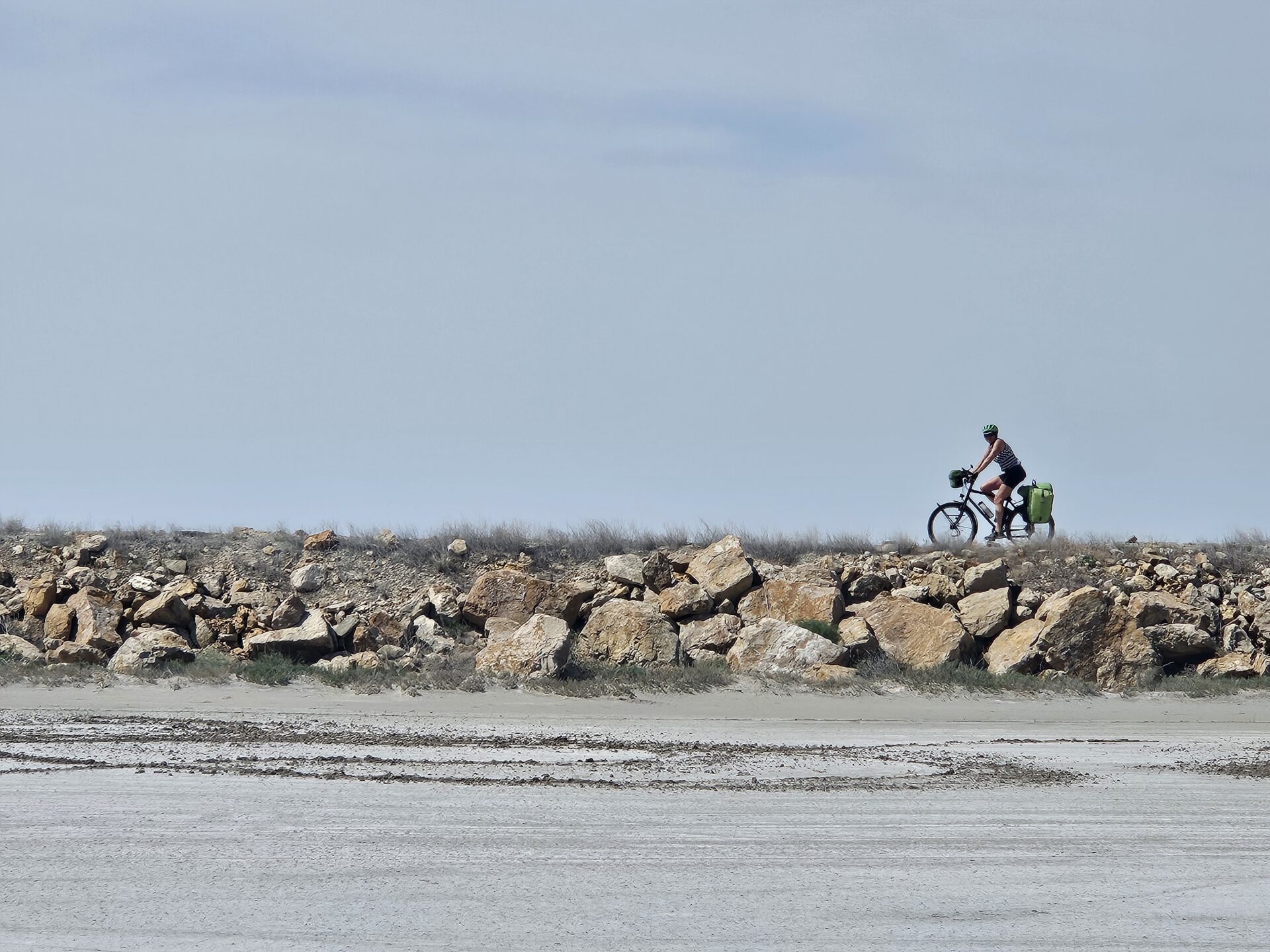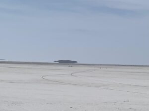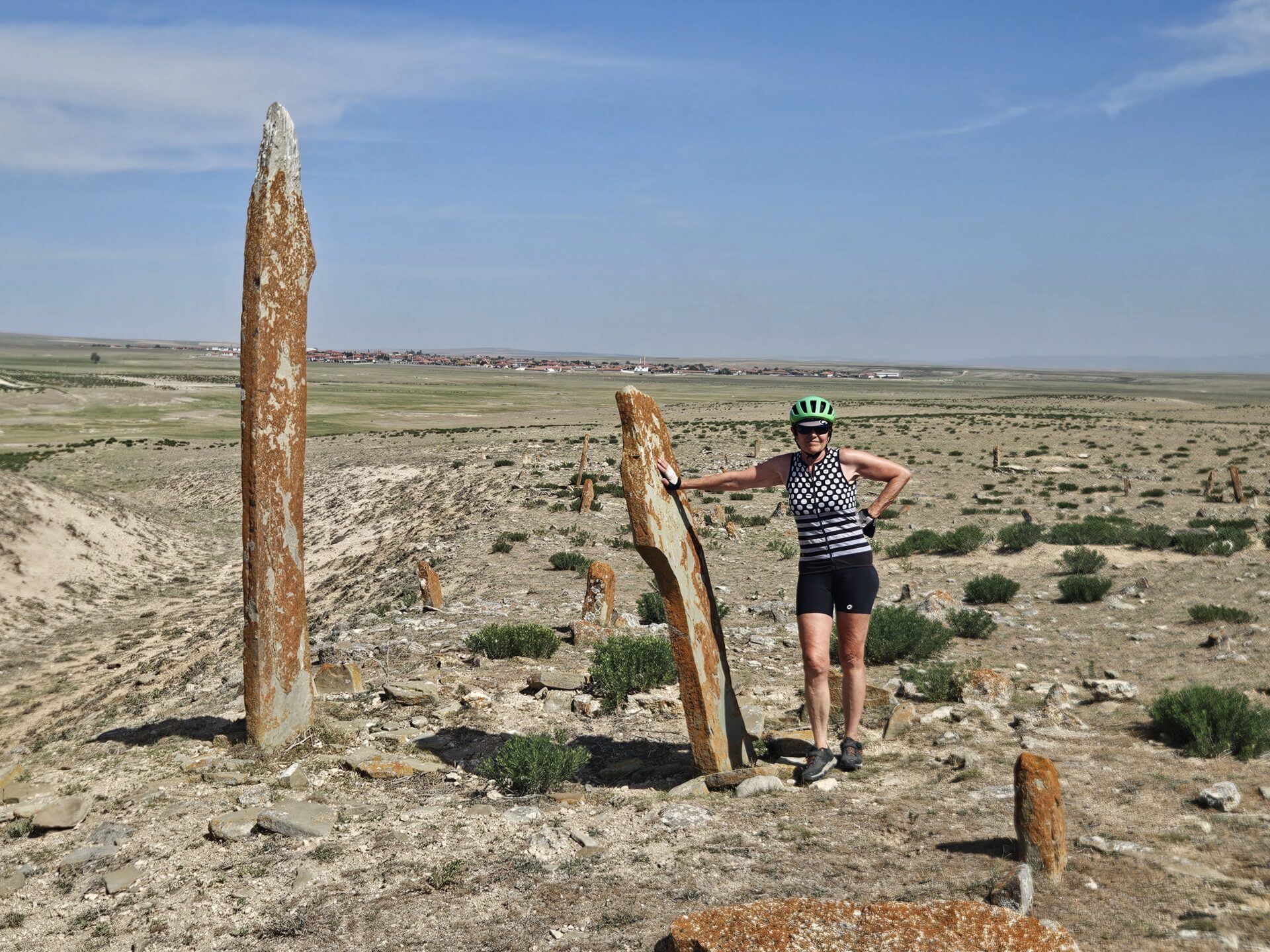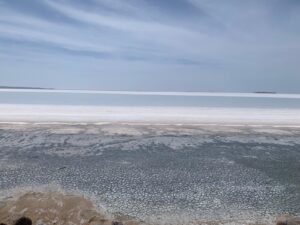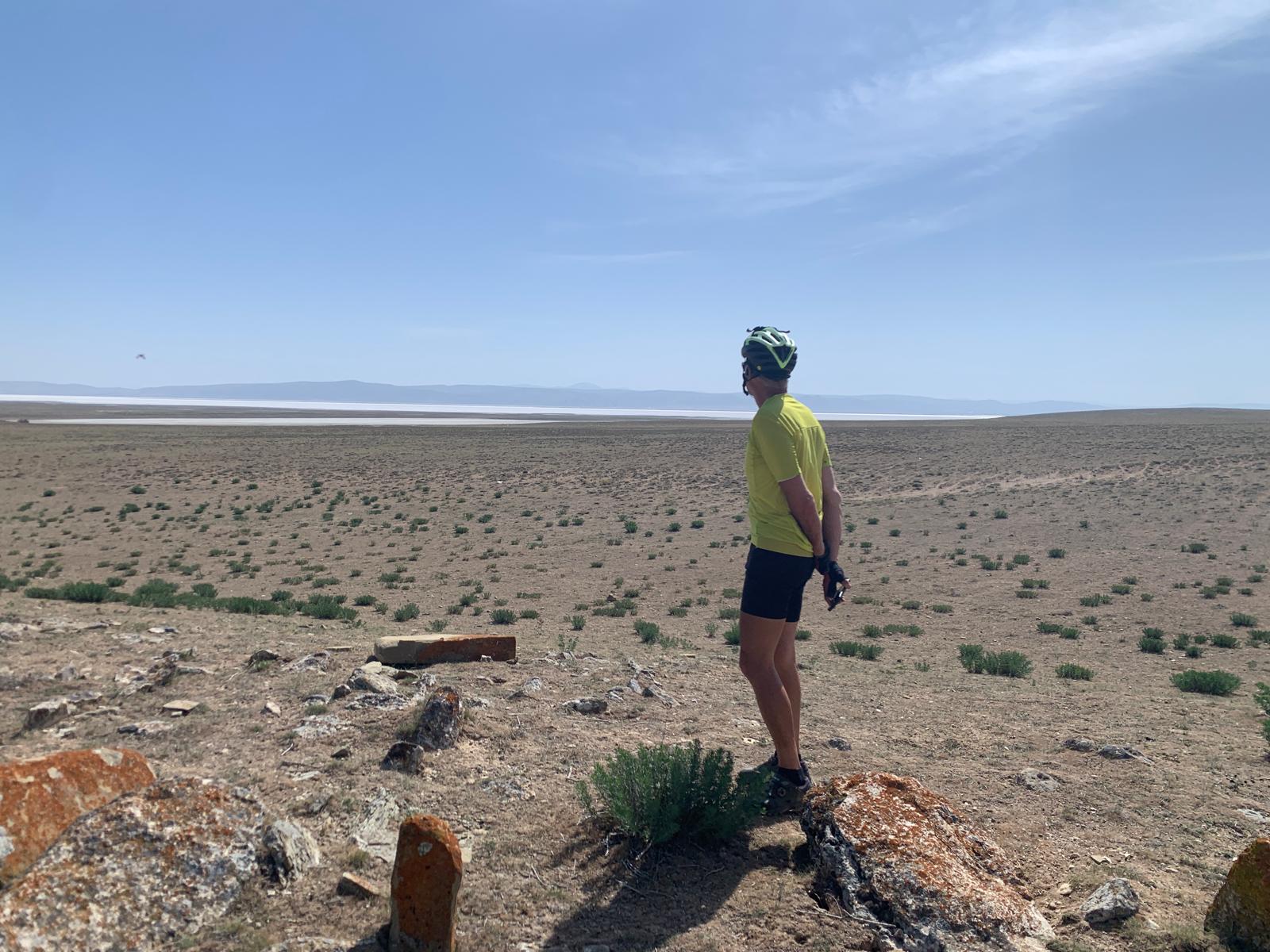Nous atteignons un site assez connu en Turquie, le Tuz Gölü qui signifie lac salé. C’est le deuxième plus grand lac de Turquie, en hiver. Car en été l’eau s’évapore presque complètement, laissant apparaître une épaisse couche de sel. 70% du sel consommé en Turquie vient d’ici. Nous faisons quelques tours de roue sur le lac. C’est marrant, ça s’enfonce un peu mais on peut rouler sans trop patiner. Le lac est vraiment immense et comme on peut s’en douter c’est très lumineux. Juste avant, nous passons devant un site de pierres levées.
