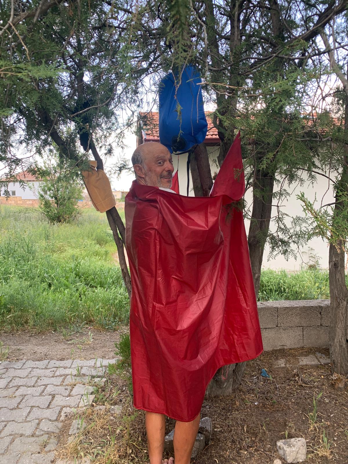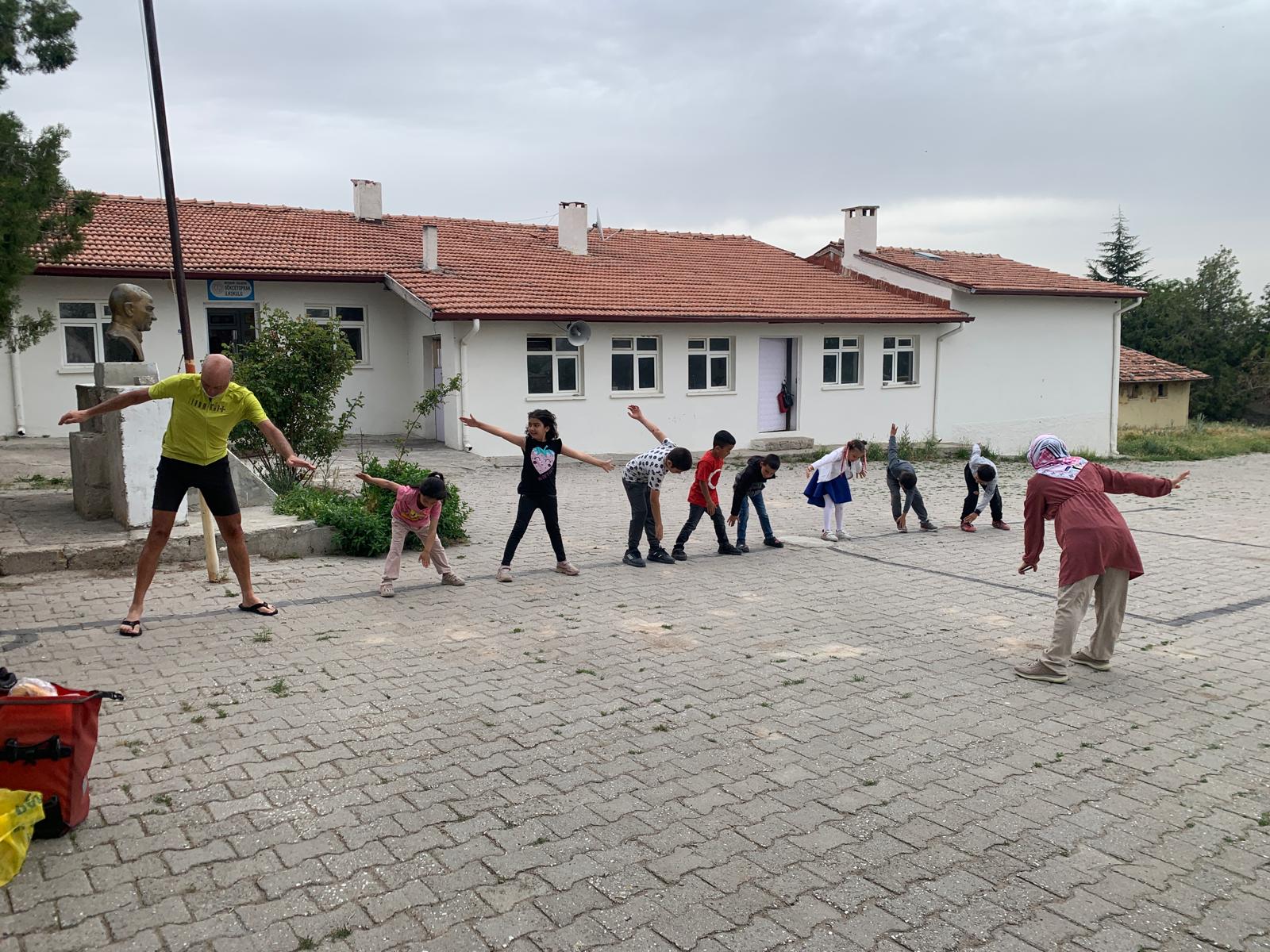 Que se passe-t-il ? Cela fait deux soirs que nous ne sommes pas invités, réduits à bivouaquer ! On s’est très vite habitués à l’hospitalité turque. Les deux fois nous avons choisi des jardins d’enfants présents dans tous les villages. Nous préférons les villages car on y trouve de la verdure des arbres et de l’eau, plus la possibilité de se faire inviter ! Dans la campagne, il n’y a pas d’ombre, on cuirait en attendant la nuit. Pour nous laver, nous remplissons la vache à eau, soit dans les fontaines assez nombreuses, soit à proximité des mosquées où il y a toujours un point d’eau pour les ablutions. Pour prendre une douche sans être vu, j’essaye de fixer le tapis de sol qui, nous sert pour les pique-niques, autour de l’arbre qui supporte la vache à eau. C’est parfois un peu sport, mais ca fait trop de bien après une journée sous le soleil. L’inconvénient des villages est le bruit, de deux natures, les chiens très bavards la nuit et les muezzin qui braillent maintenant à quatre heures et demi le matin ! Ce matin nous avons vu arriver des enfants toujours plus nombreux. En fait nous avons bivouaqué dans une école primaire ! Nous avons papoté avec les institutrices, très intéressées par notre histoire. Les cours commencent toujours par l’hymne national chanté au garde à vous devant le buste d’Atatürk. Les institutrices nous ont demandé de nous mettre au garde à vous nous aussi. Nous nous sommes donc exécutés.
