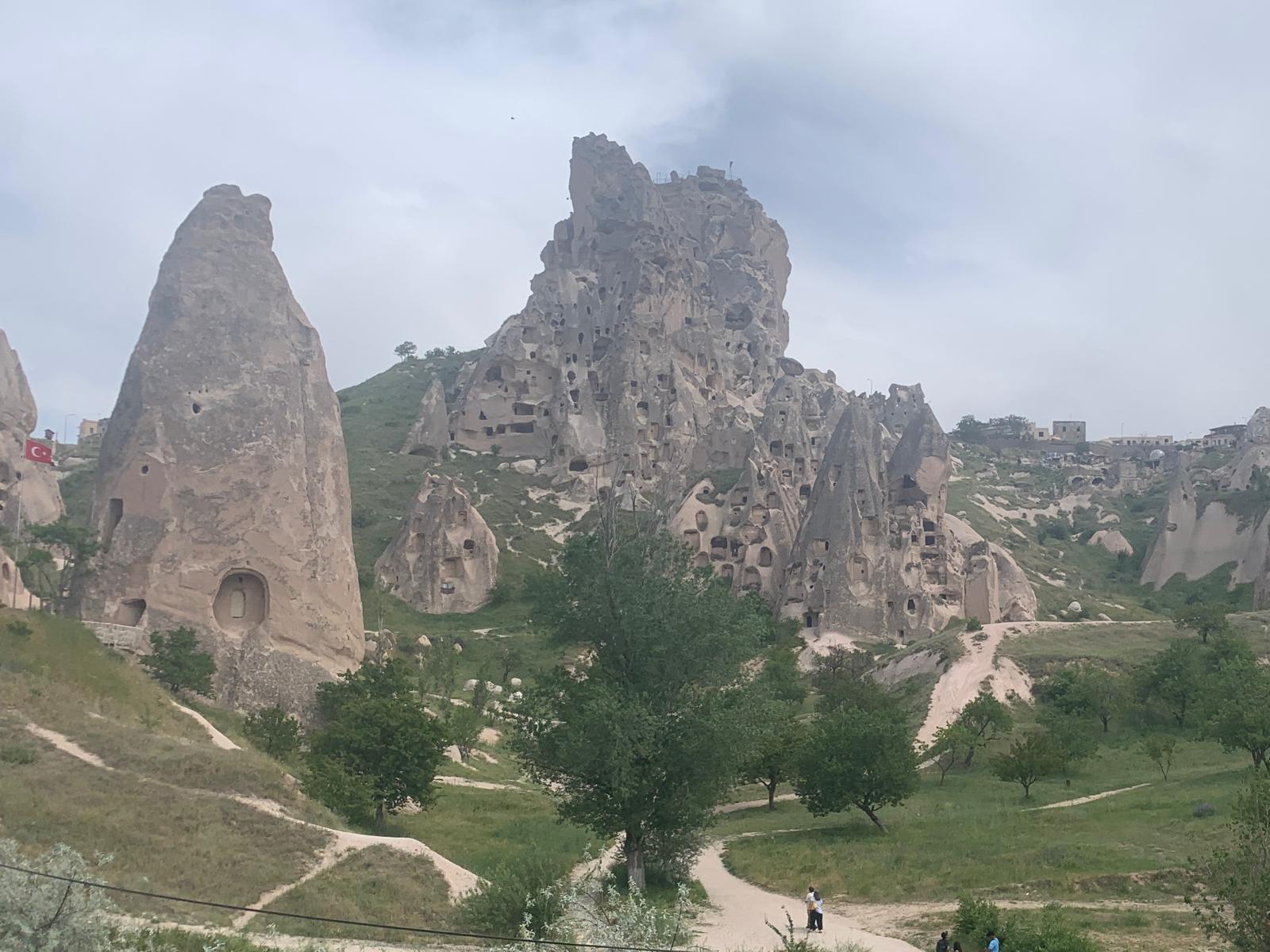 Puis par une chaude journée, nous rejoignons Göreme en Cappadoce, un des sites les plus emblématique et touristique de Turquie. Nous en avons eu un petit aperçu avant d’arriver, c’est vraiment un spectacle incroyable et unique. Cela fait huit jours que nous pédalons non stop avec pas mal de bivouacs, et surtout la chaleur nous fatigue. Nous sommes arrivés complètement cuits. Nous allons nous arrêter au moins deux jours voire plus pour nous requinquer. Si vous voulez voir des photos de ce site unique, ne manquez pas notre prochain article. En voici juste un aperçu.