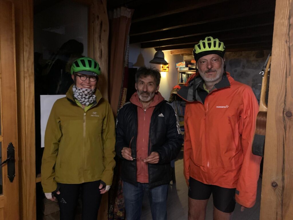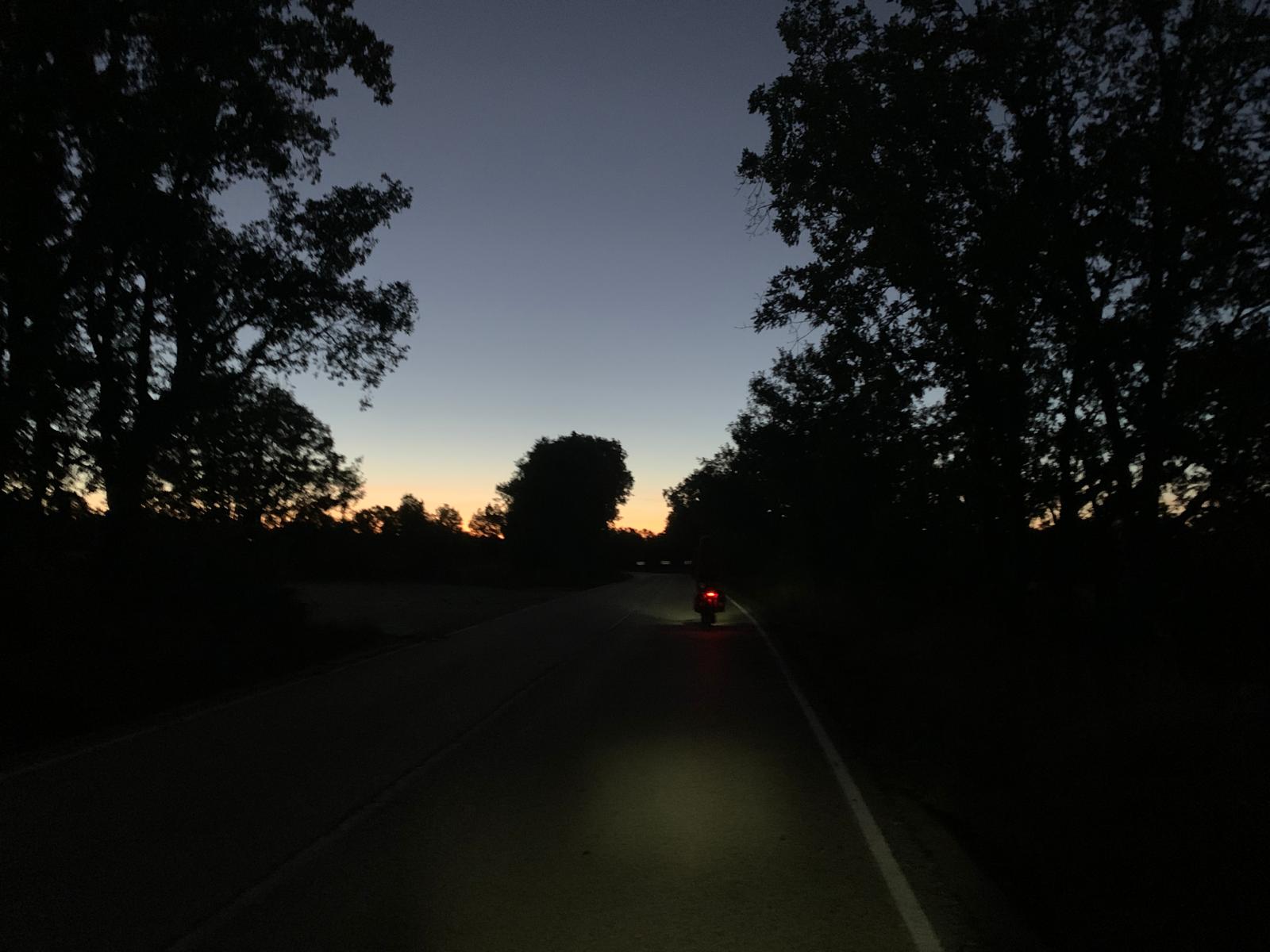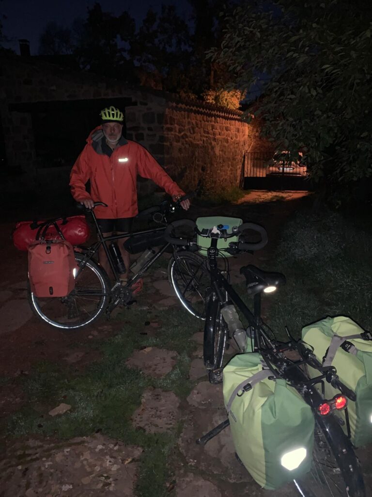 Ce matin nous sommes mis dehors par notre hôte peu après 7h30, pourtant nous n’avons rien fait de mal, nous nous sommes bien tenus. Mais on oublie vite que la plupart des gens travaillent (quelle drôle d’idée) ou vont à l’école. Donc nous nous retrouvons sur notre vélo, dans la nuit par 3 degrés, à pédaler, pas vraiment réveillés. Là on se demande si quelque chose ne tourne pas rond dans notre tête, car personne ne nous oblige, c’est nous qui avons décidé d’être là ! Après la première descente, je suis congelé, je n’avais pas réalisé qu’il faisait si froid, mon compteur a mis du temps à se caler sur la bonne température. Je sors vite mes jambes et mes gants. Puis rapidement, le spectacle du lever de soleil, les couleurs qui se révèlent, la campagne qui s’illumine progressivement, la chaleur qui revient petit à petit, nous rassurent, nous ne sommes pas si timbrés, nous savons pourquoi nous sommes là.