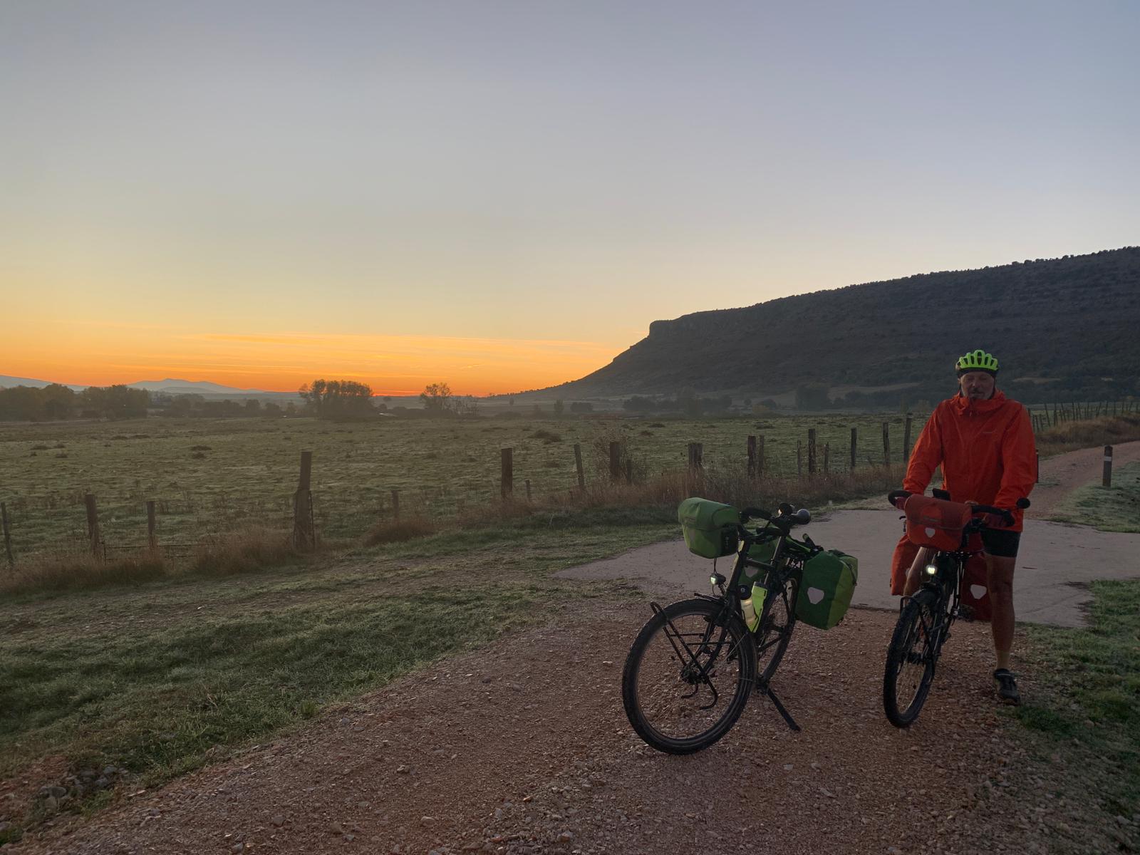 Ce matin nous sommes mis dehors par notre hôte peu après 7h30, pourtant nous n’avons rien fait de mal, nous nous sommes bien tenus. Mais on oublie vite que la plupart des gens travaillent (quelle drôle d’idée) ou vont à l’école. Donc nous nous retrouvons sur notre vélo, dans la nuit par 3 degrés, à pédaler, pas vraiment réveillés. Là on se demande si quelque chose ne tourne pas rond dans notre tête, car personne ne nous oblige, c’est nous qui avons décidé d’être là ! Après la première descente, je suis congelé, je n’avais pas réalisé qu’il faisait si froid, mon compteur a mis du temps à se caler sur la bonne température. Je sors vite mes jambes et mes gants. Puis rapidement, le spectacle du lever de soleil, les couleurs qui se révèlent, la campagne qui s’illumine progressivement, la chaleur qui revient petit à petit, nous rassurent, nous ne sommes pas si timbrés, nous savons pourquoi nous sommes là.