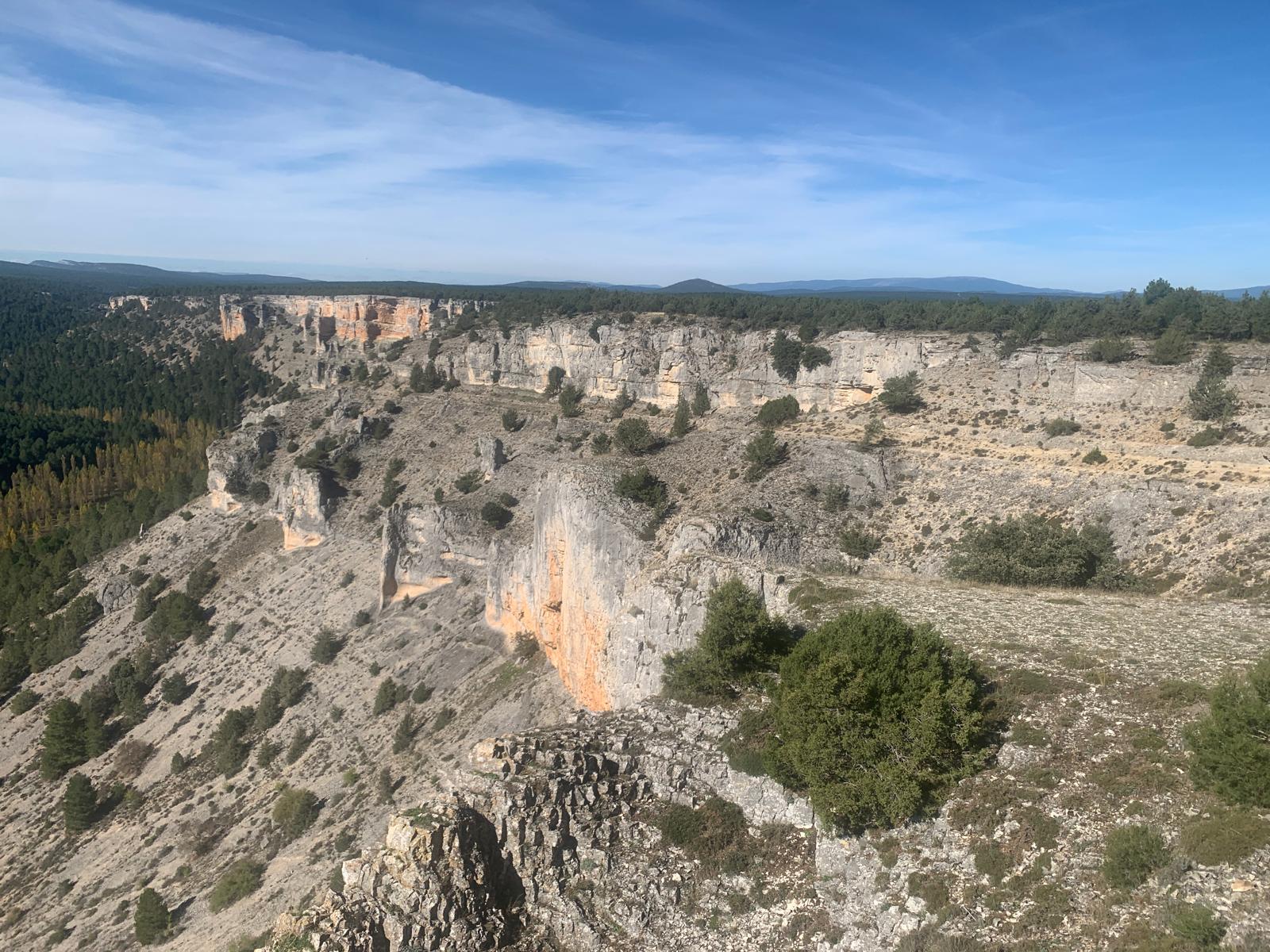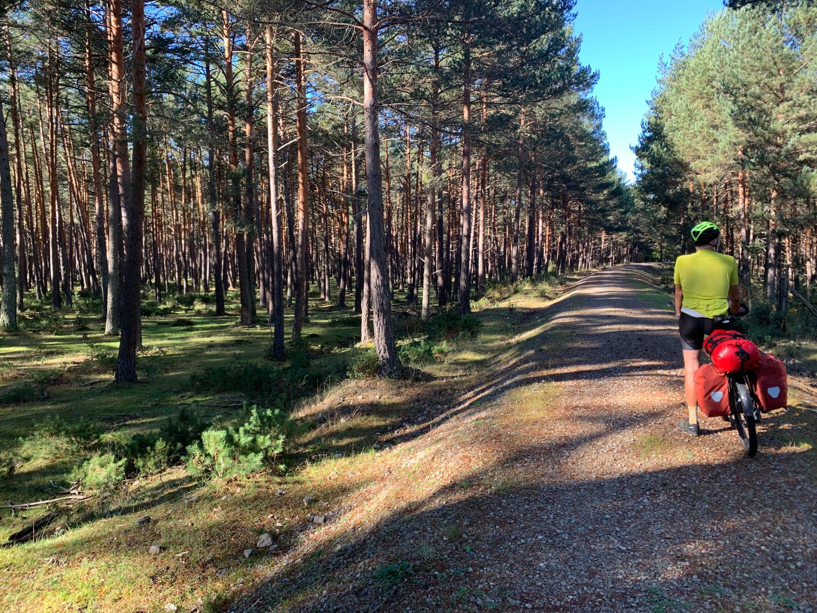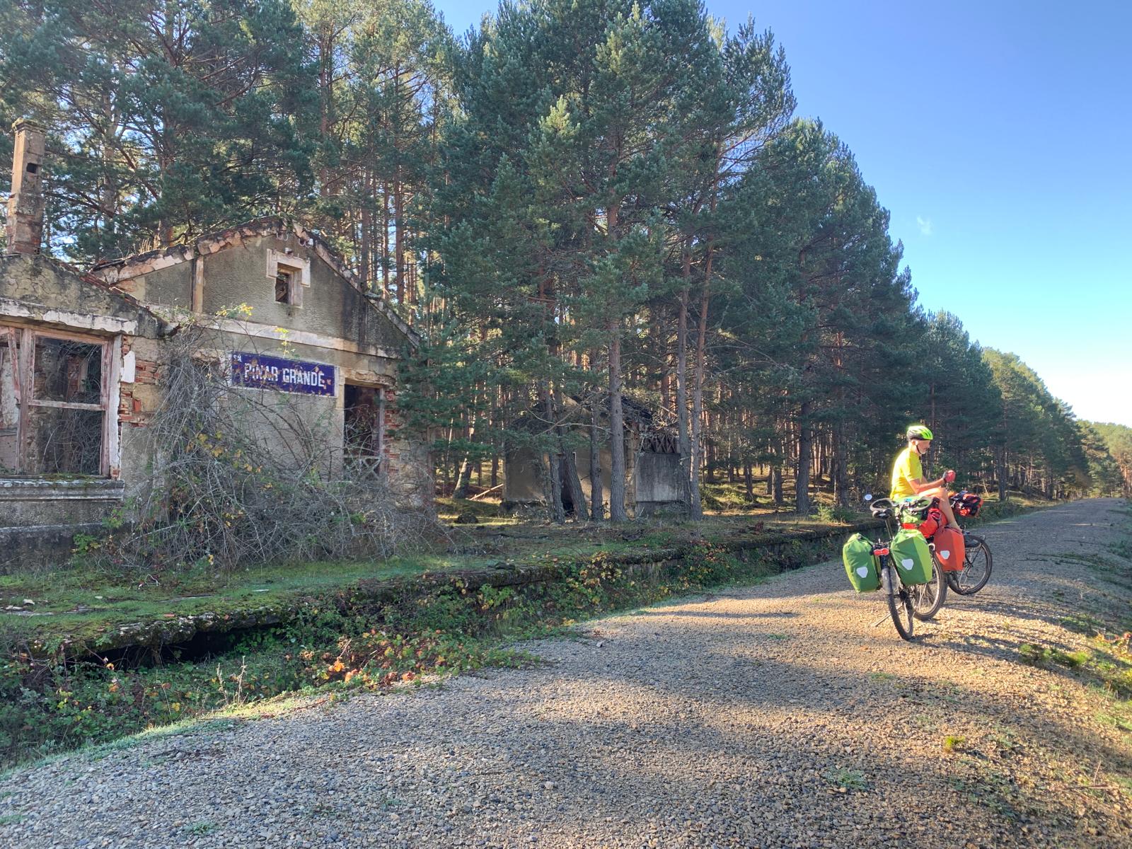 La via verde nous amène assez vite dans le Parc naturel du canyon Rio lobos. C’est vrai que c’est très beau. Nous commençons dans une forêt bien verte, les zones denses alternent avec les prairies. Parfois les vaches traversent en prenant leur temps, elles nous font comprendre qu’elles sont chez elles, alors nous patientons. Les petites gares abandonnées se succèdent dans des états de délabrement variés. Autour de nous, il y a pas mal de relief, mais nous sommes protégés par la voie de chemin de fer, ses remblais et ses tranchées, pas plus de 1% dans les côtes, ça change !