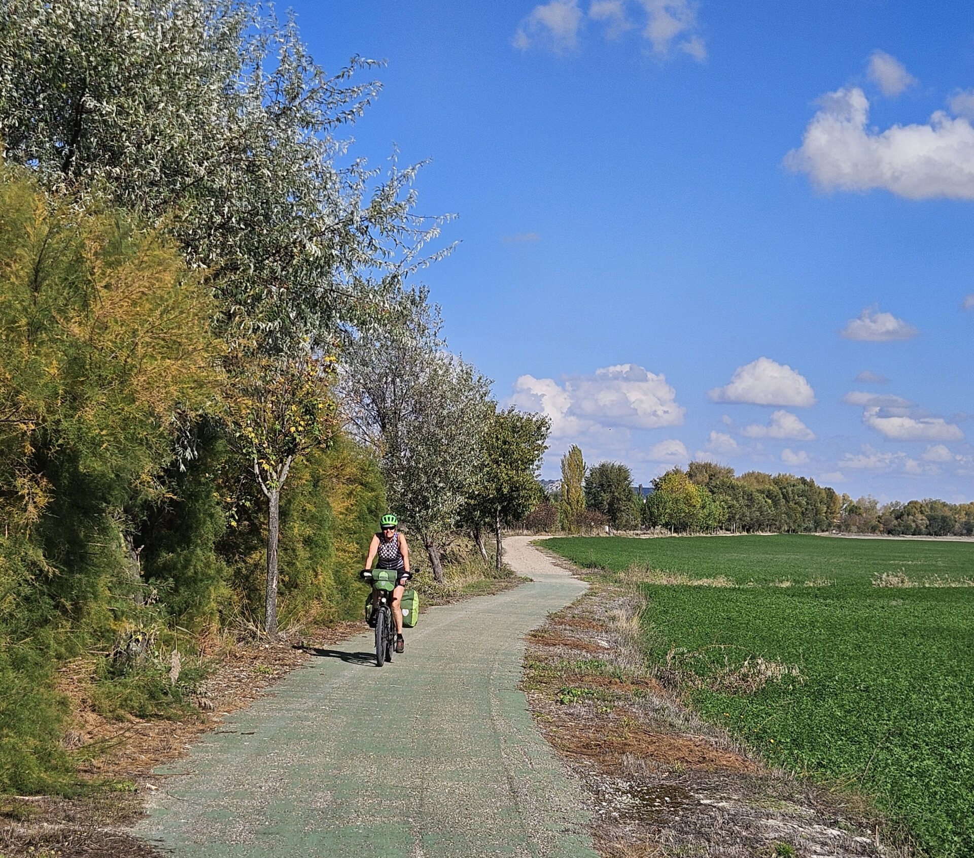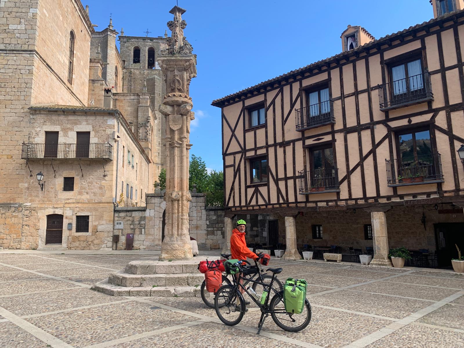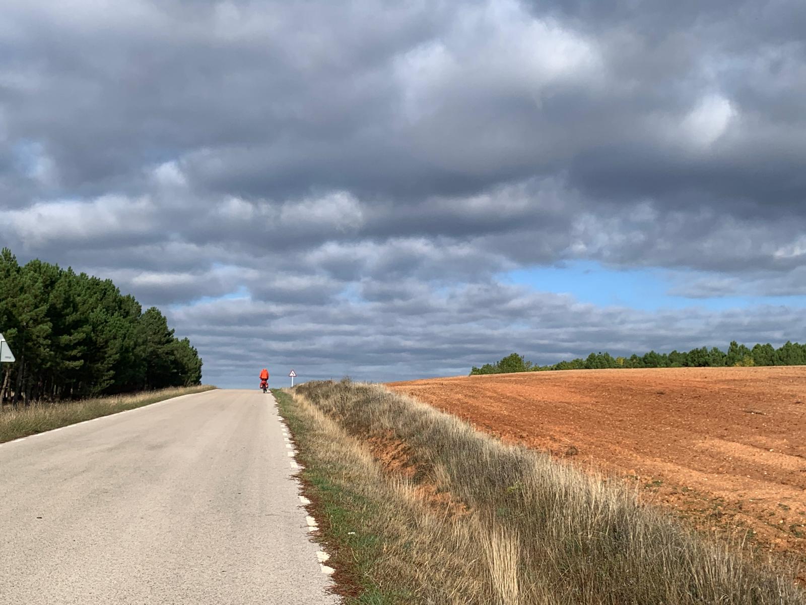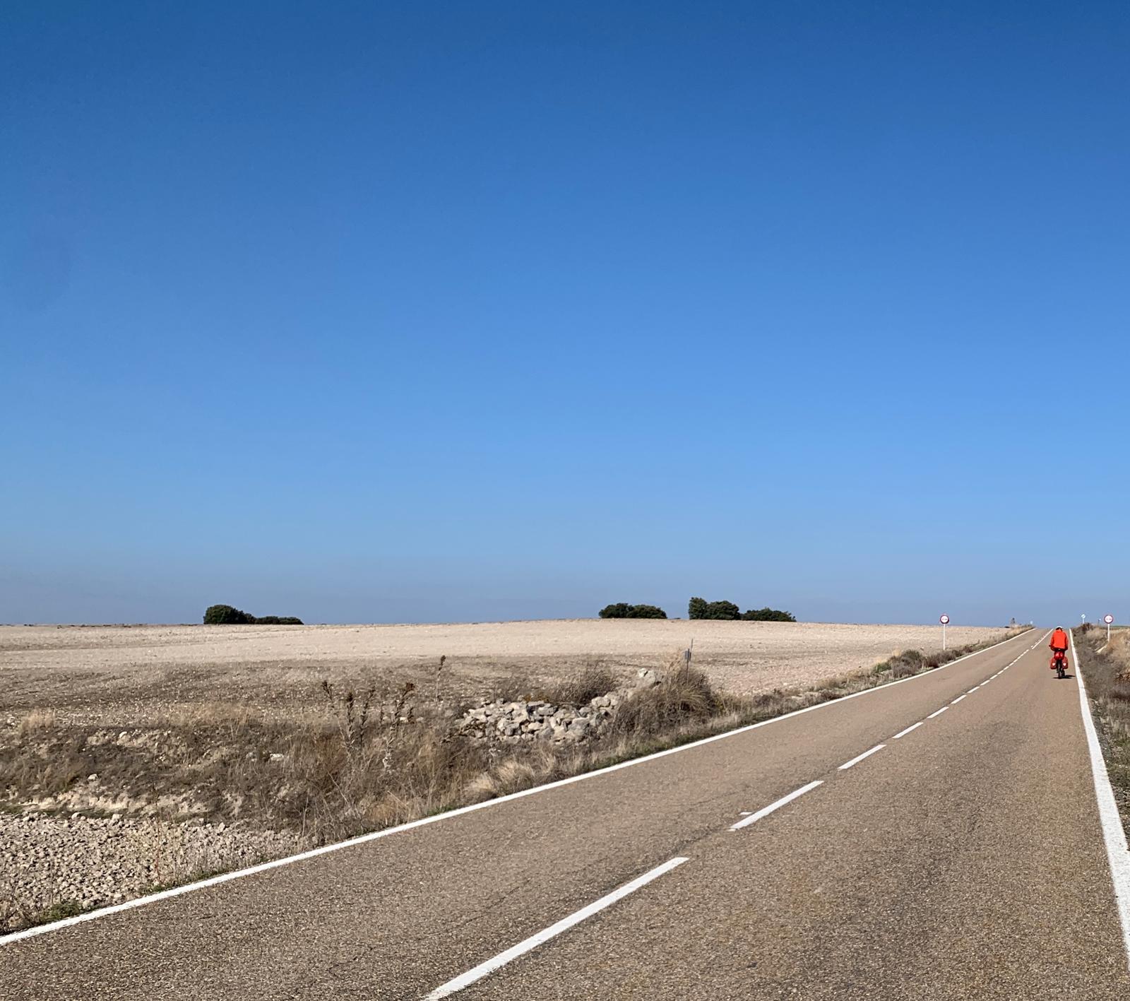 Nous nous dirigeons ensuite vers Valladolid, où nous ferons une journée de repos après six jours de pédalage, une première pour ce genou en titane. Nous naviguons sur un plateau avec de belles couleurs. Et c’est plutôt en descente sur deux jours. Nous faisons des moyennes affolantes avec nos poids lourds, 21 km/h sur plus de 80 km, du jamais vu !
