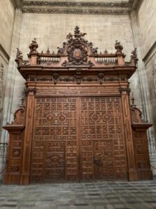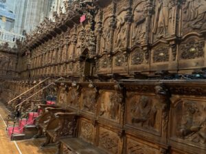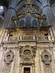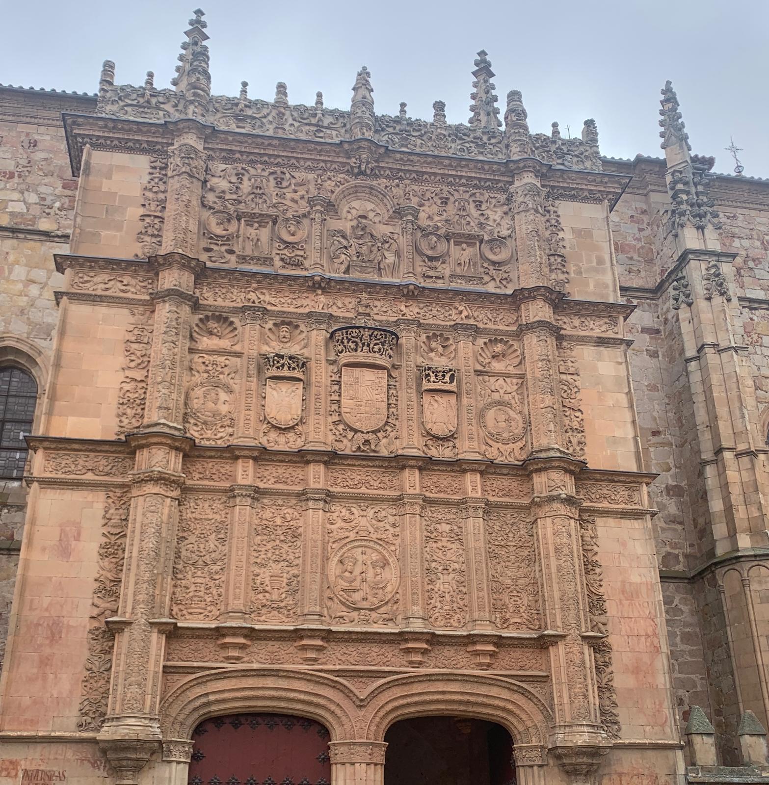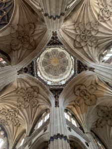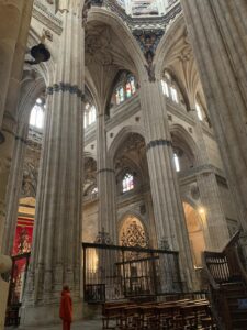 Salamanque est une ville étonnante, le centre ville est une succession d’édifices grandioses, très ouvragés qui témoignent d’une grande richesse passée. Églises, cathédrales, plus tous les palais de l’université. La cathédrale est monumentale mais très belle. En fait on a deux cathédrales pour le prix d’une. Au 16ème siècle on décide d’ériger une nouvelle cathédrale, celle du 12ème devait être trop petite. (Surtout, elle devait être plus petite que celle des voisins). Comme on se doute que les travaux vont durer un peu, en fait deux siècles, on décide de garder l’ancienne alors que la nouvelle se construit sur le même site. Ca permet de continuer l’office autre part que dans des algecos. Donc les deux cathédrales sont imbriquées, une partie de l’ancienne sert de support à la nouvelle. Lors la visite, quand on croit avoir fini, hop on passe dans une deuxième cathédrale plus petite mais complète. Ils sont fous ces ibères !