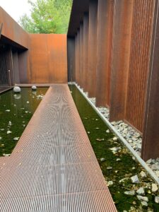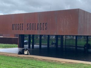A Rodez, nous avons juste le temps, entre deux bourrasques, d’aller visiter le musée Soulages, l’enfant du pays. Nous visionnons des vidéos marrantes de Soulages, lors de la conception des vitraux de l’abbaye de Conques. Il s’interroge pendant des heures pour savoir s’il doit abaisser de 3 millimètres ou non les joints entre deux éléments de vitrail, c’est précis. Il est également l’inventeur de l’outre noir, le reflet de la lumière au delà du noir.
