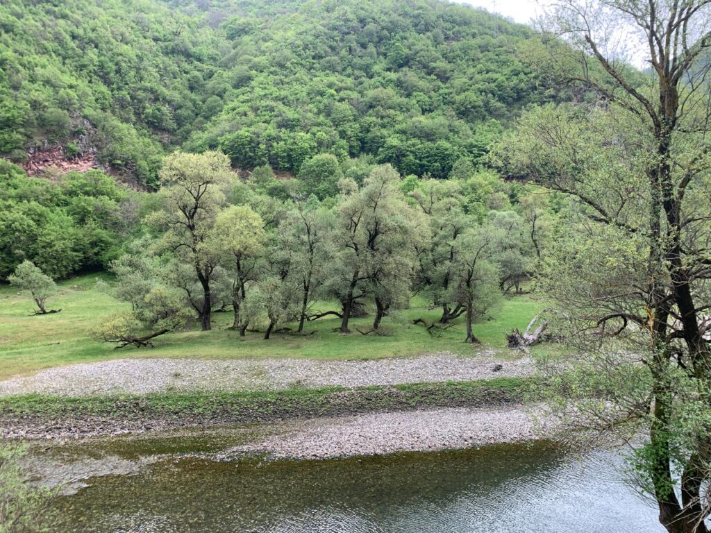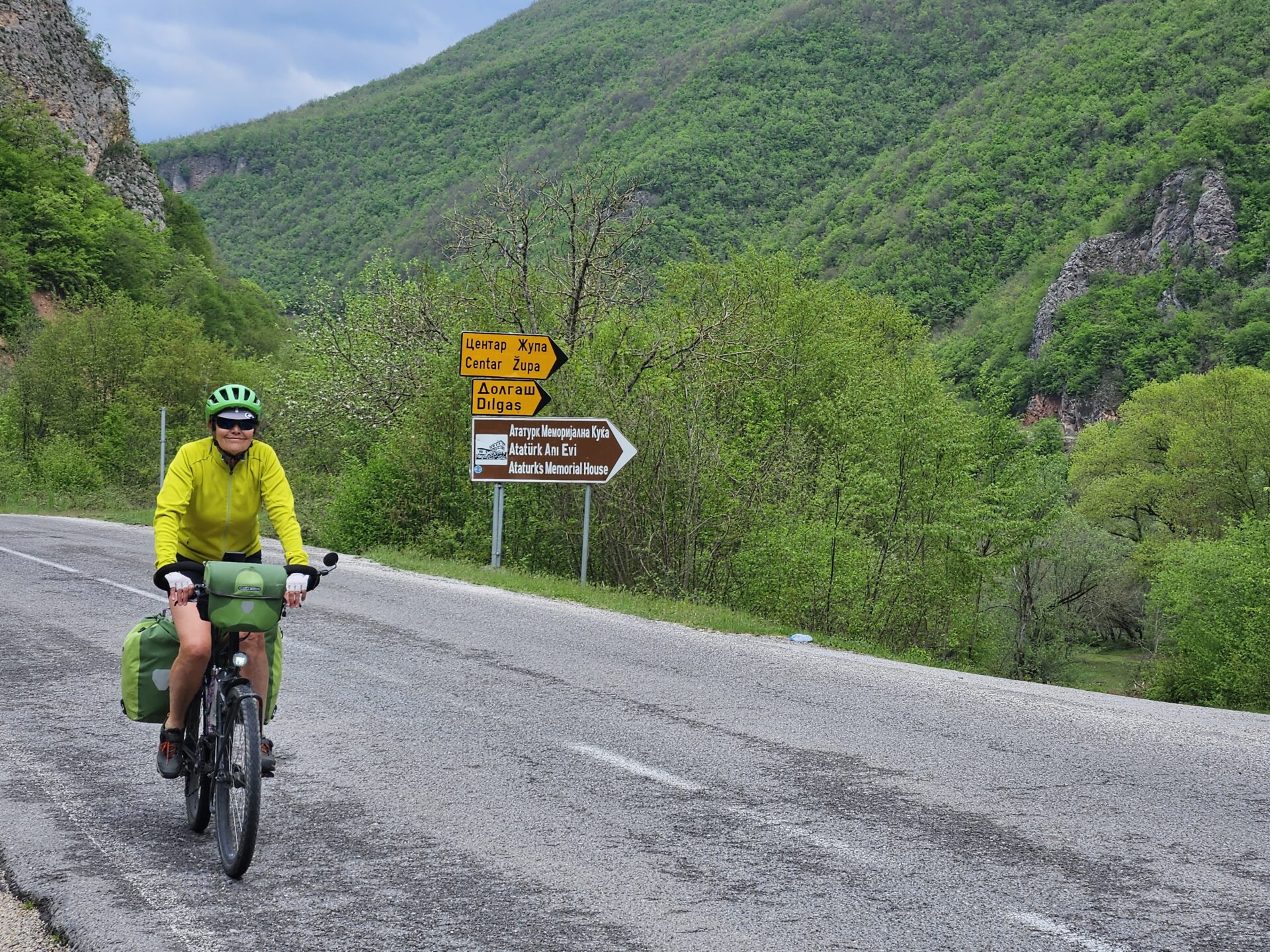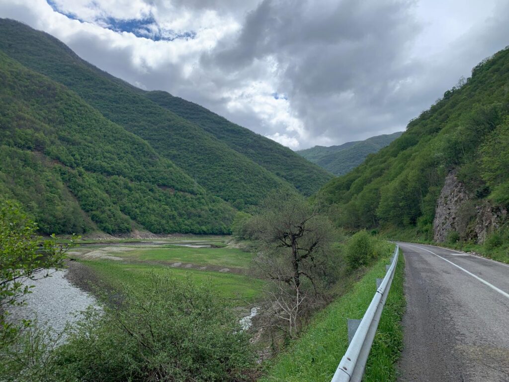 Nous voici maintenant en Macédoine, également un des pays les plus pauvres d’Europe. Il est peuplé de macédoniens, albanais, turcs et roms. Les deux langues officielles sont le macédonien et l’albanais. Une particularité est que si une commune compte plus de 20% d’une ethnie, sa langue peut être langue officielle. Ainsi ce pays possède la seule commune au monde dont la langue officielle est le rom. C’est un pays montagneux, couvert de forêts avec de nombreux lacs. Nous sentons dans les villes que nous sommes à la frontière entre orient et occident. Il y a toujours un minaret pas loin d’un clocher. Nous voyons plus de femmes voilées qu’en Albanie y compris les jeunes. Lors de notre première nuit, nous avons été réveillés par le muezzin vers cinq heures du matin. J’avoue que dans mon lit j’ai pensé à Jean Dujardin, mais je n’ai pas bougé 🙂. Pour l’instant, les villes que nous traversons ne sont pas très belles, les constructions sont un peu anarchiques, de nombreux chantiers sont abandonnés, beaucoup de maisons neuves très bling bling avec des colonnades, des dorures et toujours des gros SUV allemands.