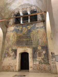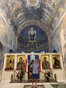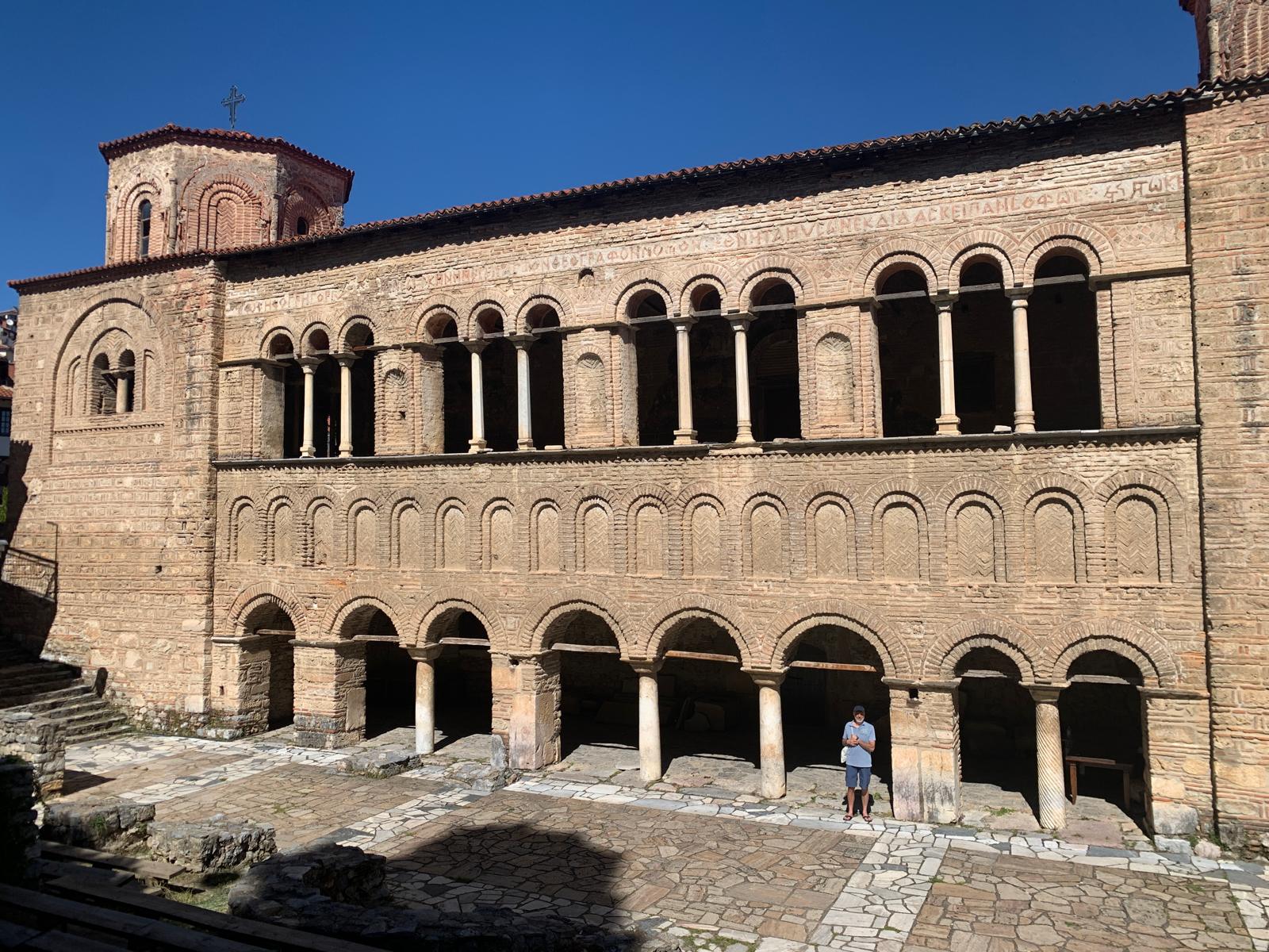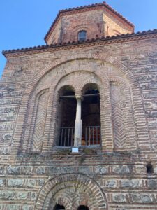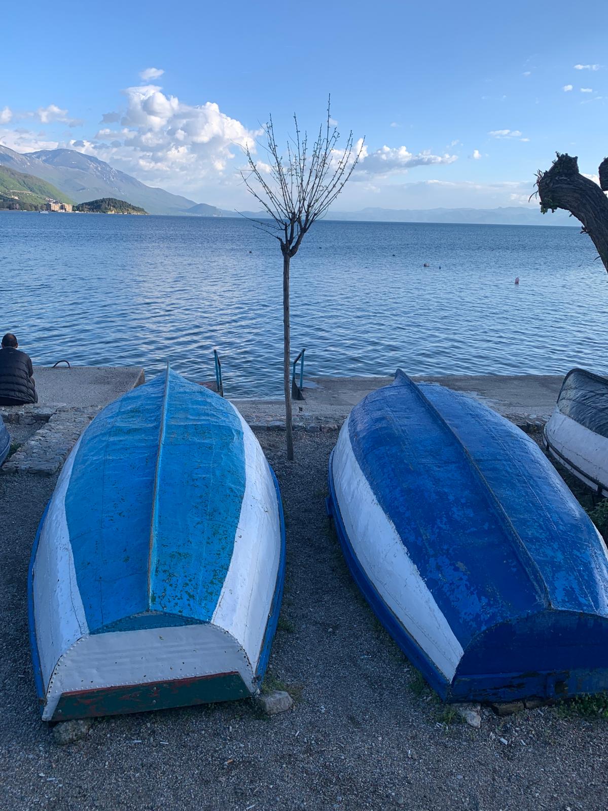 Nous faisons une pause à Ohrid, station balnéaire sur les bords du lac du même nom et première ville touristique du pays. Elle est classée au patrimoine mondial de l’UNESCO. La vieille ville est plutôt sympa, et les vues du lac avec les montagnes au loin sont très belles. Nous dégottons un restaurant local où nous nous régalons de plats qui sentent l’influence grecque, tsatsikis, houmous, salade grecque, aubergines farcies. Nous en profitons pour apprendre trois mots de macédonien. Plus facile que l’albanais, c’est une langue slave mais teintée de bulgare, et elle s’écrit en cyrillique. Cette langue est aussi parlée dans certaines régions d’Albanie et de Grèce. Cette région des balkans est décidément un mélange incroyable.