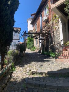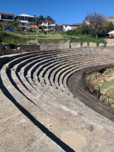 .Nous continuons notre traversée de la Macédoine du Nord (c’est le nom officiel du pays) vers l’est. Nous passons deux cols et nous apercevons des sommets enneigés. Nous avons suivi une petite route sympa, mais au revêtement changeant, parfois bon, parfois délabré avec même une portion pavée à l’ancienne. Le soir nous atterrissons à Bitola dans un appartement pas cher, mais dans son jus de l’époque Tito, je suppose. Dans la salle de bain, pas de zone de douche, le pommeau est branché sur le lavabo, l’écoulement se fait par terre entre toilette et lavabo. Ca marche très bien, mais difficile de ne pas inonder la pièce. Ça nous change, car jusque là, indépendamment du prix, les chambres ou appartements étaient toujours neufs avec un équipement au standard européen.