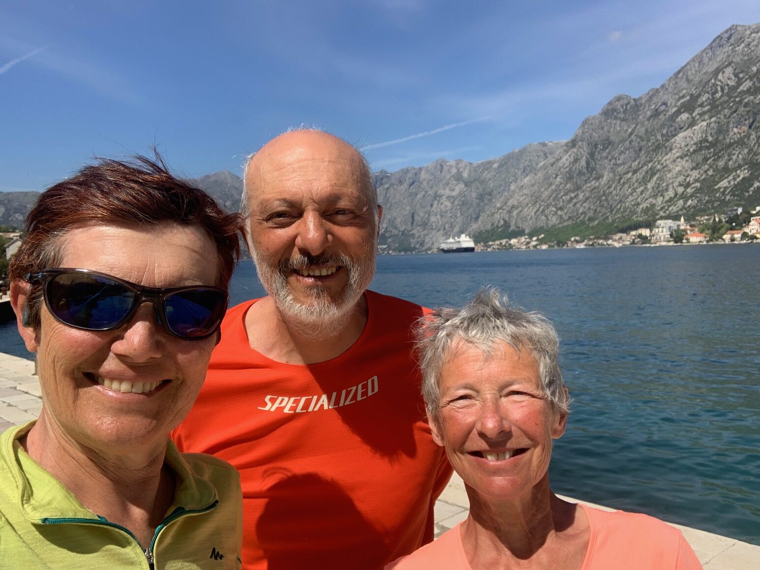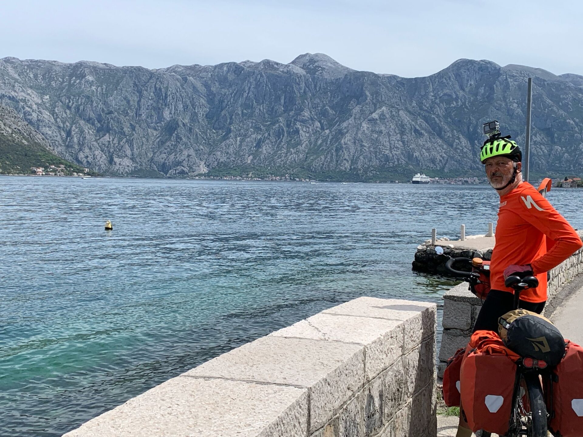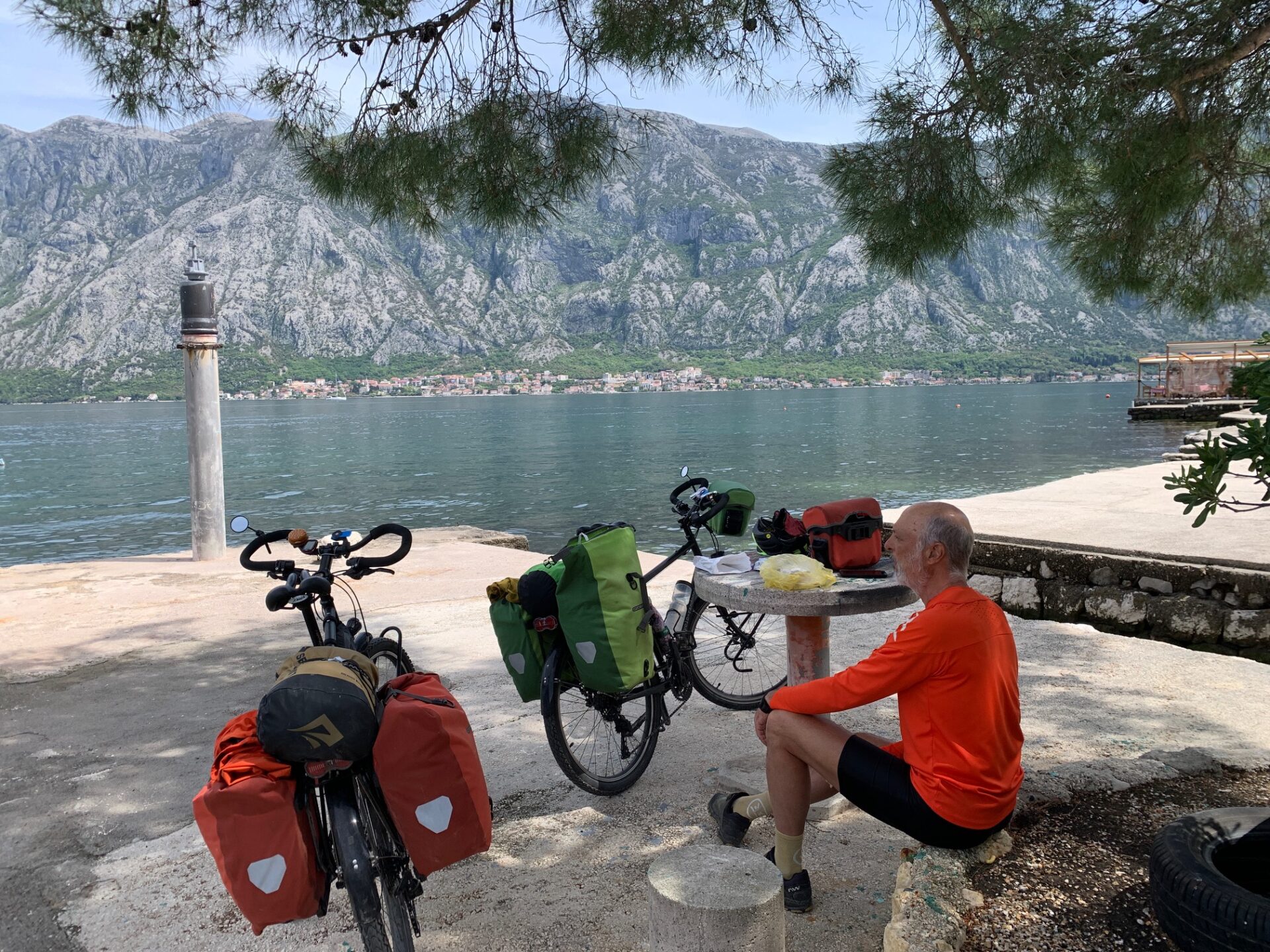 Aujourd’hui, une petite journée de tourisme dans les bouches de Kotor, une des plus belles baies du monde dixit Wikipedia. Heureusement la route du bord de mer qui nous mène à la ville de Kotor, au fond de la baie est toute petite, donc parfaite pour les vélos, nous pouvons apprécier le paysage. Dommage, avant que nous atteignions Kotor, un bateau de croisière énorme (neuf étages) arrive et déverse sa cargaison de touristes qui suivent leur guide avec chacun son numéro. C’est un peu l’émeute dans la vieille ville aux rues étroites. On commence à sentir l’influence ottomane, par exemple un petit bazar, comme il y en a beaucoup en Turquie. Et aussi nous retrouvons Anne-Marie qui fait un tour complet des bouches dans le sens inverse du notre. Demain nous devrions nous retrouver dans un camping après l’ascension de la route serpentine qui attaque la montagne pour monter à l’étage du dessus, mille mètres plus haut.