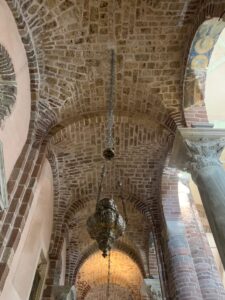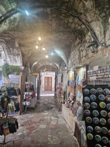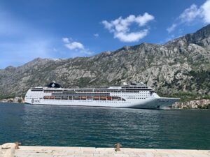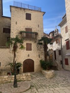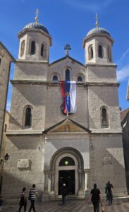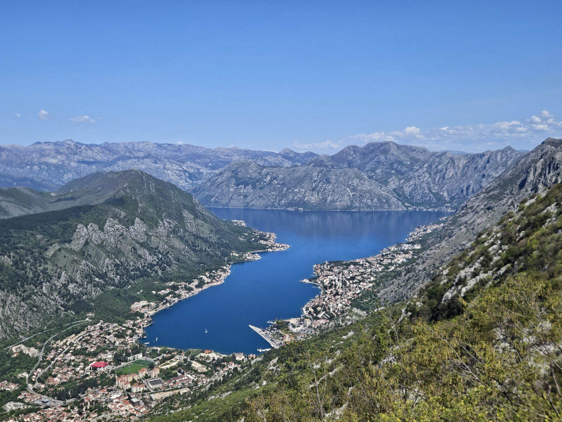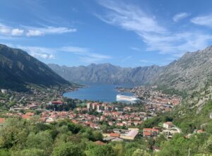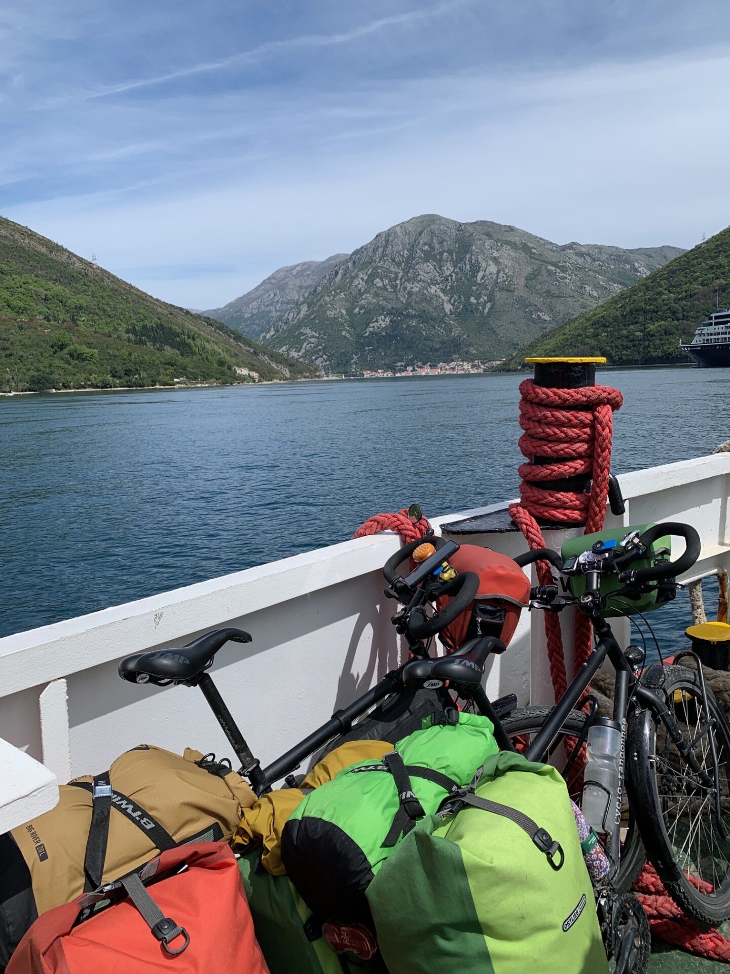 Aujourd’hui, une petite journée de tourisme dans les bouches de Kotor, une des plus belles baies du monde dixit Wikipedia. Heureusement la route du bord de mer qui nous mène à la ville de Kotor, au fond de la baie est toute petite, donc parfaite pour les vélos, nous pouvons apprécier le paysage. Dommage, avant que nous atteignions Kotor, un bateau de croisière énorme (neuf étages) arrive et déverse sa cargaison de touristes qui suivent leur guide avec chacun son numéro. C’est un peu l’émeute dans la vieille ville aux rues étroites. On commence à sentir l’influence ottomane, par exemple un petit bazar, comme il y en a beaucoup en Turquie. Et aussi nous retrouvons Anne-Marie qui fait un tour complet des bouches dans le sens inverse du notre. Demain nous devrions nous retrouver dans un camping après l’ascension de la route serpentine qui attaque la montagne pour monter à l’étage du dessus, mille mètres plus haut.