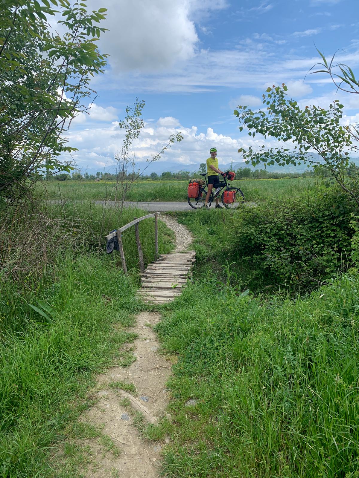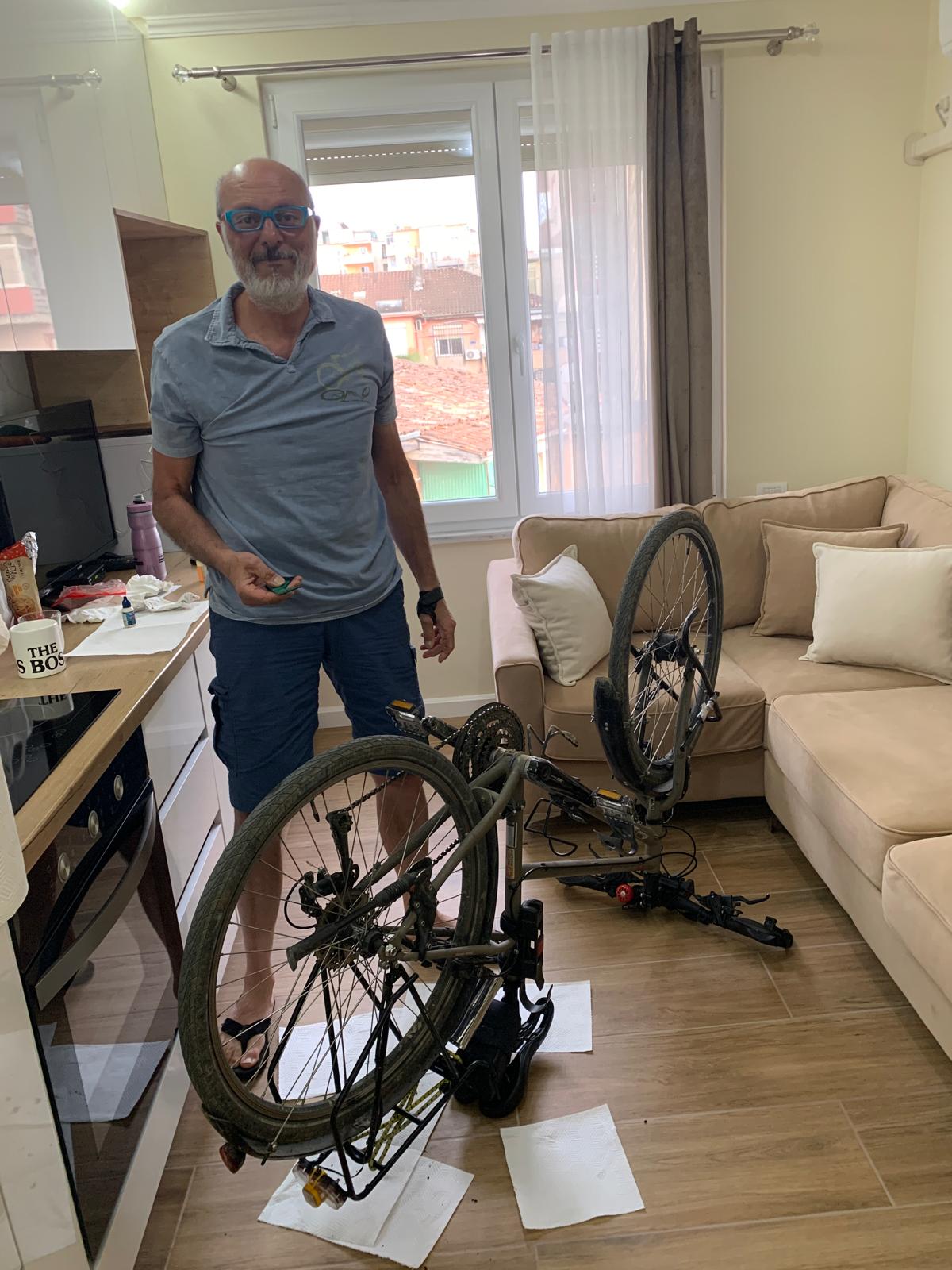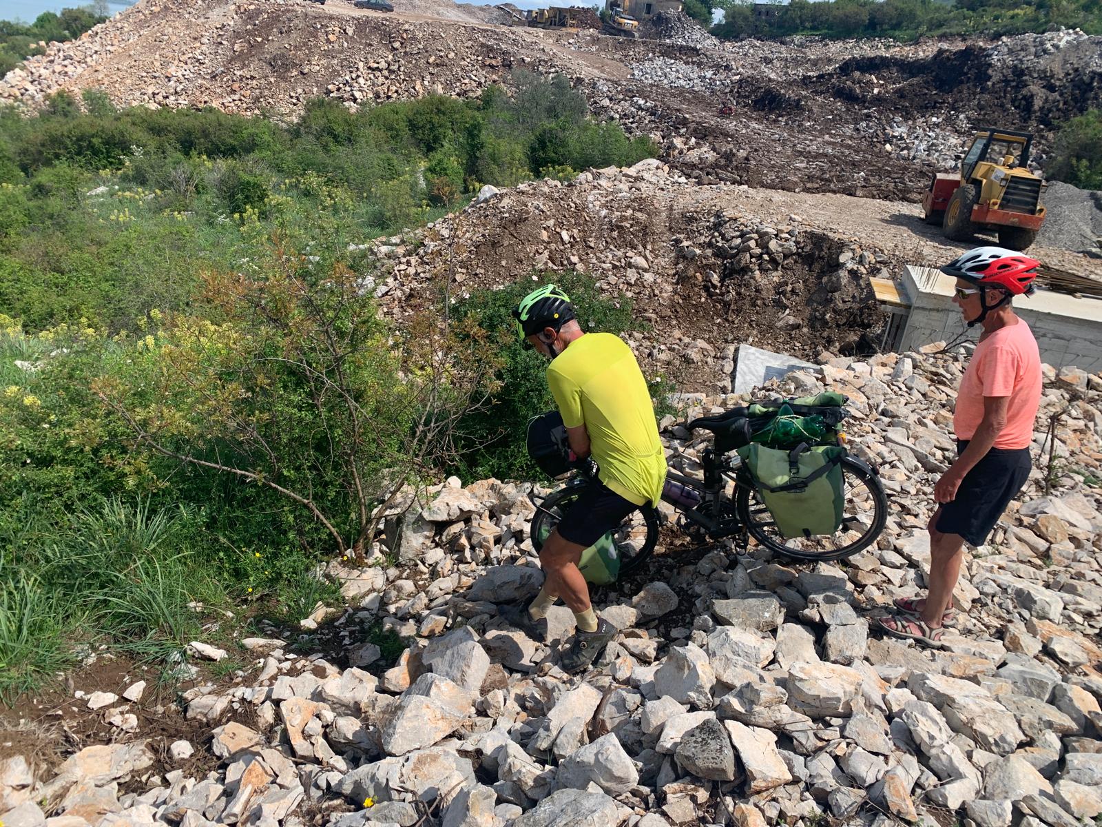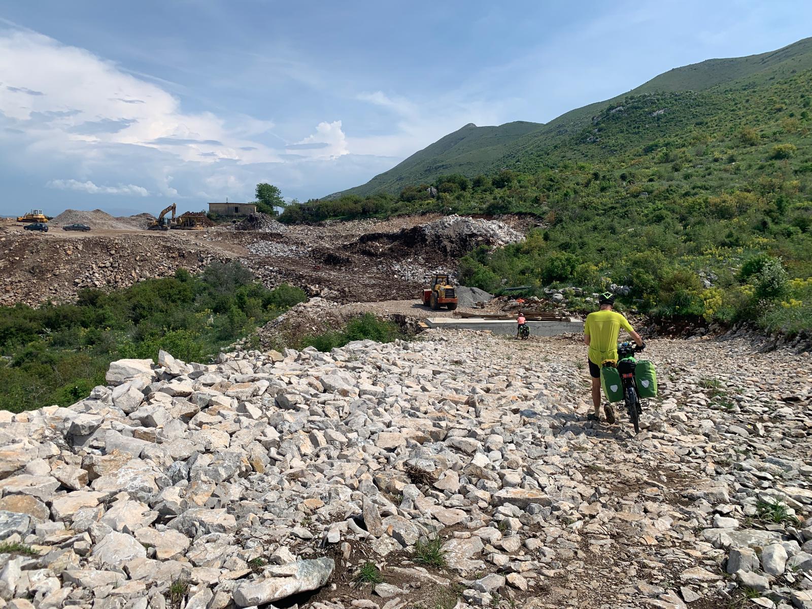 Nous continuons de longer le grand lac de Skadar qui est frontalier avec l’Albanie, notre destination du jour. A ce propos cette frontière est l’objet d’un challenge. Nous avons deux options pour la passer. Un col supplémentaire qui rajoute son lot de dénivelé et kilomètre supplémentaire, ou un passage hasardeux par un chemin piéton, qui pourrait bien être transformé en une route en chantier, selon ce que me dit internet. Bien sûr je propose la solution hasardeuse, qui est acceptée. Nous nous engageons donc sur une petite route très belle, en surplomb du lac, puis à la place du chemin piéton, surgit une belle route toute neuve côté Monténégro. Au niveau exact de la frontière, la route se transforme en une grosse piste bâclée avec des grosses pierres, puis arrive le chantier. Problème, il y a une sorte de pont en construction avec un trou. Ça sent le demi-tour. Mais en regardant de plus près il y a peut-être moyen de faire passer les vélos en hors piste pour passer de l’autre côté. Ça passe, maintenant il ne faudrait pas que quelqu’un nous dise que le passage est interdit. En fait les personnes du chantier nous recommandent juste de faire attention à ne pas abîmer nos pneus. Ouf ! Nous voilà en Albanie, on a gagné 400m de dénivelé et 30 kilomètres.