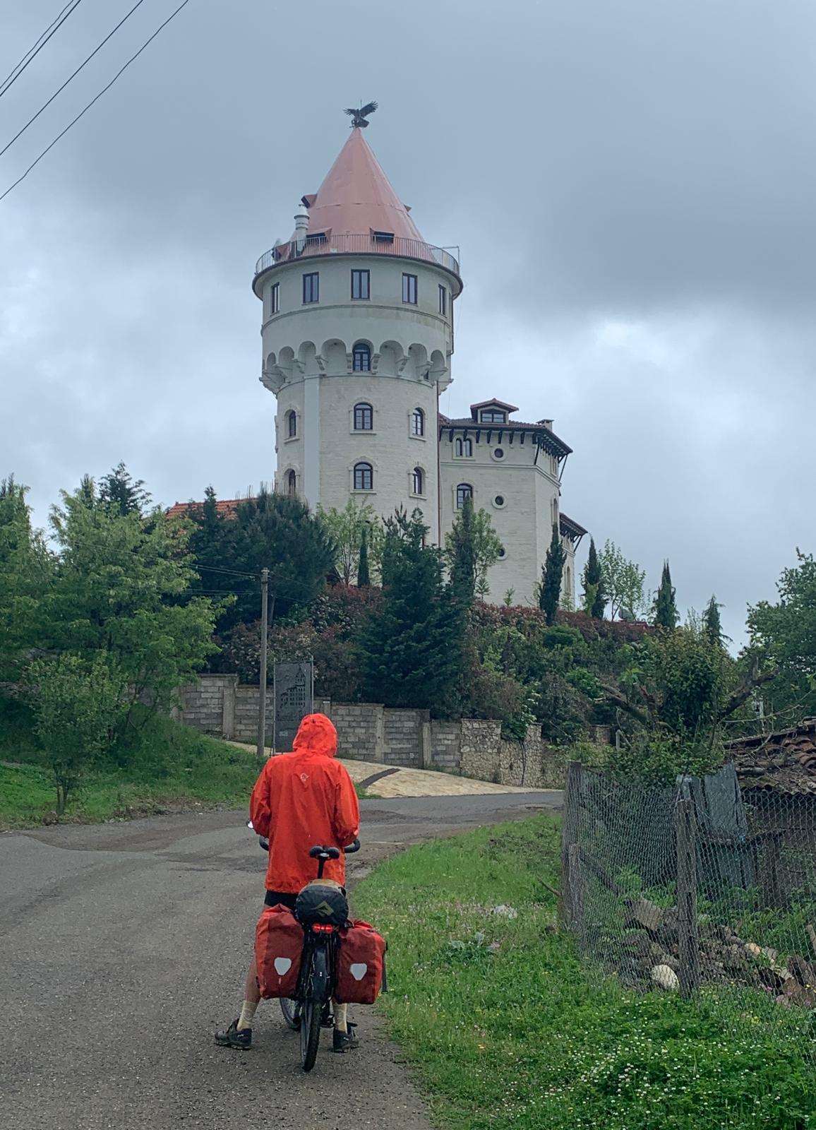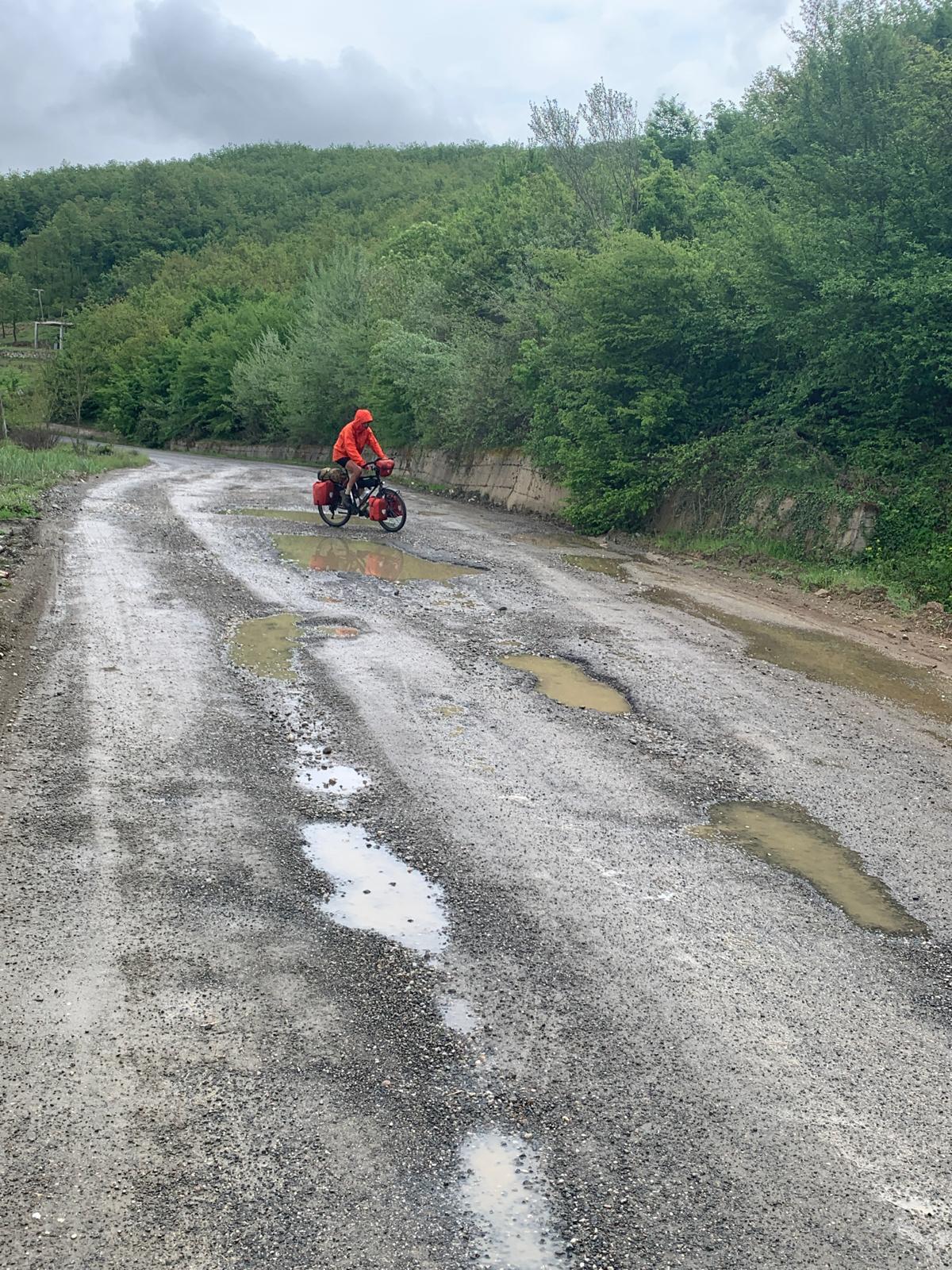 Nous continuons à nous enfoncer dans l’Albanie profonde, les routes sont vraiment défoncées. Les fermes que nous croisons ont l’air assez pauvre, quelques arpents cultivés, une ou deux vaches, quelques chèvres, trois poules et c’est tout. Au vu des réservoirs qui surplombent la plupart des maisons en dehors des villages, on en conclut qu’ils n’ont pas l’eau courante. Et les albanais sont toujours aussi chaleureux, je ne sais pas si c’est parce que nous avons des bonnes montées aujourd’hui et qu’en plus nous nous prenons quelques rincées, mais tout le monde nous klaxonne et nous acclame, on se croirait parfois sur le tour de France ! Ce matin au petit déjeuner de notre hôtel nous avons eu du chai. Très bien mais il était salé ?!? Très surprenant, nous ne savons pas si c’est une habitude locale (rien vu sur internet) ou simplement que la patronne a confondu sel et sucre …