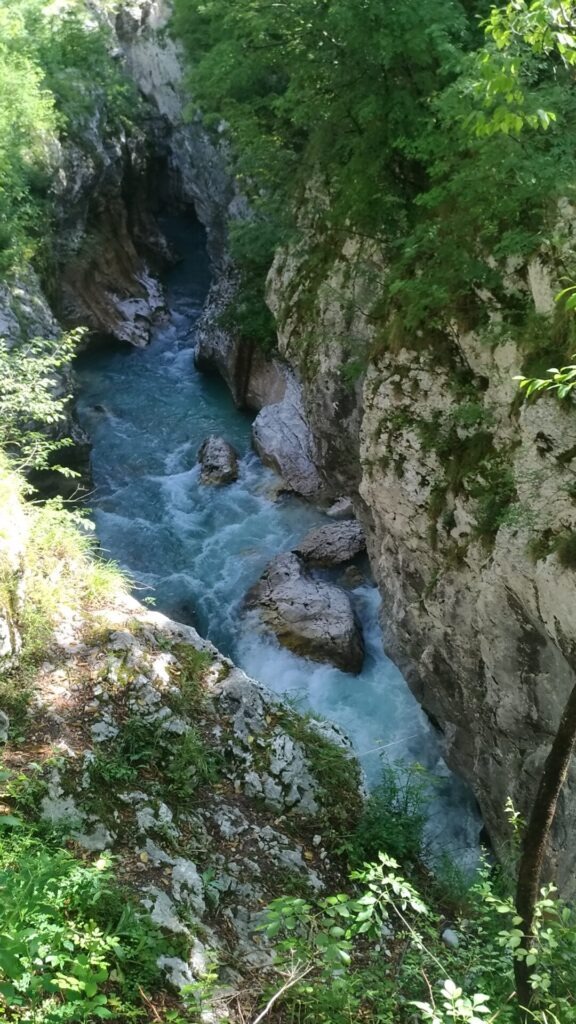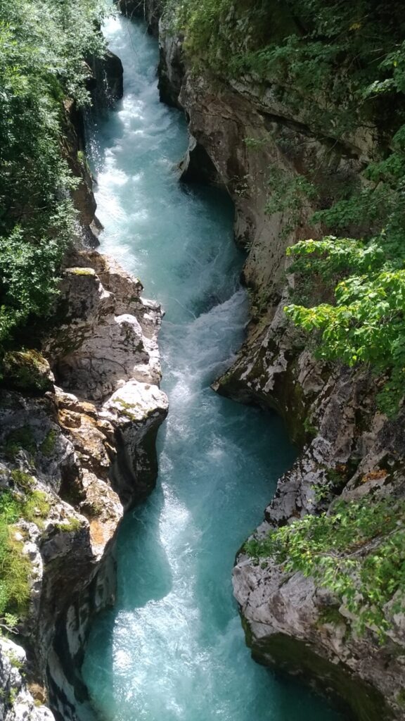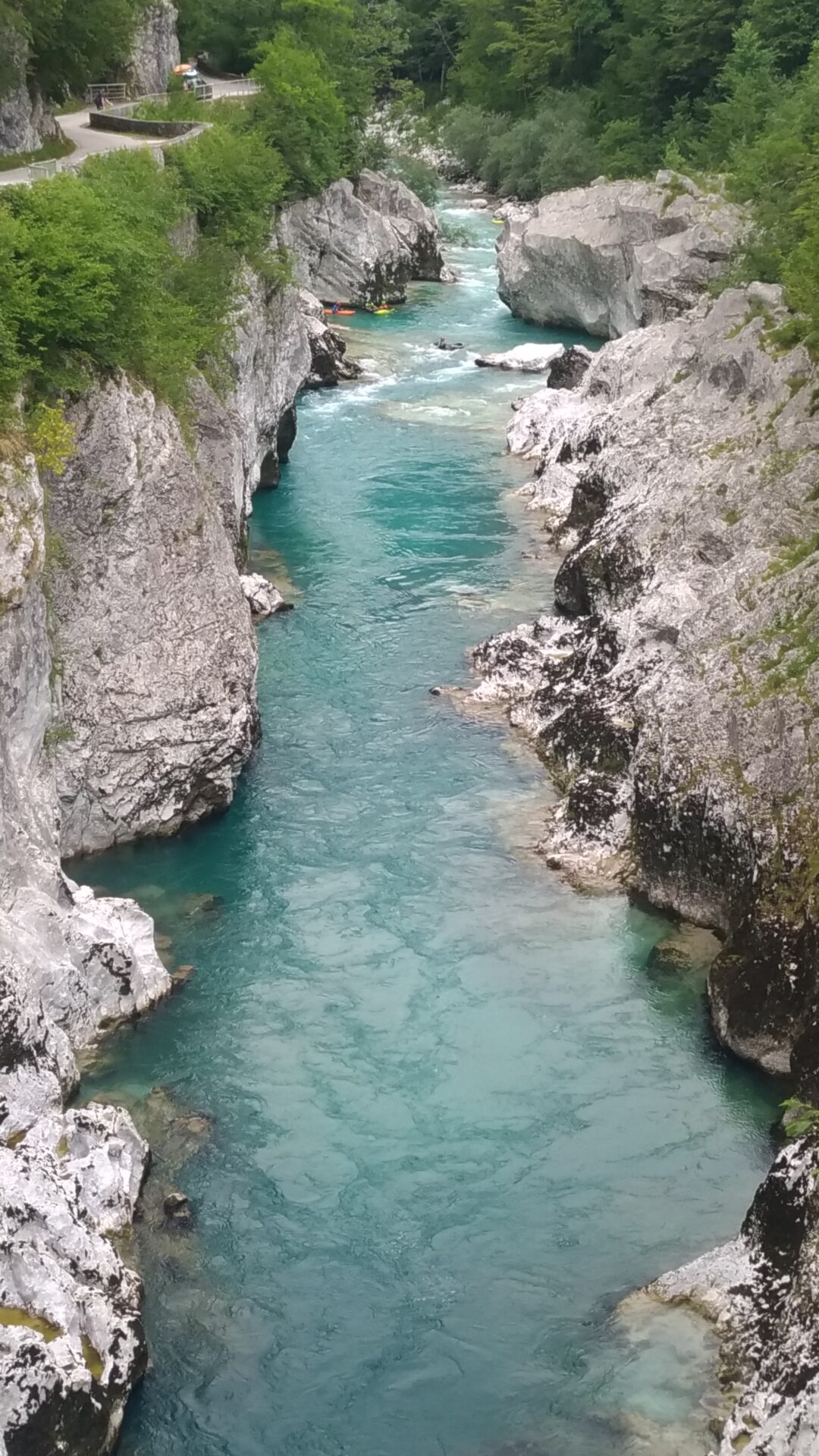 Nous arrivons rapidement près de la célèbre rivière Soca. Sa couleur émeraude vient des particules de roche en suspension dans l’eau, qui réfléchissent davantage le bleu et le vert. C’est la mecque des activités aquatiques, canyonning, kayak, raft. Nous croisons beaucoup d’autrichiens, croates, hongrois, tchèques et slovaques. Les gorges sont superbes.