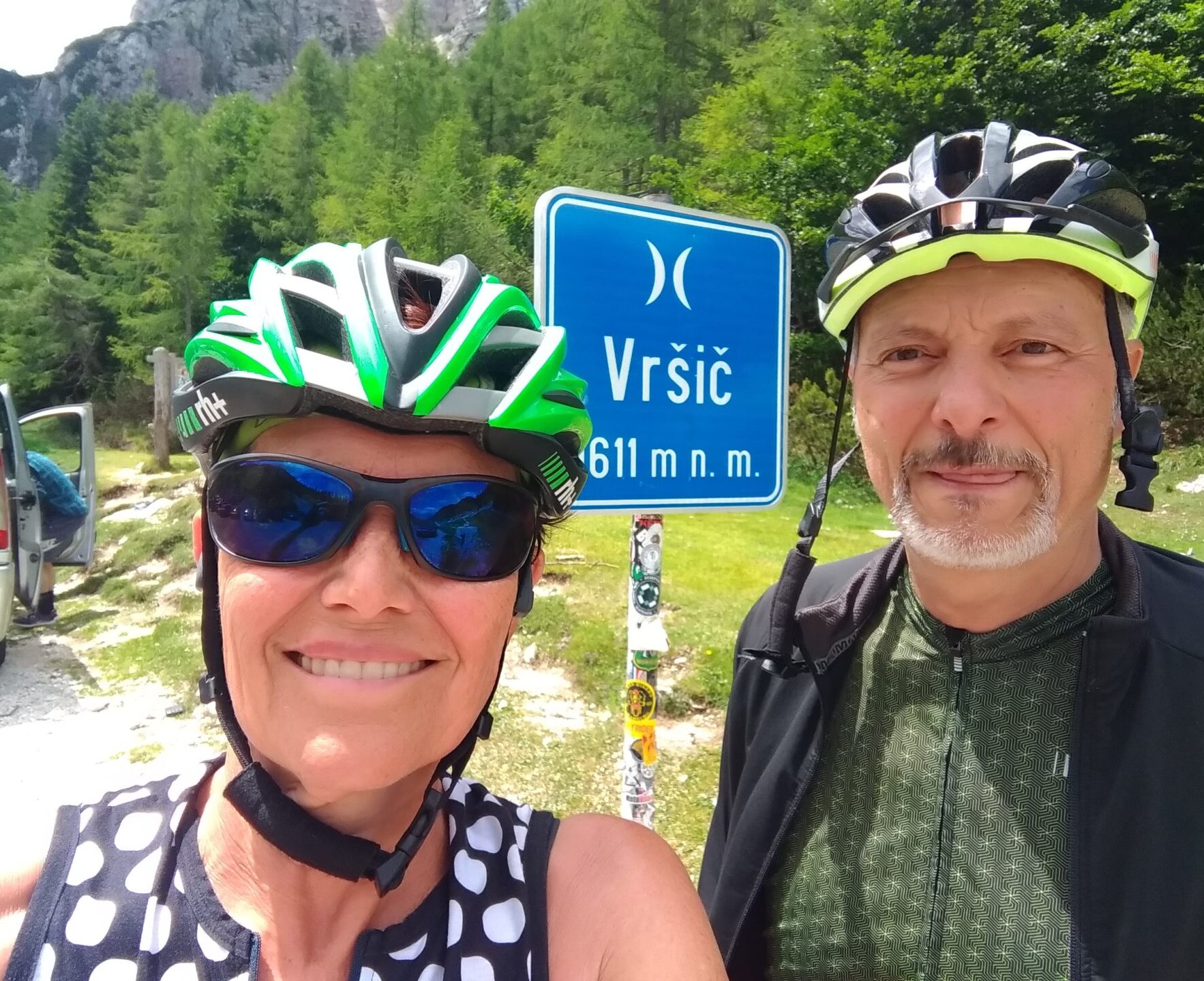 Nous arrivons pour notre première nuit à Bovec, juste avant un méga orage de montagne, il doit y avoir un dieu pour les cyclistes. Nous sommes dans un gite sympa plein de montagnards, et kayakistes. Le lendemain, nous attaquons le col de Vrsic, prononcez « Veursitche ». En fait pour prononcer le Slovène, il suffit de rajouter des voyelles là où elles manquent. La pente est en moyenne à 8%, pas de problème on a l’habitude, mais le final est plutôt à 15%. Doum n’apprécie pas trop la fin.