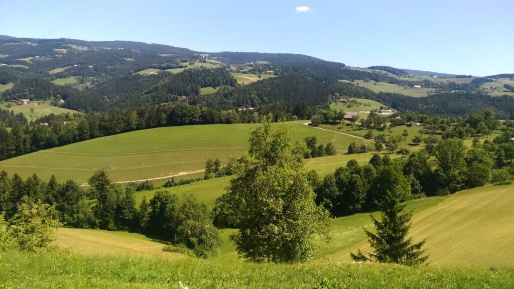 Prochaine étape Maribor, cette fois nous roulons sur des petites routes sympas. Nous remontons une vallée avec de belles maisons et de beaux jardins. Etonnant, quand la vallée devient étroite avec des gorges, on tombe sur des mini usines/ateliers de métallurgie qui doivent exploiter l’énergie hydraulique. Mais ça ne gâche pas le paysage verdoyant. Il fait chaud on atteint les 38°C.