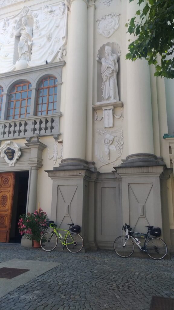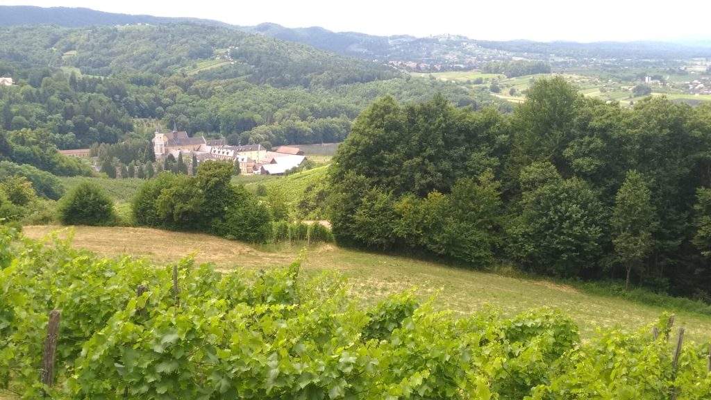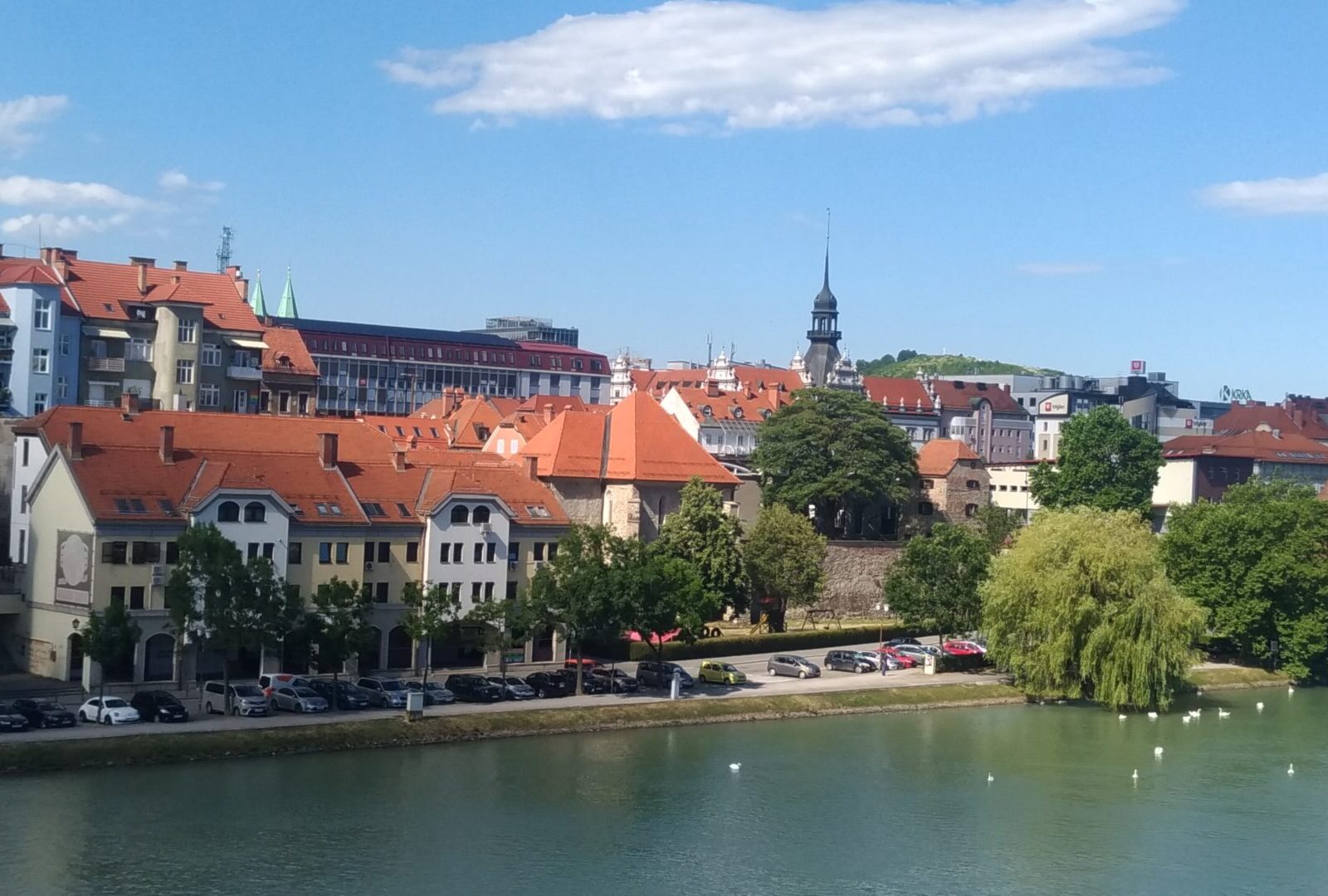 Après le pique-nique, la petite route sympa se transforme sans prévenir en piste de plus en plus raide, puis se transforme en single de type trial. Nous n’avons pas vraiment les vélos pour ça, et Doum n’apprécie pas vraiment. Nous continuons en poussant le vélo jusqu’à trouver une autre piste plus praticable, qui semble aller dans la bonne direction. On arrive à un col et on commence à descendre toujours sur la piste. On finit par tomber sur la bonne vallée et sur une route goudronnée, fin de l’épisode. Nous arrivons à Maribor très belle ville, dont l’architecture vient de son passé austro-hongrois.