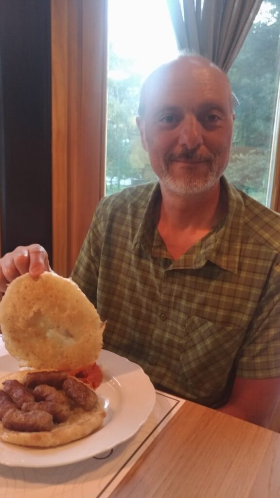 La descente dans le massif du Triglav est superbe, malgré les premières épingles pavées qui secouent un peu. Nous buvons un coup au bord du lac dans la station de Kranjska Gora. Je teste une très bonne boisson aux herbes, le Cokta, sorte de Coca local. Nous arrivons le soir dans un petit chalet sympa à Mojstrana. Le soir on déniche un petit restau local bien planqué où j’ai droit à une spécialité slovène, les ravioles à la carpe, je me régale !