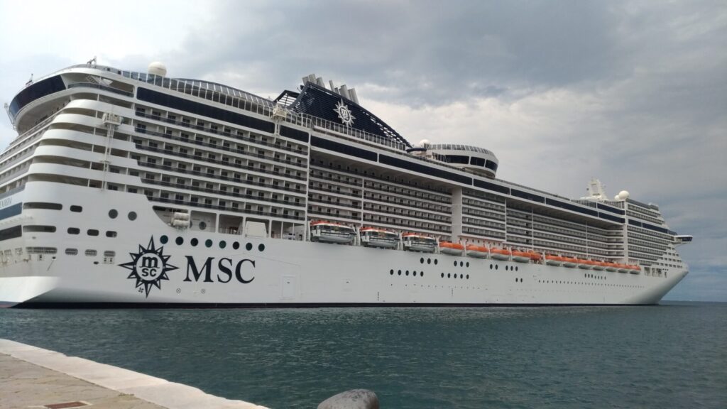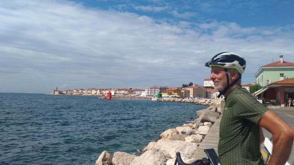 Après Piran, la dernière étape pour rejoindre notre voiture à Gorica. Nous suivons des pistes cyclables sympas le long de la côte, puis nous rejoignons Trieste. Cette grande ville est un peu compliquée à traverser à vélo. Les italiens dans cette ville roulent comme des fous. Dans un carrefour, j’entends crier Doum, une voiture fonce sur moi, je pile et je l’évite de justesse. Nous arrivons au centre piétonnier, vraiment très beau. Mais notre attention est attirée par 2 espèces d’immeubles flottants de plus de 10 étages. Ces bateaux de croisières sont énormes. Nous finissons par quitter Trieste pour repartir dans la campagne. J’ai choisi une sorte de raccourci, une route pavée qui monte pas mal, puis se termine en une rampe de 20% pendant plus d’un kilomètre. Logiquement, Doum finit en poussant le vélo, et m’informe que j’aurais pu choisir une autre route :-). Nous repassons une 2ème frontière pour revenir en Slovénie en suivant une piste cyclable sur une ancienne voie de chemin de fer. Nous finissons par arriver à Goriza notre point de départ. Fin du voyage. Ce tour nous a donné envie de revenir dans ce pays, plutôt du côté de la Soca et du massif du Triglav, au moins pour faire ce que tout Slovène est tenu de faire une fois dans vie : gravir le sommet du Triglav, point culminant de la Slovénie.