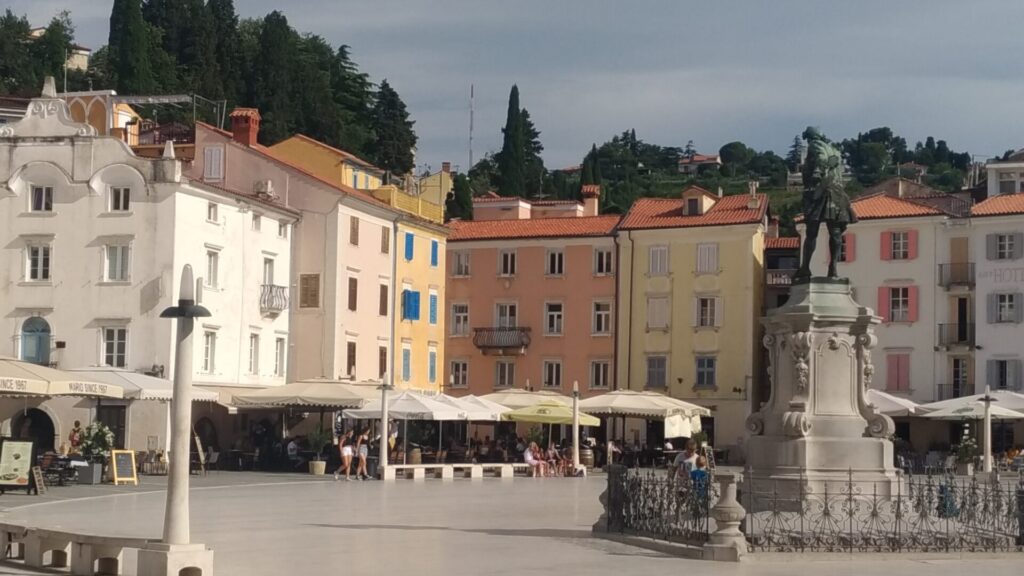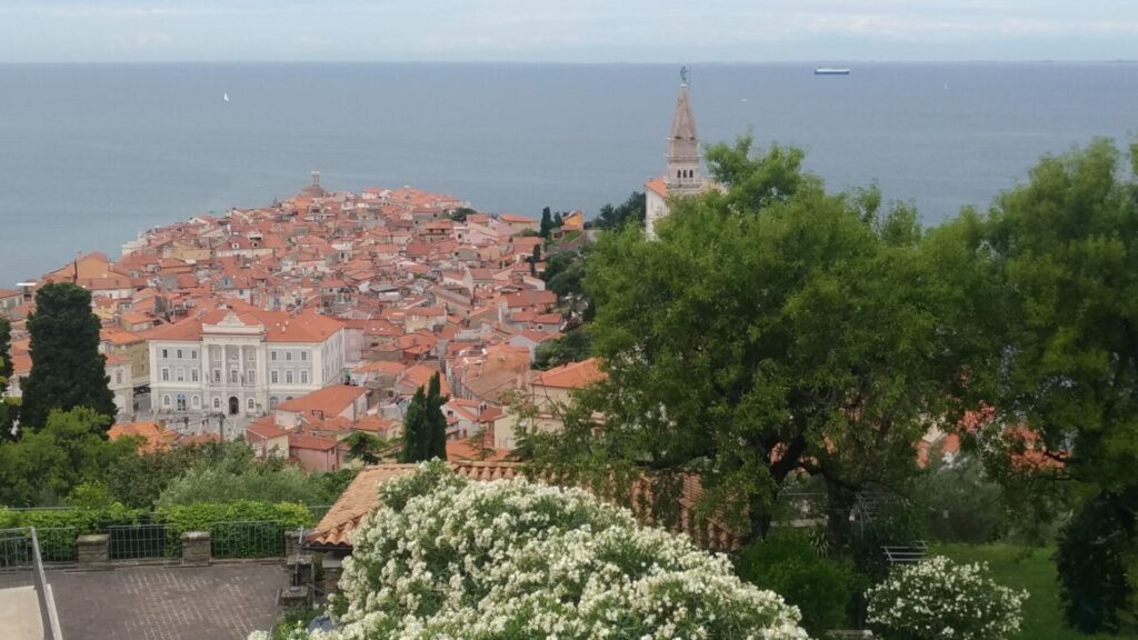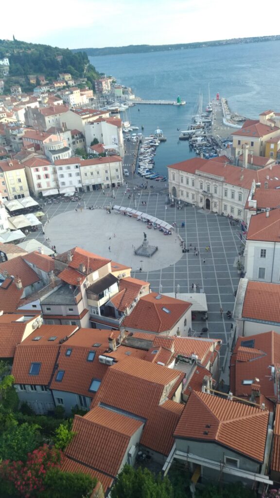 Prochaine étape Piran, au bord de la méditerrannée où nous allons passer 2 jours pour profiter de la mer. Le style et le climat sont très différents de l’intérieur des terres, on est plutôt en Italie. Nous faisons les touristes pendant notre journée de repos : baignade, restau et visite du chateau tout en haut de la ville.