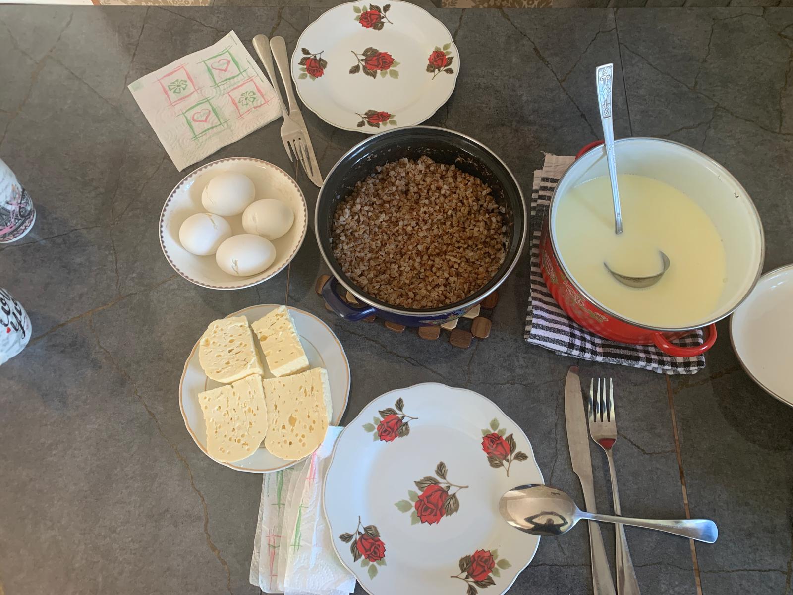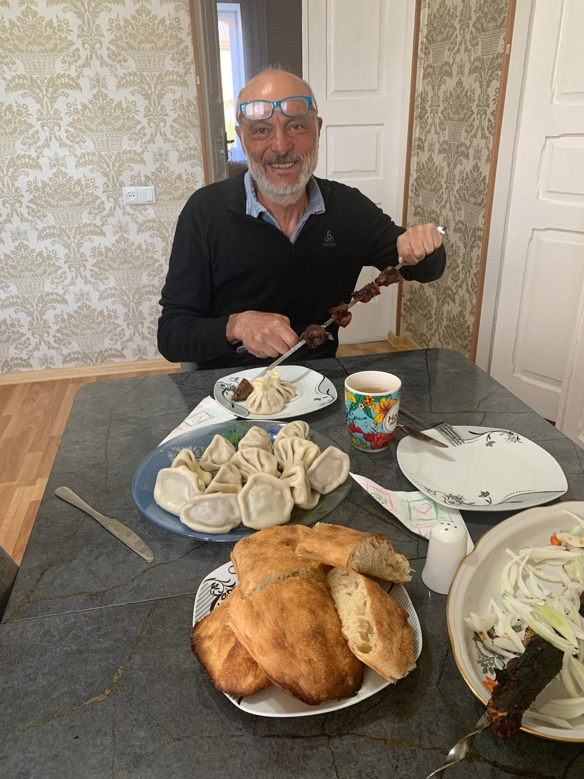 A Tsalka, nous sommes vraiment chez l’habitant dans une grande maison confortable. Le soir il faut mettre le chauffage. Apparemment, ce n’est pas le cas en France en ce moment ! Le petit déjeuner est typiquement géorgien, un peu surprenant pour nous, mais ça cale. Des œufs, du fromage qui ressemble à du lait caillé un peu vieux, du lait frais et de la graine, genre boulgour. Pour les autres repas par contre, nous nous régalons avec les spécialités emblématiques de la Géorgie, kachapuri (une sorte de pain au fromage et oeuf en option) et surtout khinkali (des gros raviolis avec viande et jus et une technique particulière pour récupérer le jus). Il existe beaucoup d’autres spécialités, mais nous ne sommes là que depuis deux jours.