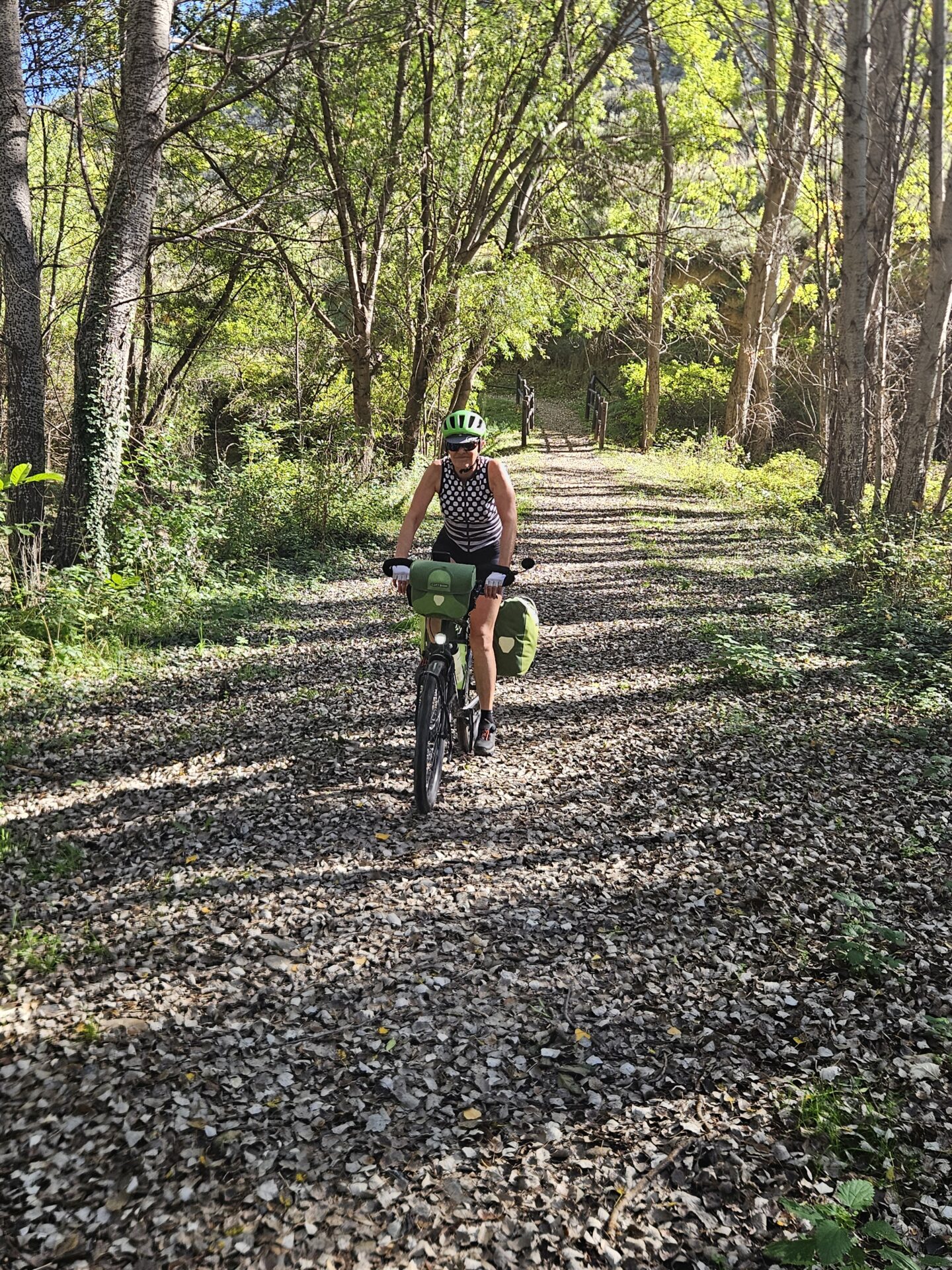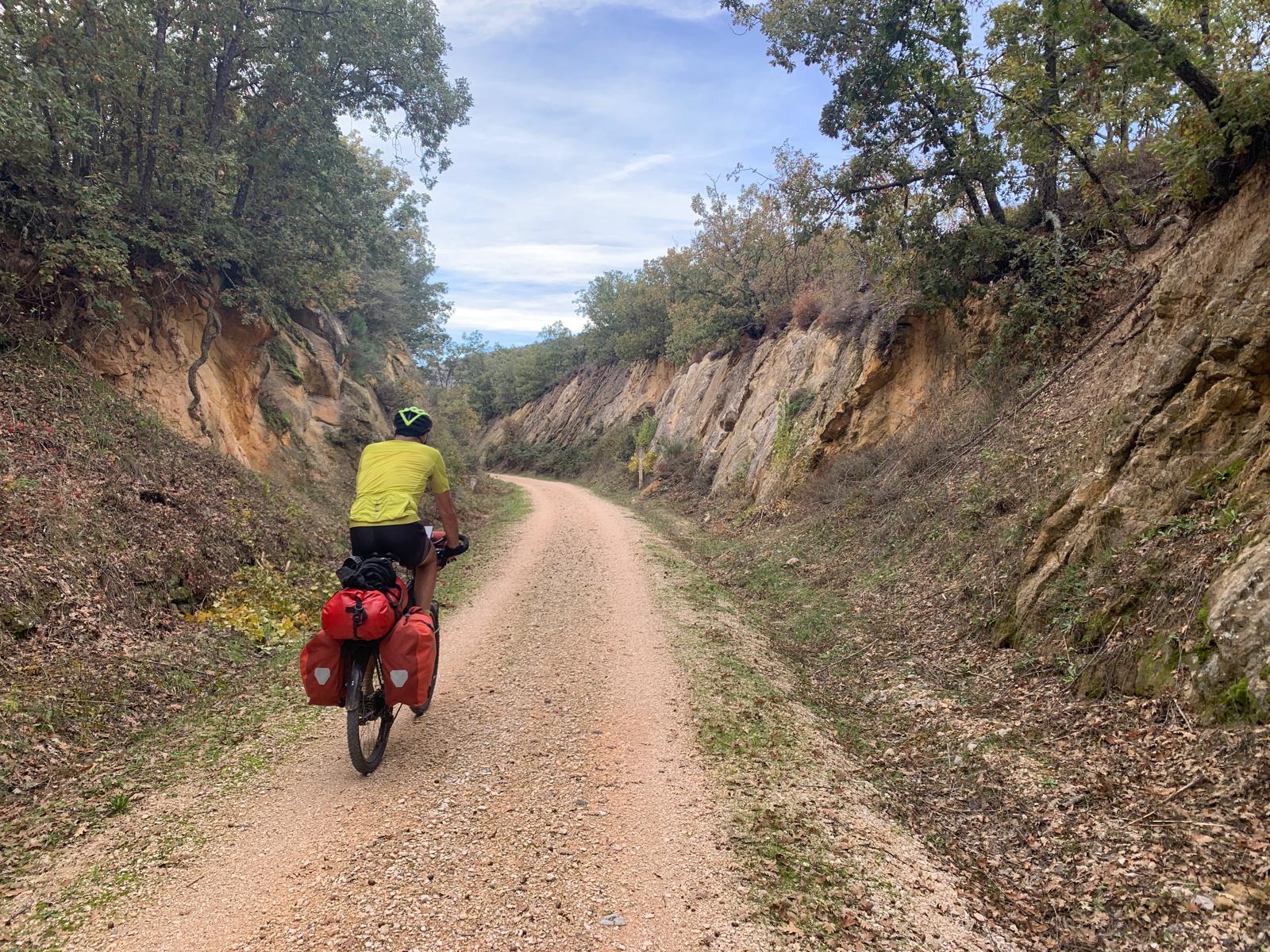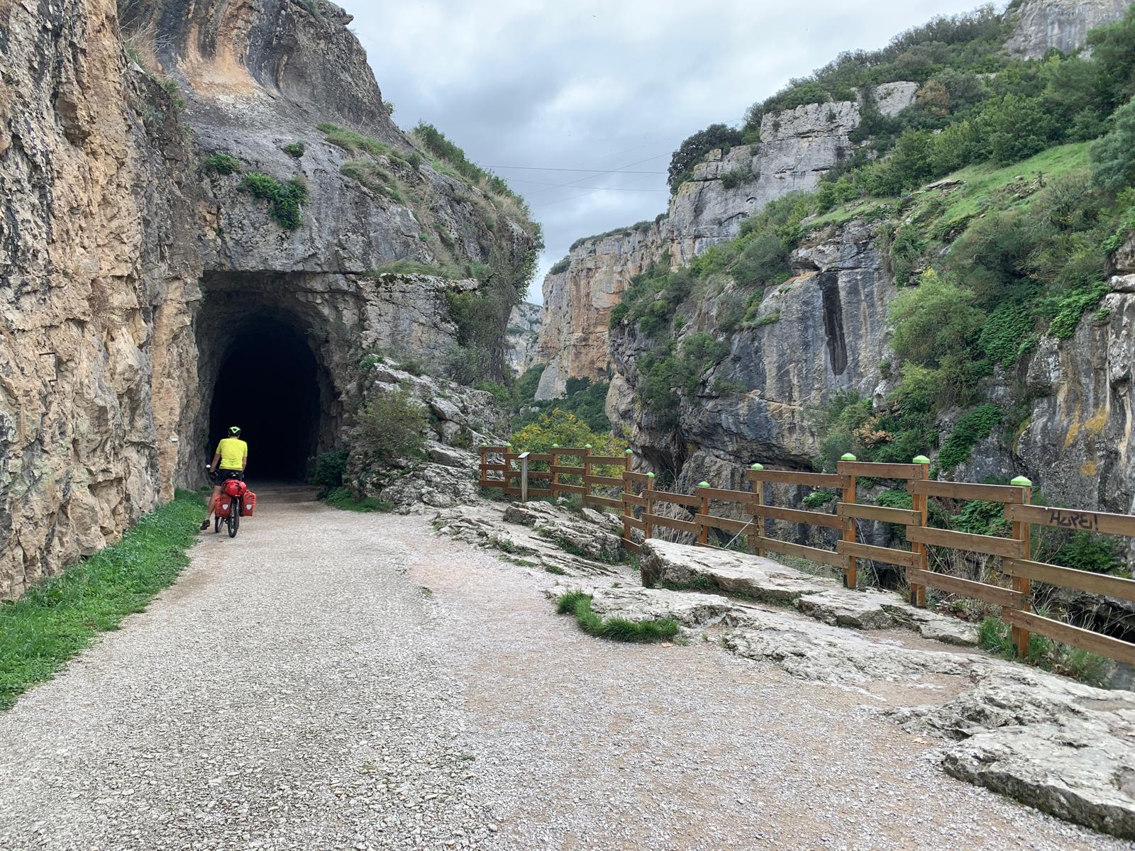 Pour le deuxième jour en Espagne, j’ai vu un peu trop grand. Avec une bonne partie en descente, on peut augmenter le nombre de kilomètres, mais il y avait finalement pas mal de montées aussi et la pluie fait son retour, avec en prime un bon vent de face. On arrive au petit village de Sofuentes, après 90 kilomètres, un peu cuits. On a quand même bien apprécié le passage dans les gorges du Foz de Lumbier, sur une ancienne voie de chemin de fer.
