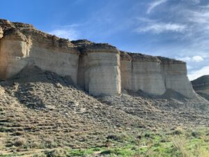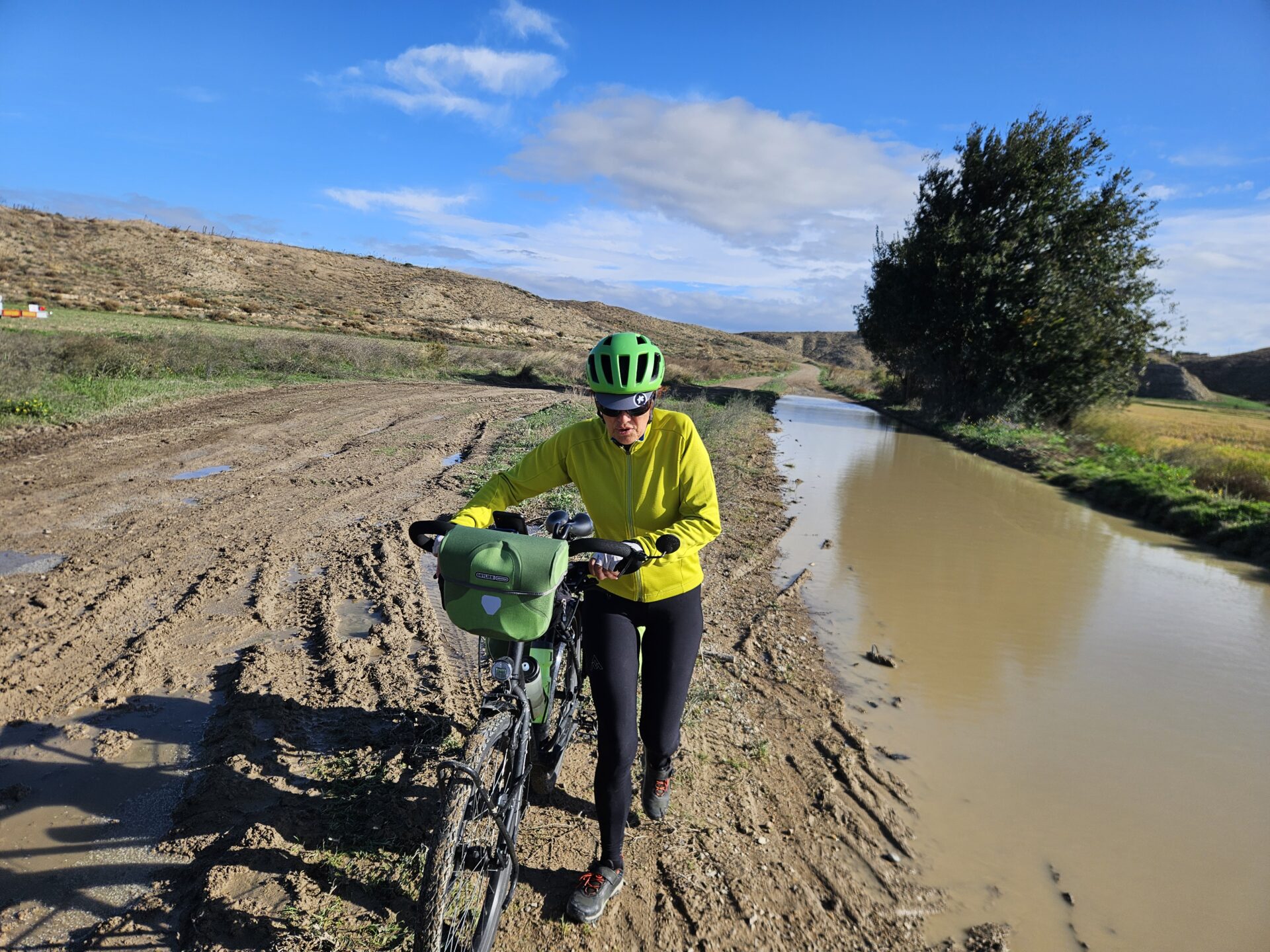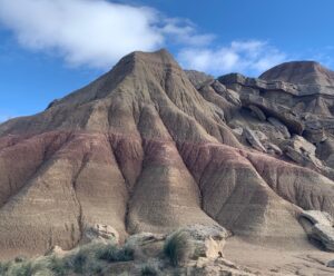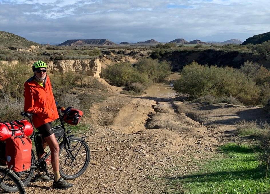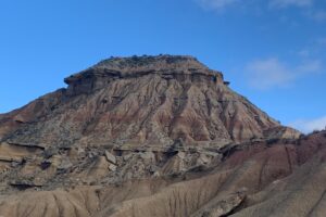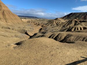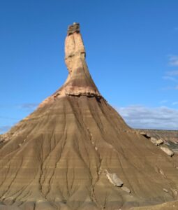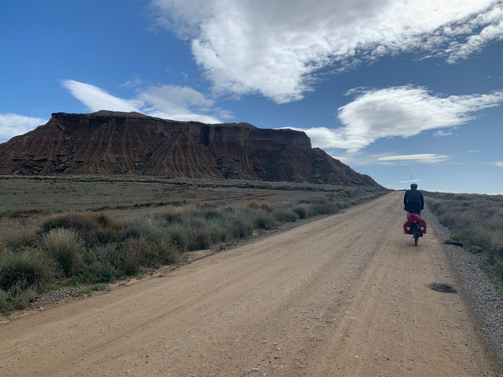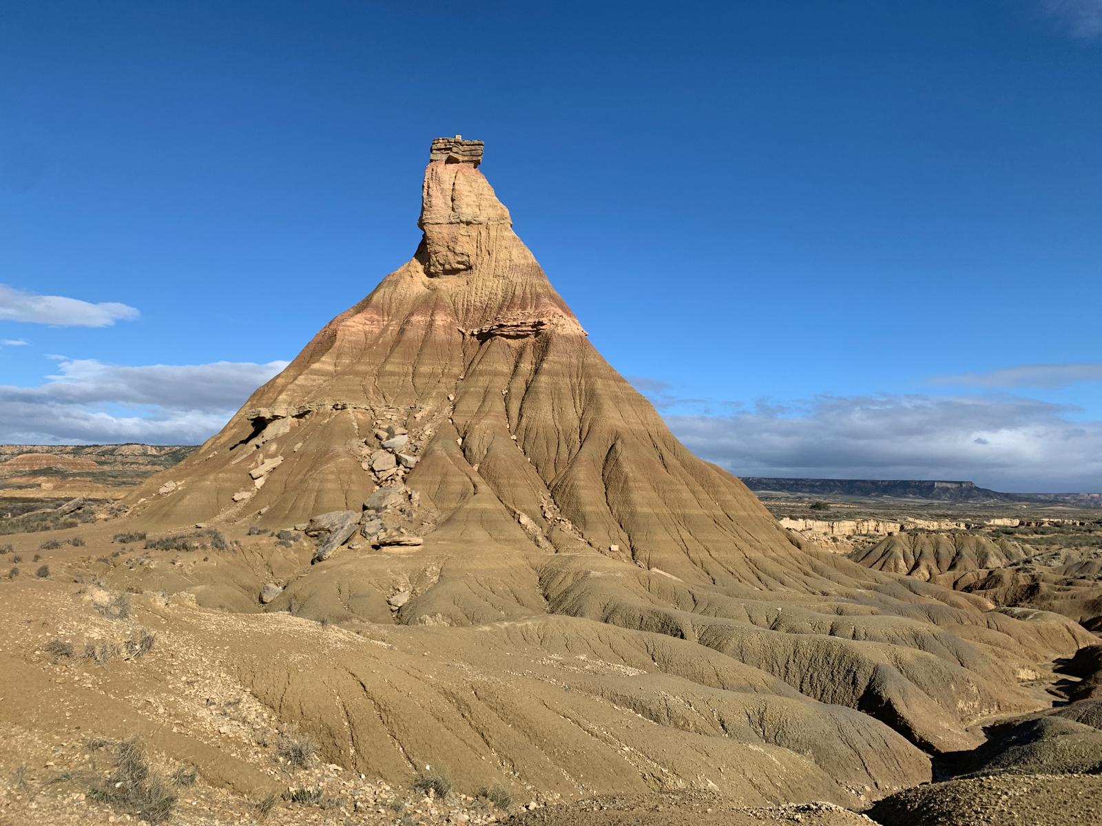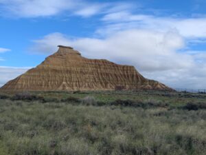 La météo finit par s’améliorer, nous allons quand même faire une petite boucle dans les Bardenas. Nous avons besoin de deux tentatives pour rentrer au coeur du désert. La première se termine quand il faut traverser une rivière de boue glaiseuse. La deuxième tentative est la bonne, nous rejoignons quelques groupes de cyclistes en ballade. Nous arrivons au pieds d’un monticule emblématique des Bardenas le Castildetierra. C’est le même principe d’érosion que les cheminées de fée. La zone est vraiment désertique, on comprend bien que des westerns aient été tournés par ici.